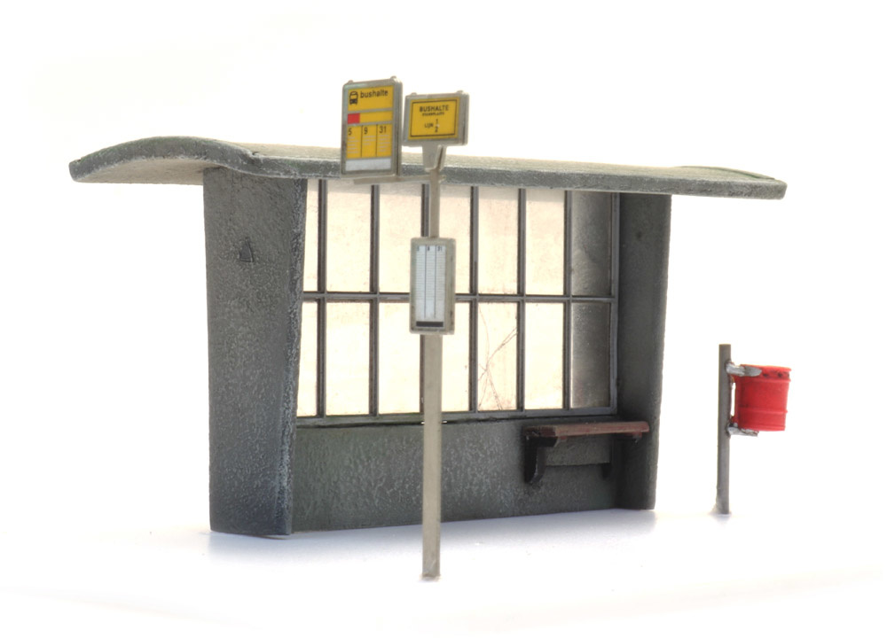 Artitec H0 387.453 Bushokje beton met halteborden en vuilnisbak kant en klaar resin, geverfd - Modeltreinshop Artitec H0 387.453 Bushokje be...