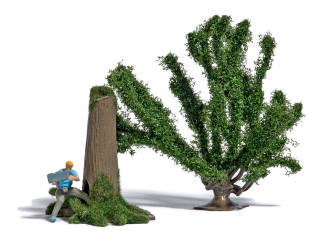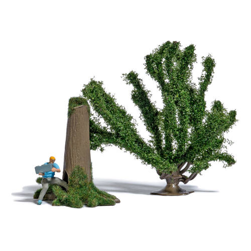 Geocacher met vondst (schatkist) uit de geheime schuilplaats (cache) in de boomstam. Inclusief bemoste boomstam en struik.
