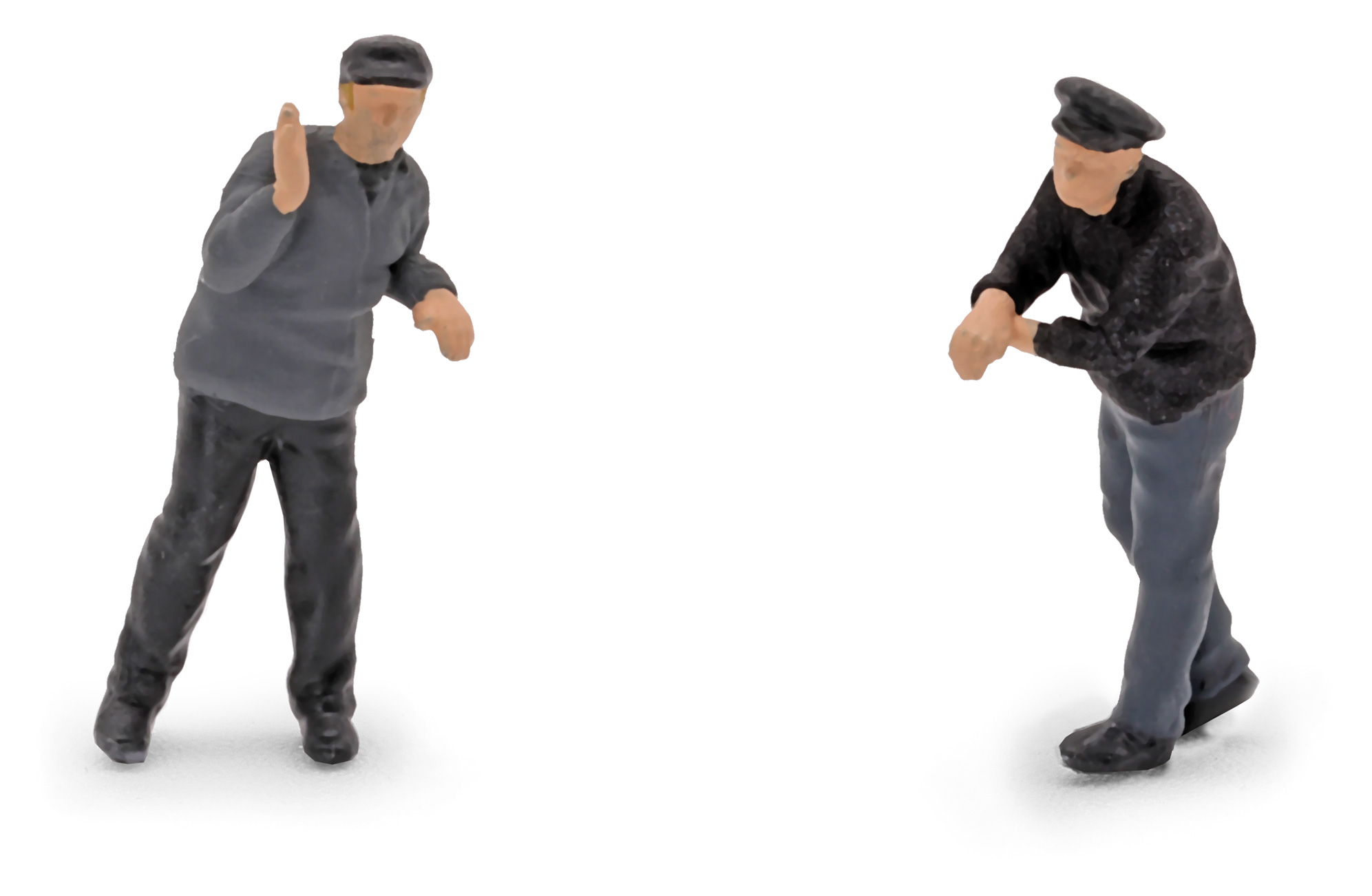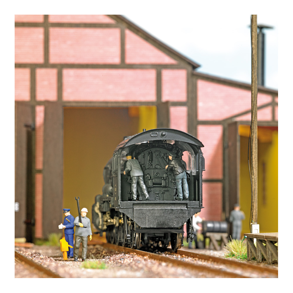 Twee staande figuren, een machinist en een stoker, in typische werkhoudingen in een stoomlocomotief.Â
