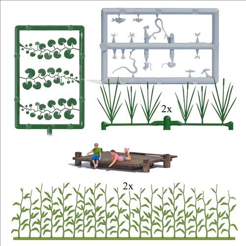 Set met 2 kinderen, bootsteiger van echt hout, waterplanten (sets voor waterlelies en diverse grassen) en kleine dieren (om zelf te beschilderen).
