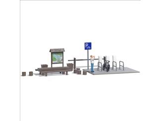 Set met fietsfiguur, e-bike, fietsenstalling met 3 laadstations, 4 leunstangen en bord, evenals een houten tafel met 2 banken, 6 houten haringen, afgedekt informatiebord, houten slagboom en 2 prullenbakken voor het ontwerpen van een fietspad.