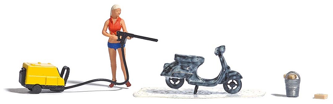 Actieset voor de realistische animatie van uw modelwereld. Ingezeepte scooter op foamlap, hogedrukreiniger, emmer, sponzen en vrouwenfiguur.