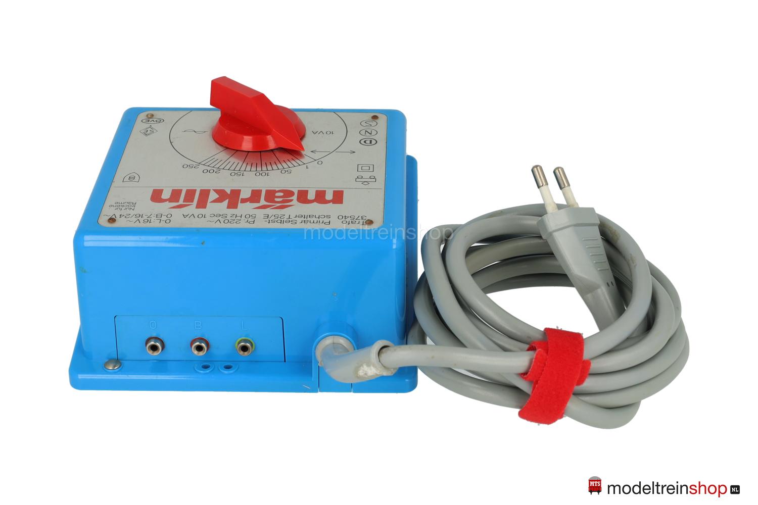 Leistung 10 VA. Blaues Blechgehäuse, roter Zeigerknopf für Geschwindigkeitsregelung und Fahrtrichtungsumschaltung, drei Anschlußbuchsen.