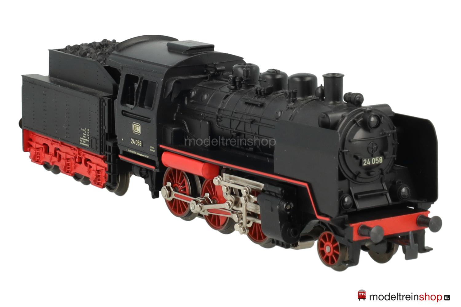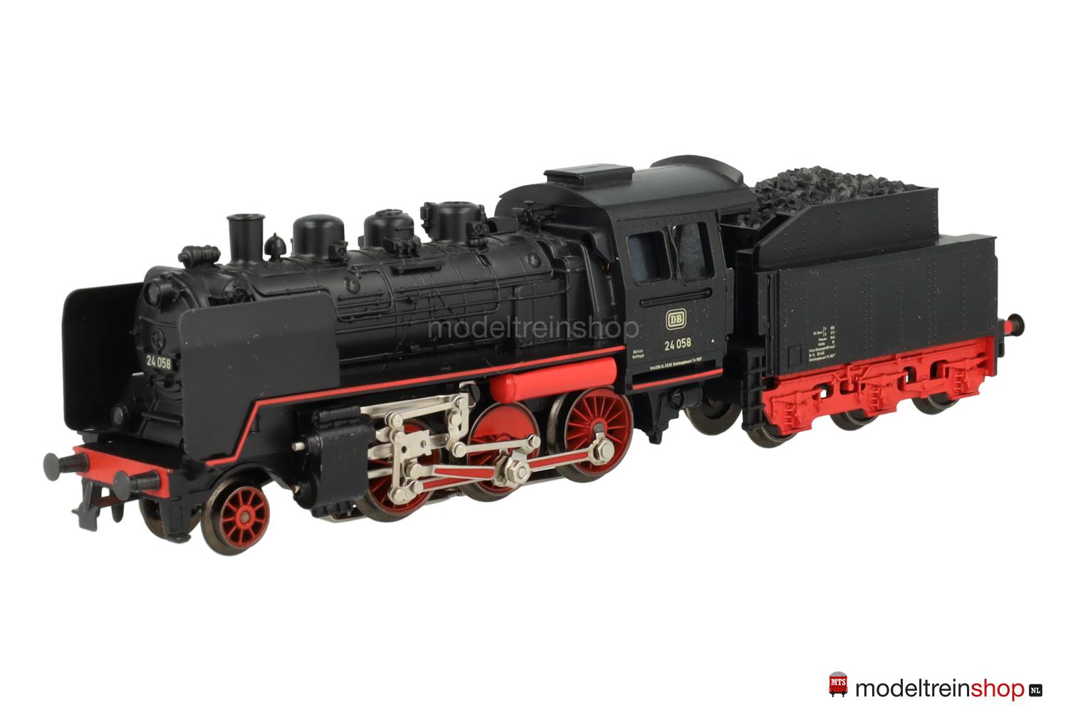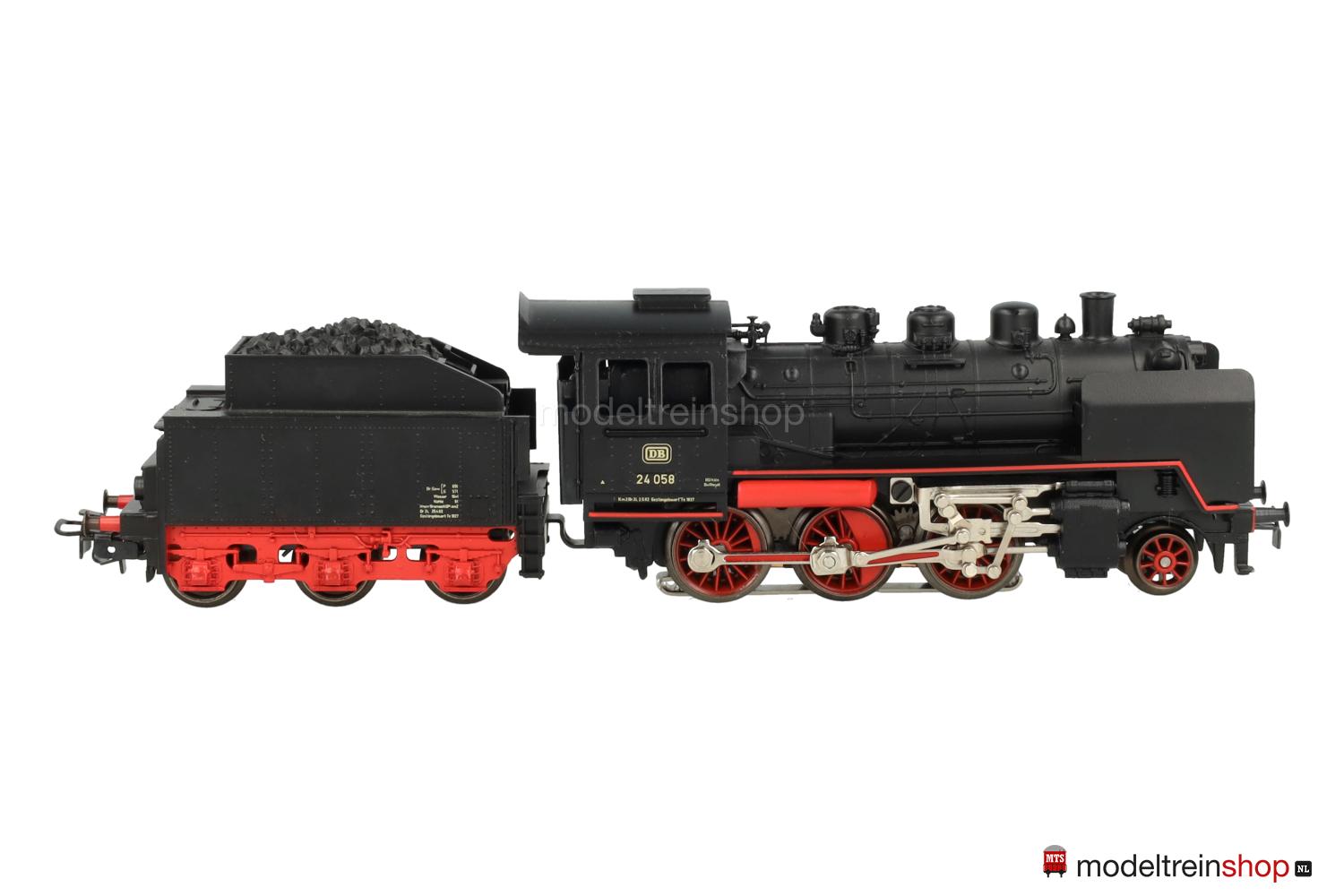Treibräder mit kleinen geraden Gewichten, Vorlaufräder mit 6 Speichen, auf den Zylindern erhabene “Märklin”-Embleme. Zweilicht-Spitzensignal vorne, an den Führerstandsseiten erhabene Aufschriften: “FM 800”, “MÄRKLIN” und Betriebs-Nr.: 24 058 sowie zwei erhabene unbeschriftete Flächen, Handschalthebel. Tender mit roten Speichenrädern und erhabener Aufschrift “FM 809”.