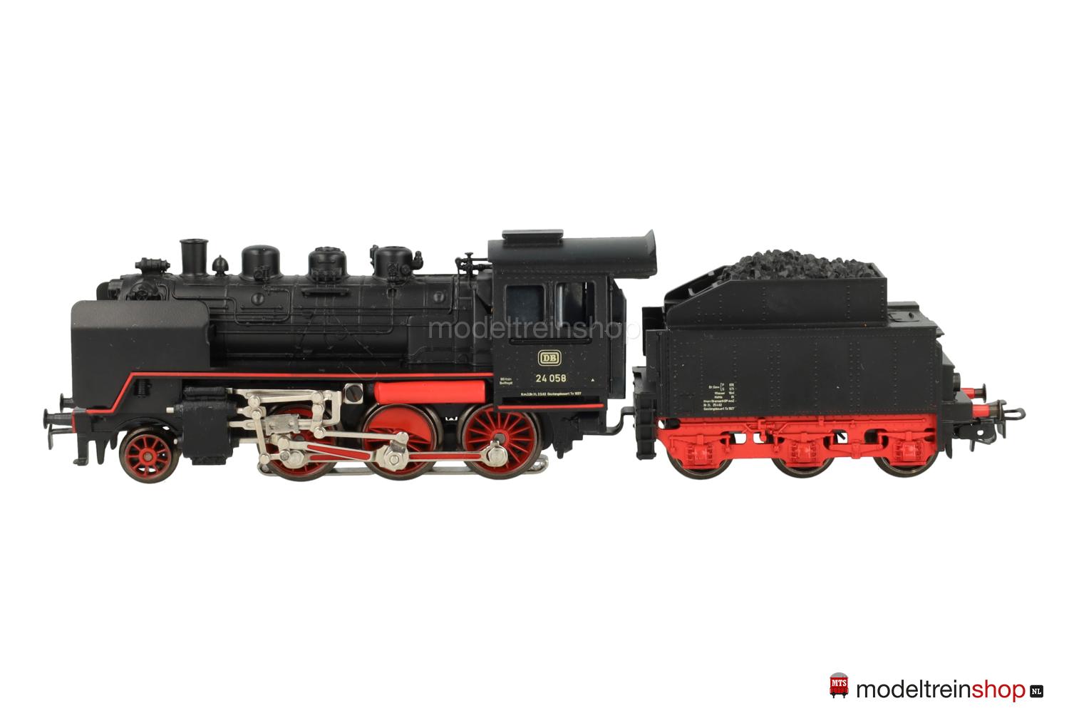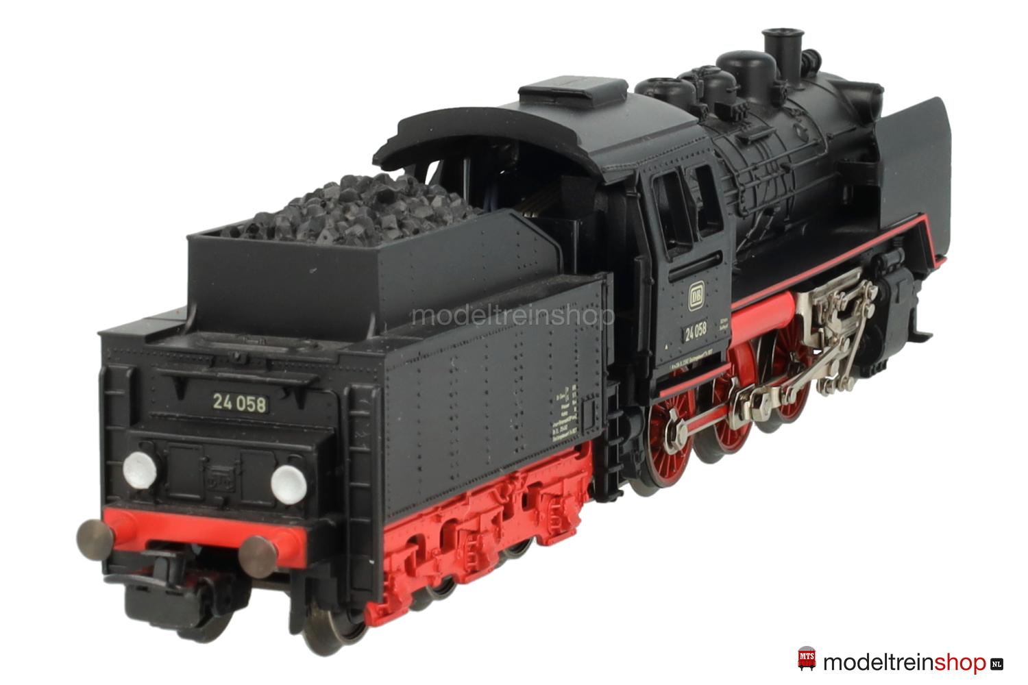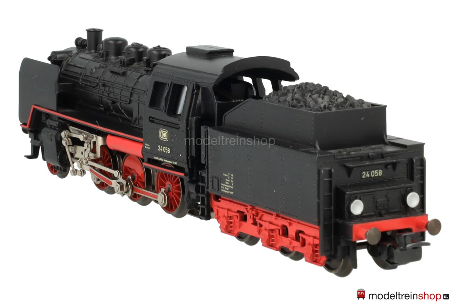Treibräder mit kleinen geraden Gewichten, Vorlaufräder mit 6 Speichen, auf den Zylindern erhabene “Märklin”-Embleme. Zweilicht-Spitzensignal vorne, an den Führerstandsseiten erhabene Aufschriften: “FM 800”, “MÄRKLIN” und Betriebs-Nr.: 24 058 sowie zwei erhabene unbeschriftete Flächen, Handschalthebel. Tender mit roten Speichenrädern und erhabener Aufschrift “FM 809”.