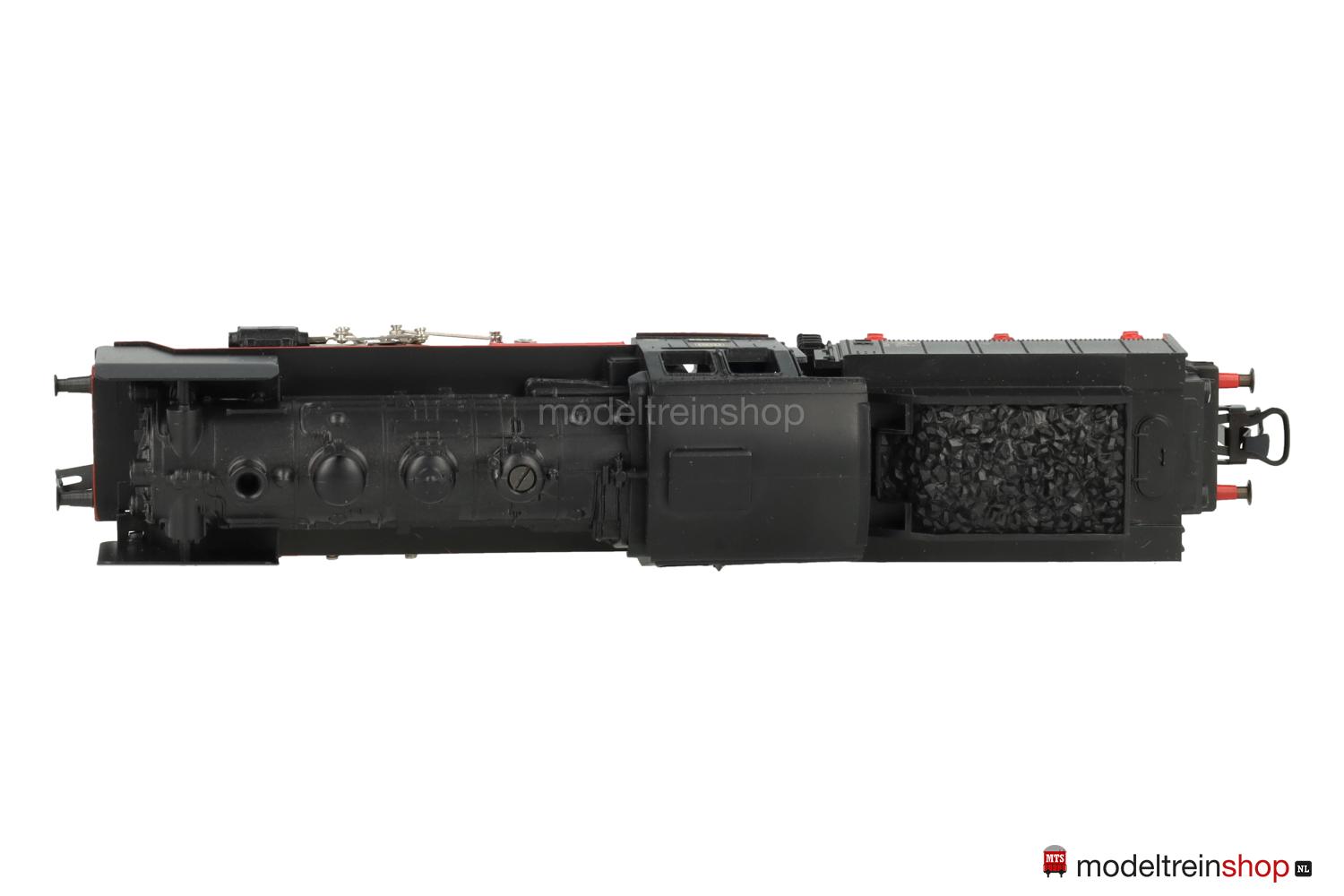 Achsfolge 1′ C. Schwarzes Gußfahrgestell, drei angetriebene Achsen. Schwarzes Kunststoffgehäuse, Wagner-Windleitbleche, Spitzensignal vorne. Dreiachsiger Kunststoff-Tender (3 T 16).