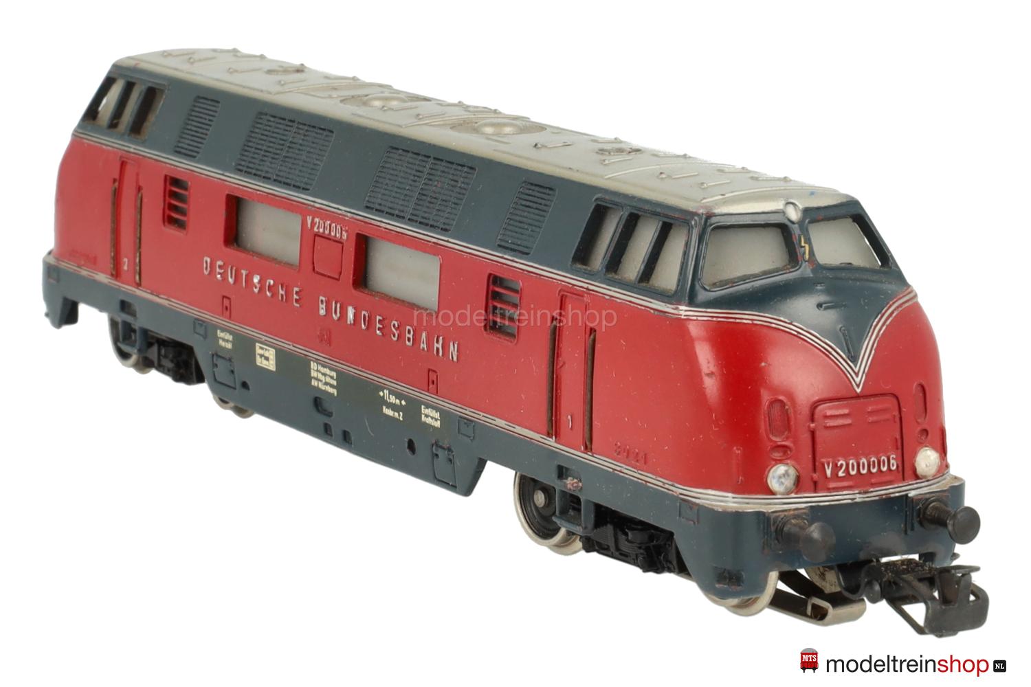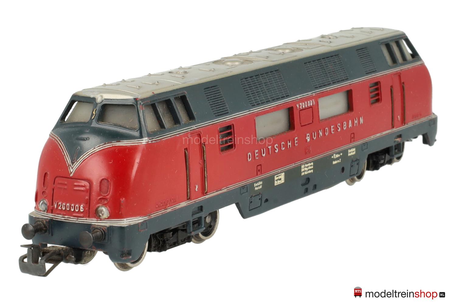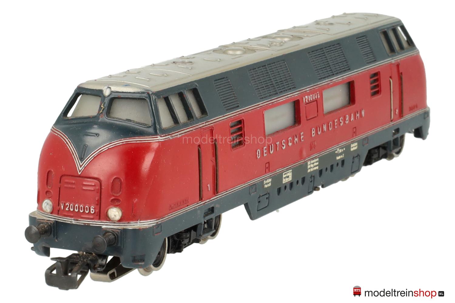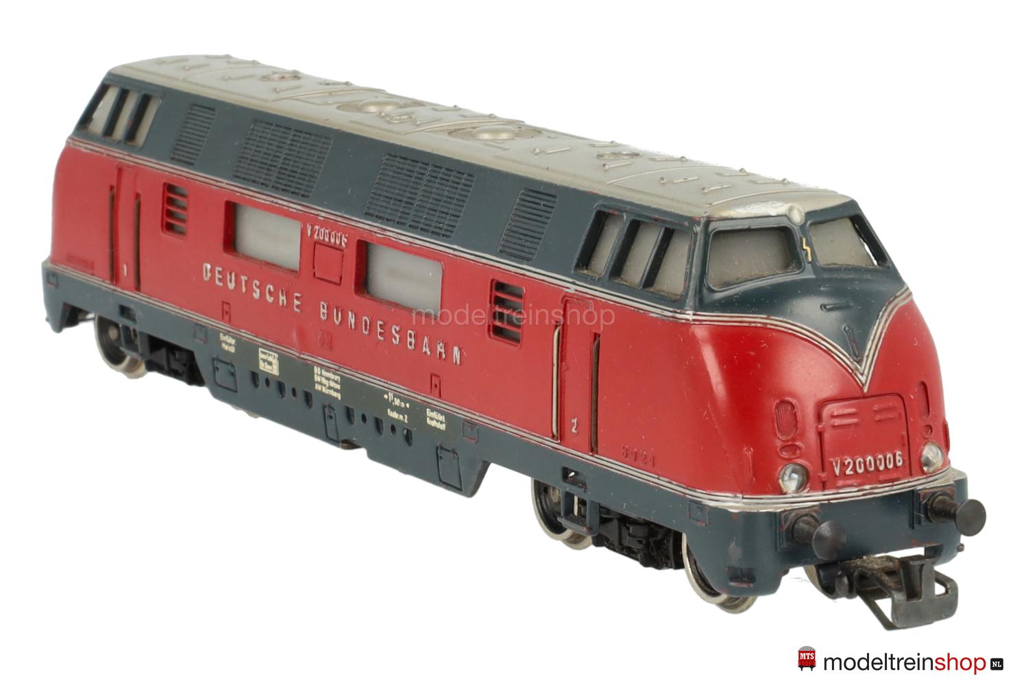 Zweilicht-Spitzensignal beidseitig, geschlossene Lüftergitter, einteilige umlaufende Zierstreifen, erhabene weiße Aufschriften: “3021”, “MÄRKLIN” (je 2 x), “Deutsche Bundesbahn”, Betriebs-Nr.: V 200 006 auf Längs- und Stirnseiten, erhabene “Märklin”-Embleme, gerade Seite der Türen zur Lokmitte hin angeordnet, Rahmenbeschriftung = Schiebebilder