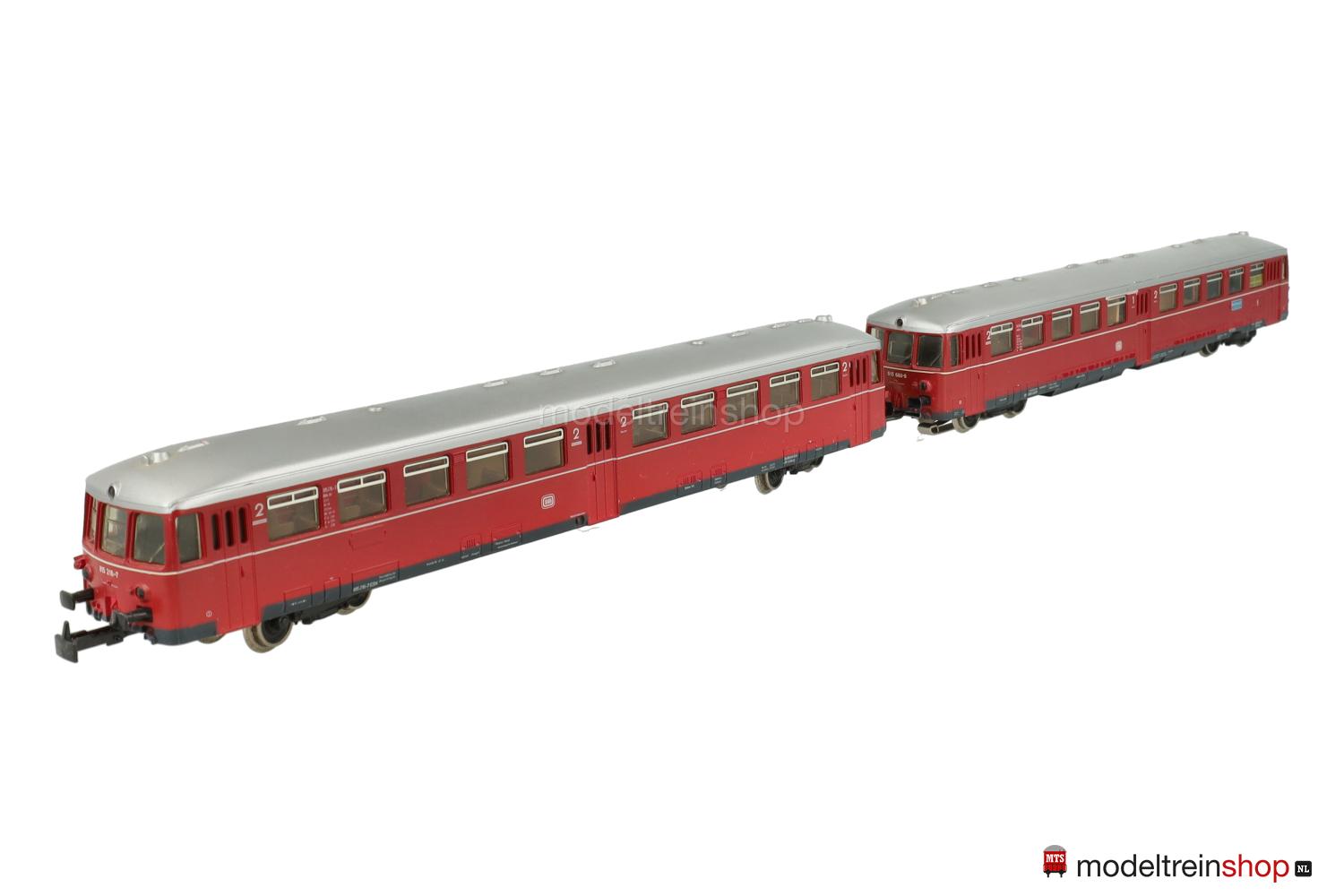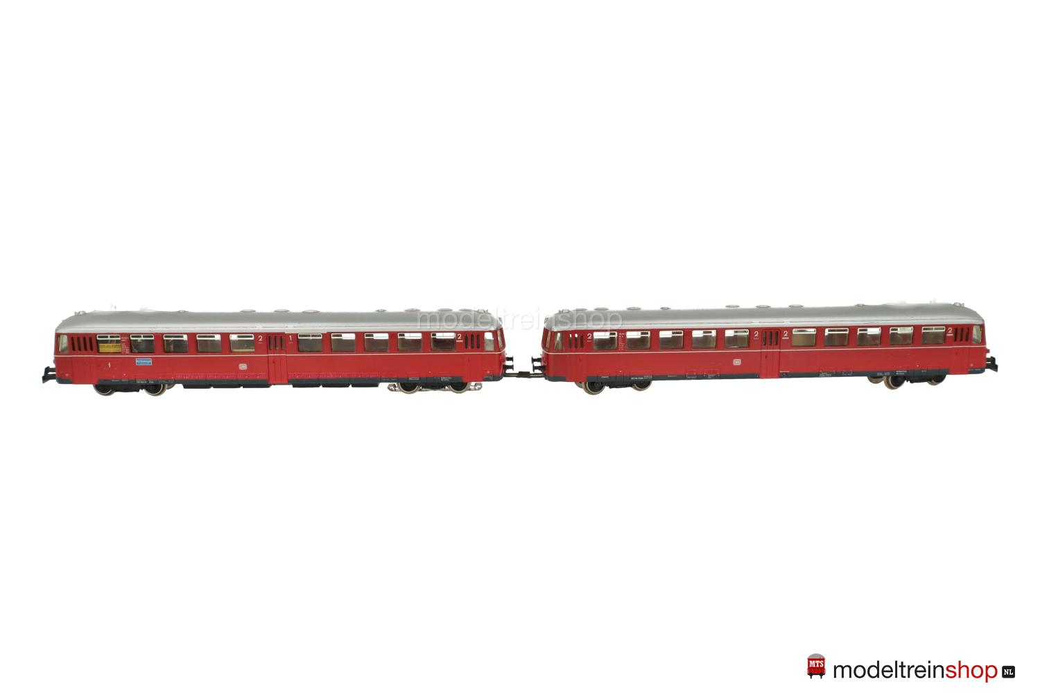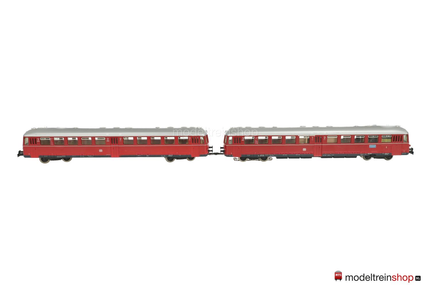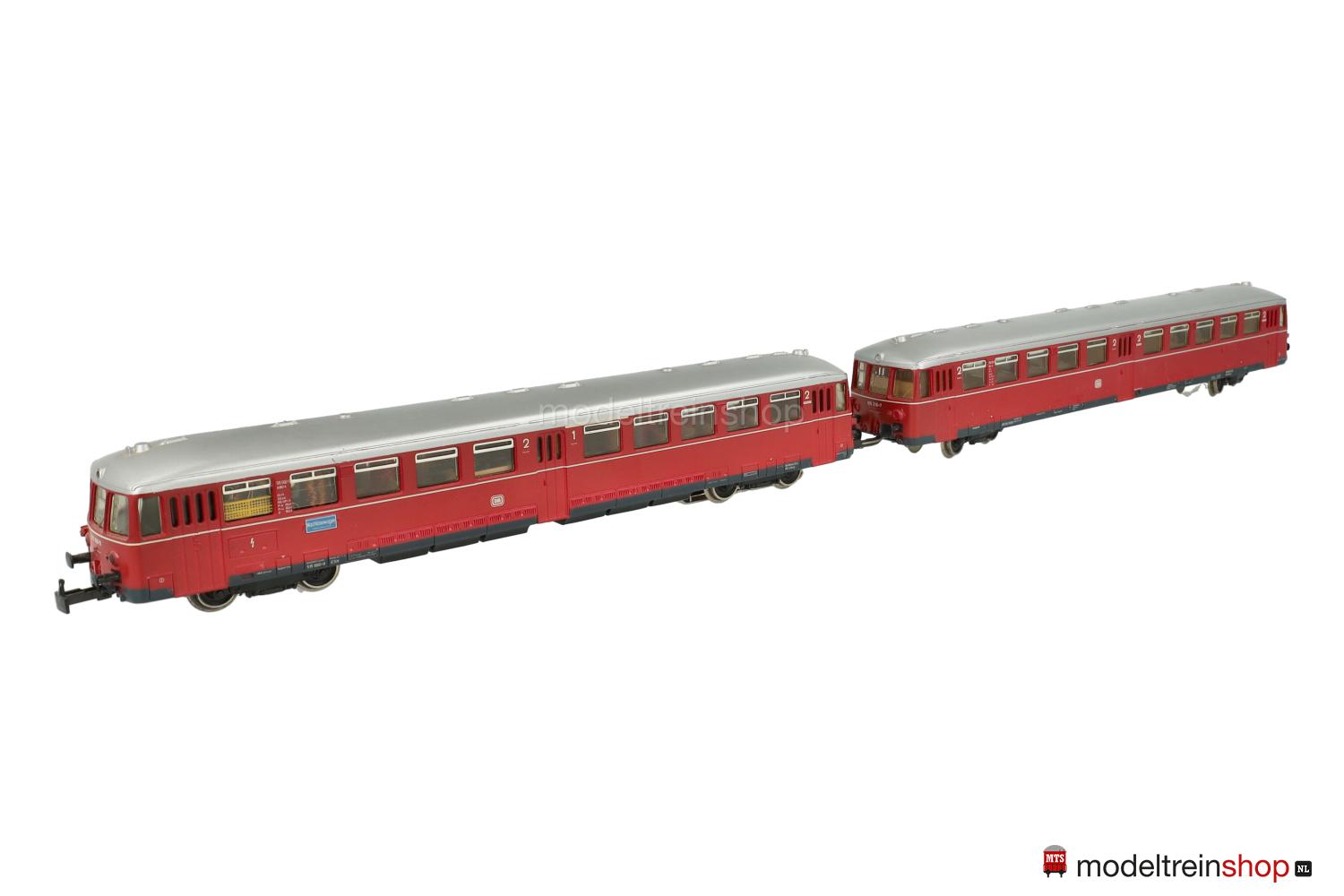 Weinrote Kunststoffgehäuse, silberfarbene Dächer, weiße DB-Embleme, eingesetzte Fenster, Inneneinrichtung, Innenbeleuchtung. Dreilicht-Spitzensignal und zwei integrierte rote Schlußlichter jeweils nur an einer Stirnseite, Lichtwechsel weiß/rot mit Fahrtrichtungsänderung, an den gegeneinander zugewandten Stirnseiten Dreilicht-Spitzensignal nur angedeutet. Beide Fahrzeuge fest gekuppelt.