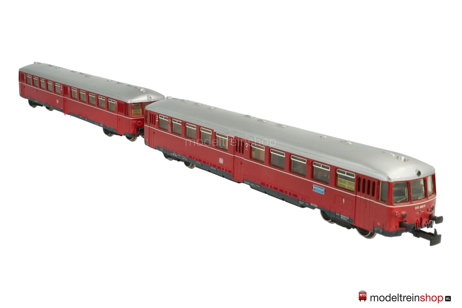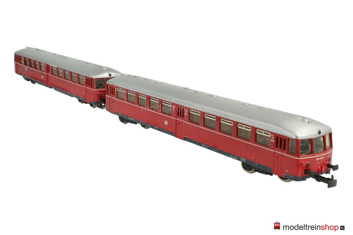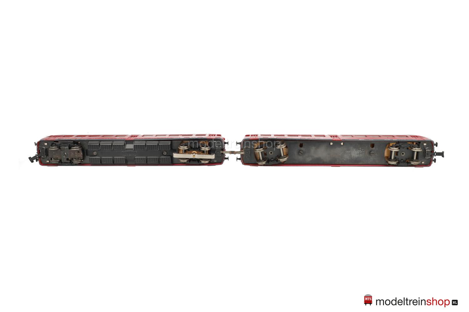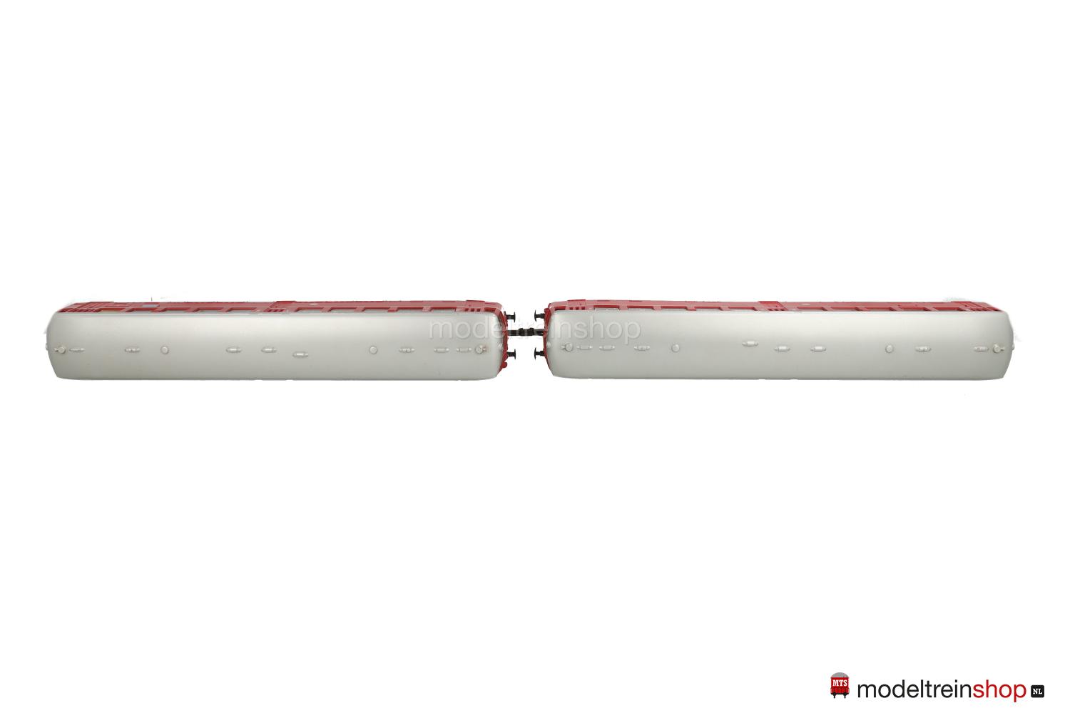 Weinrote Kunststoffgehäuse, silberfarbene Dächer, weiße DB-Embleme, eingesetzte Fenster, Inneneinrichtung, Innenbeleuchtung. Dreilicht-Spitzensignal und zwei integrierte rote Schlußlichter jeweils nur an einer Stirnseite, Lichtwechsel weiß/rot mit Fahrtrichtungsänderung, an den gegeneinander zugewandten Stirnseiten Dreilicht-Spitzensignal nur angedeutet. Beide Fahrzeuge fest gekuppelt.