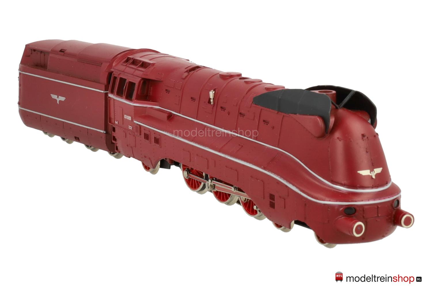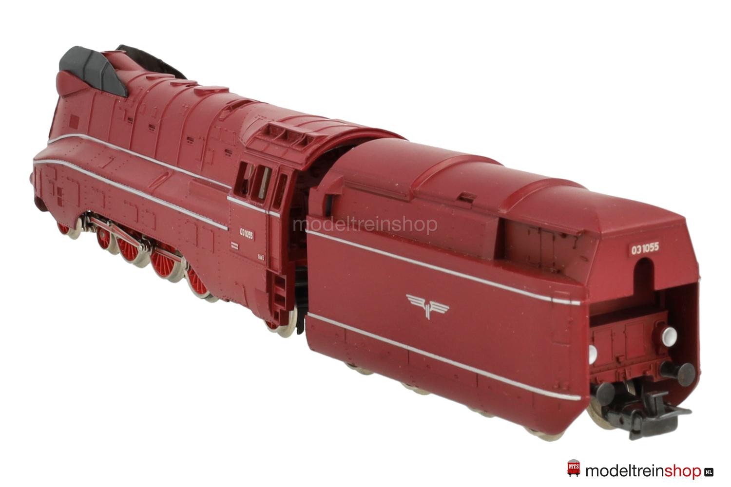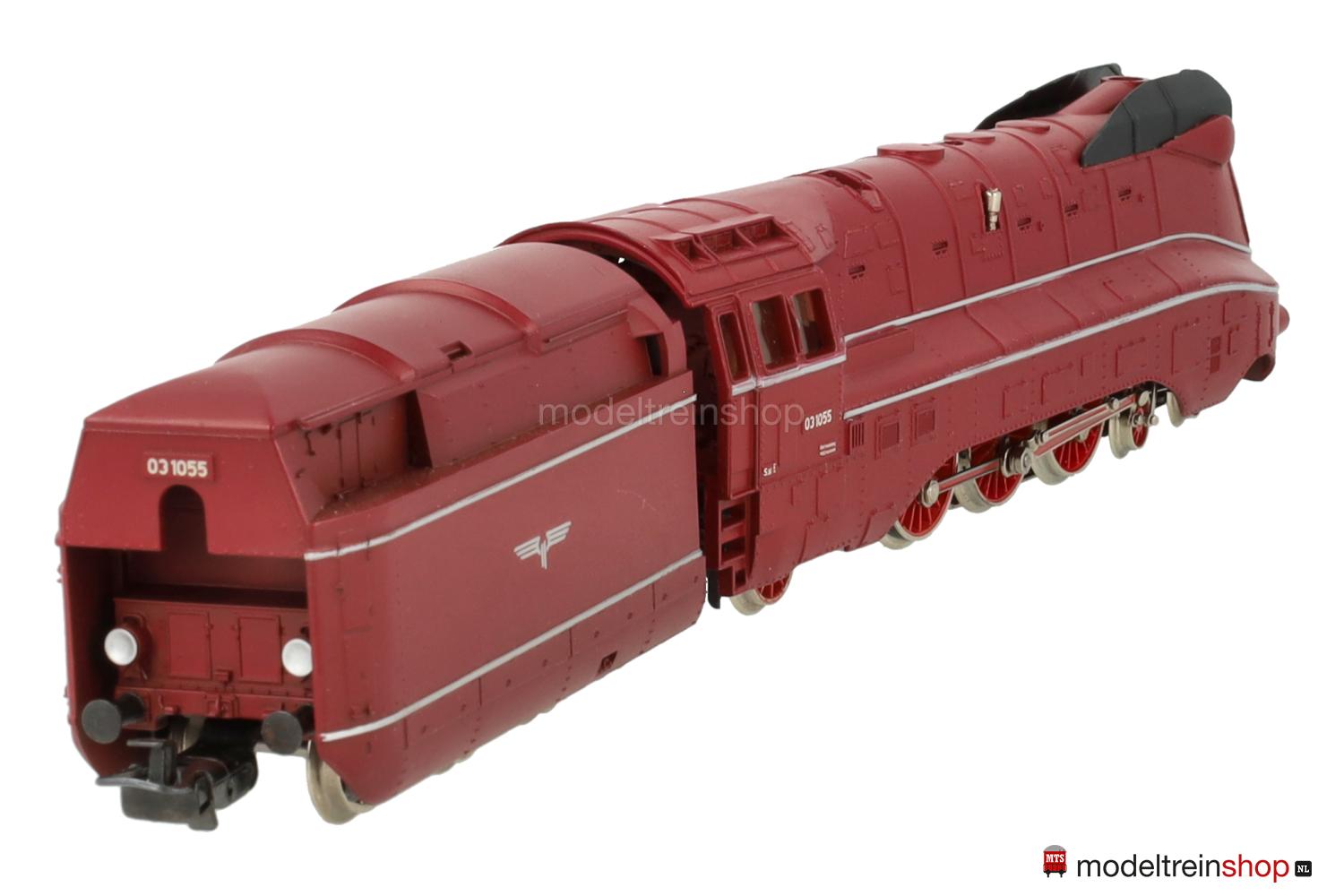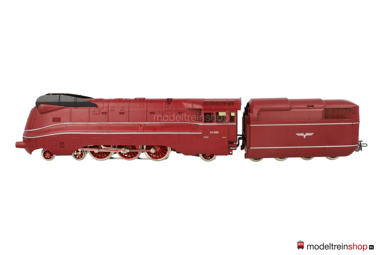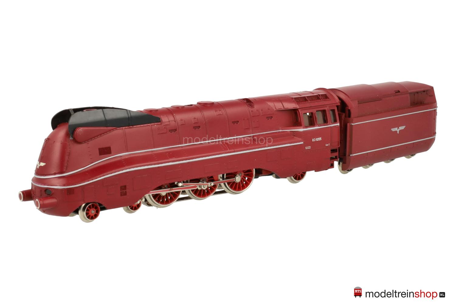 Achsfolge 2′ C 1′. Gußfahrgestell, drei angetriebene Achsen – davon zwei über Kuppelstangen. Rotes Gußgehäuse (in verschiedenen Farbnuancen ausgeliefert), aufgesteckte schwarze Windleitbleche, silberfarbene Zierstreifen, weiße Aufschriften, Betriebs-Nr.: 03 1055. Fenster mit Cellonscheiben hinterlegt. Zweilicht-Spitzensignal vorne. Vierachsiger Kunststoff-Tender (2′ 2′ T 34 St) mit silberfarbenen Zierstreifen und silberfarbenen Flügelrädern, funktionsloses Zweilicht-Spitzensignal.