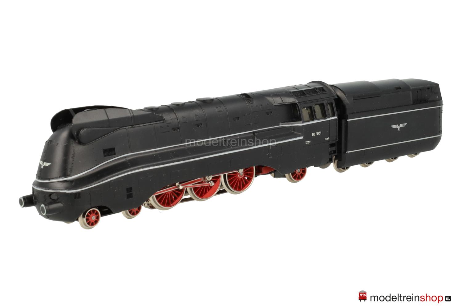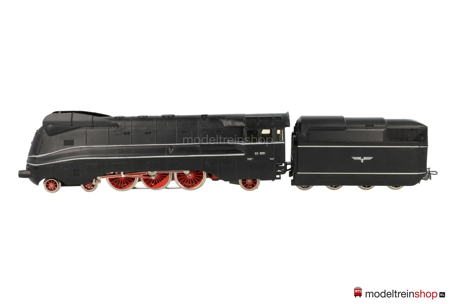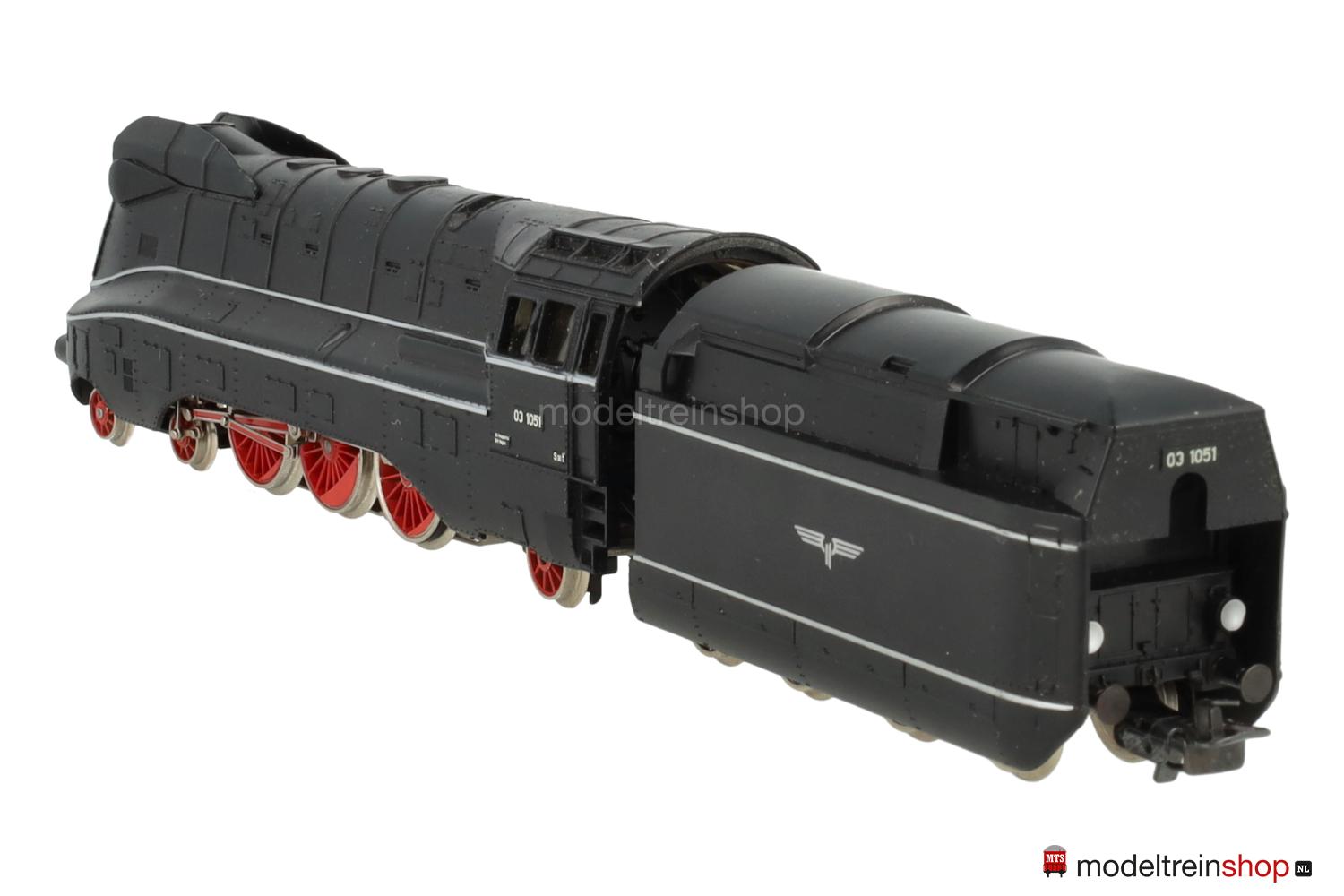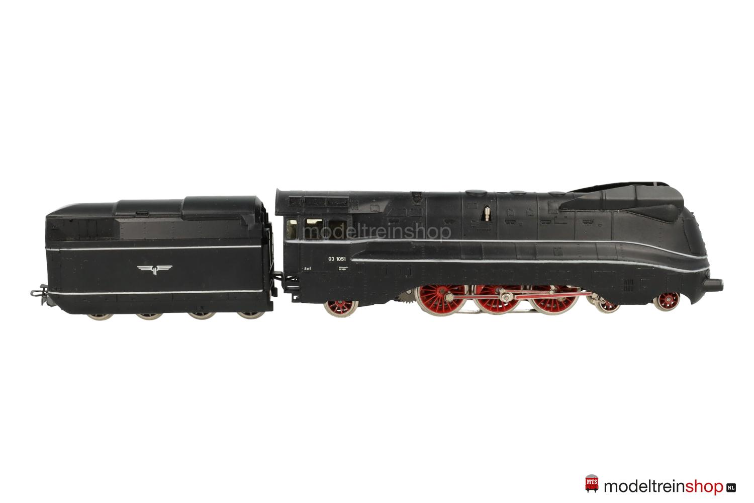 Achsfolge 2′ C 1′. Gußfahrgestell, drei angetriebene Achsen – davon zwei über Kuppelstangen. Schwarzes Gußgehäuse mit aufgesteckten schwarzen Windleitblechen, silberfarbene Zierstreifen, weiße Aufschriften, Betriebs-Nr.: 03 1051, Fenster mit Cellonscheiben hinterlegt. Zweilicht-Spitzensignal vorne. Vierachsiger Kunststoff-Tender (2′ 2′ T 34 St) mit silberfarbenen Zierstreifen und silberfarbenen Flügelrädern.