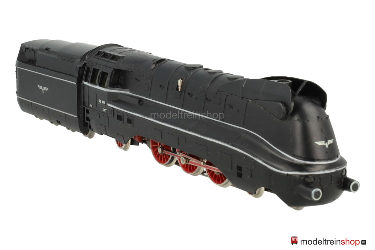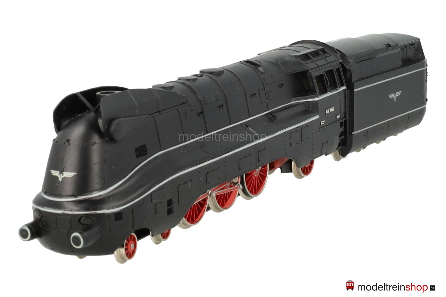 Model volgens bouwserie 03.10 van de Deutsche Reichsbahn Gesellschaft (DRG) met de asindeling 2 C1, 3 assig. 2 Antislipbanden ter verhoging van de trekkracht. Afstandsbediening voor het vooruit- en achteruitrijden doormiddel van een Marklin transformator. Heusinger schuifbeweging. Twee verlichte koplampen. Matzwarte metalen bovenbouw in stroomlijnmodel met zilverlijnen. Fijn gedetailleerde weergave van armaturen op ketel en in machinistenhuis. Rijfreem van zinkepersgietwerk. Aan tender automatische koppeling met voorontkoppeling (Relex). Lengte over buffers 27,4 cm.