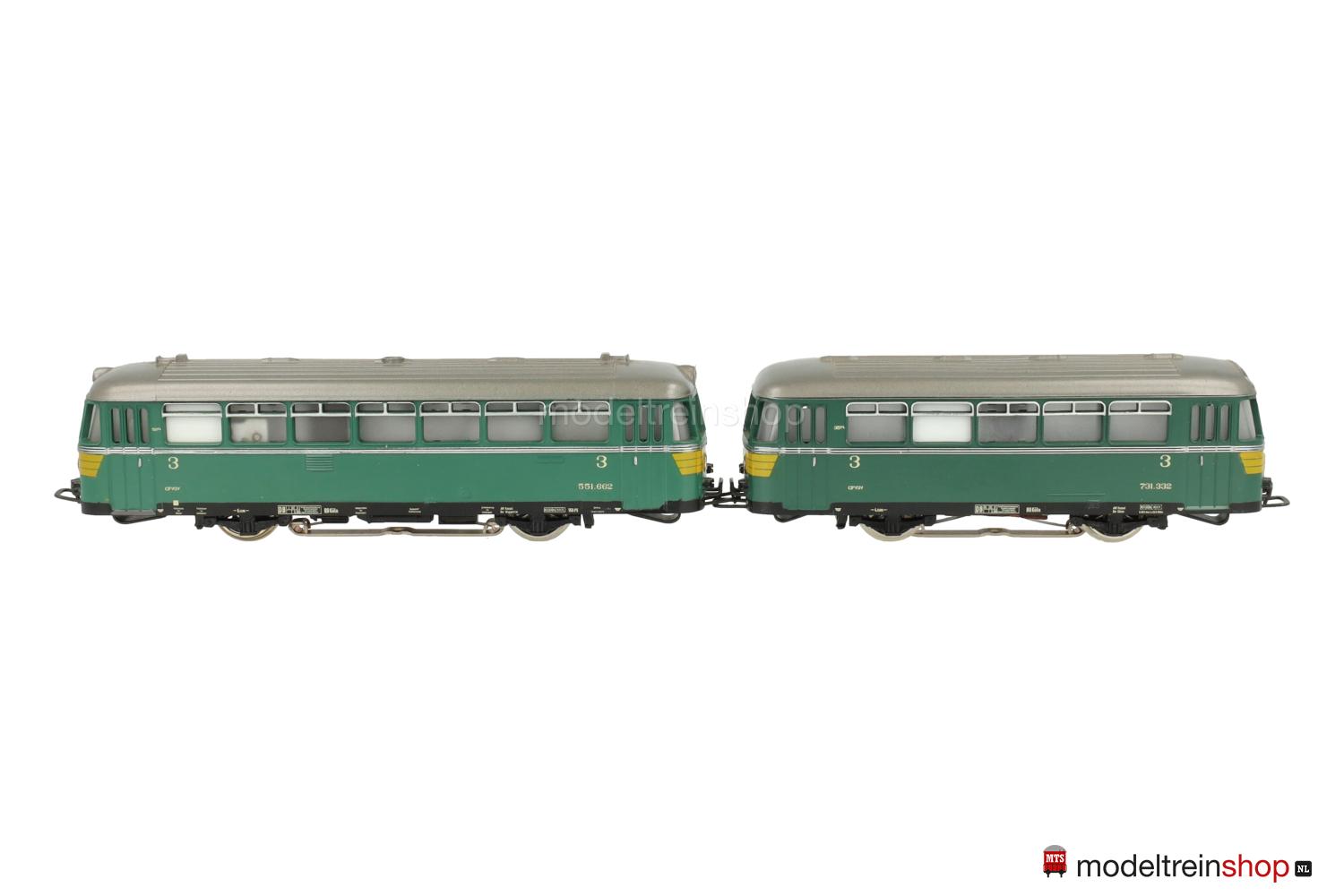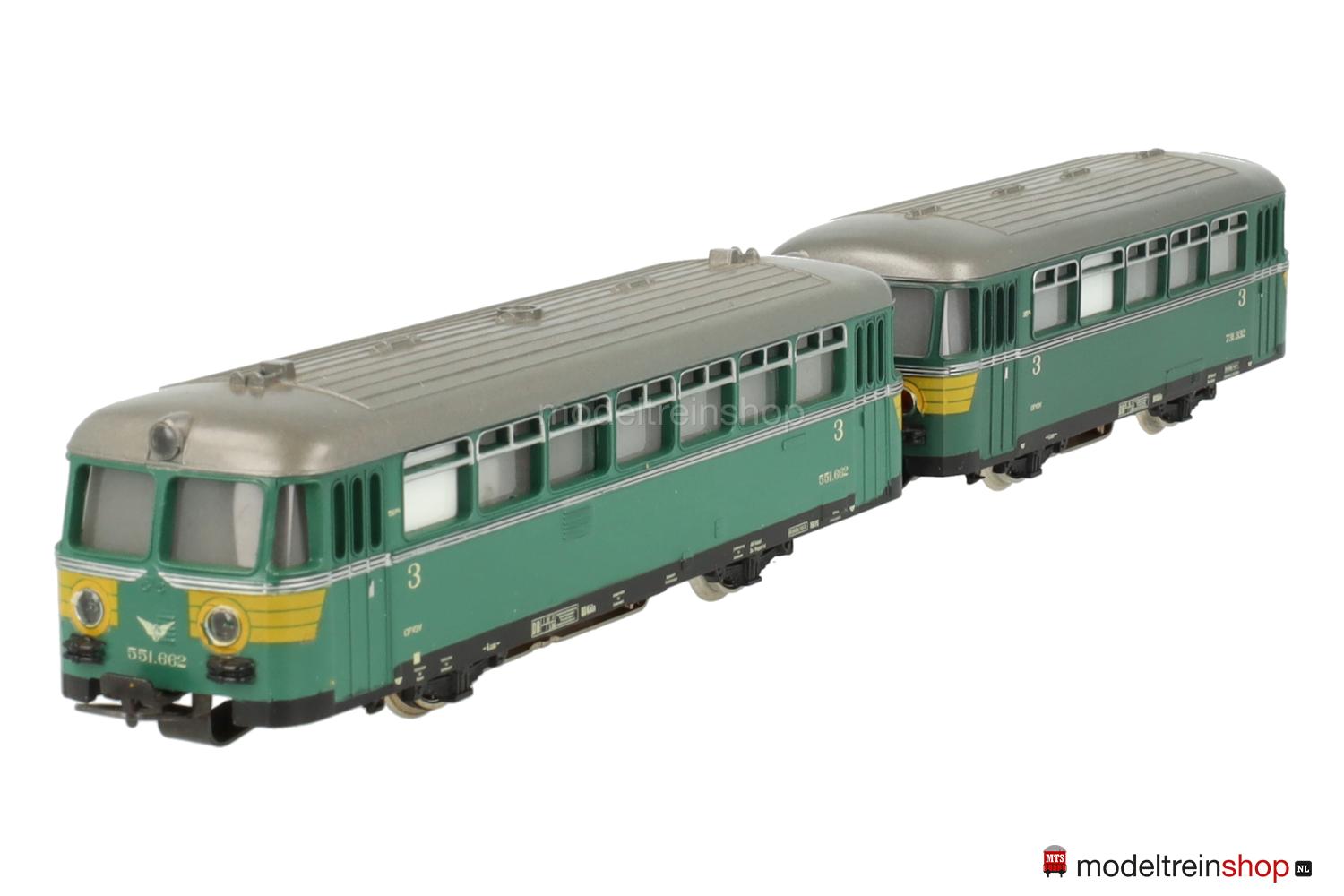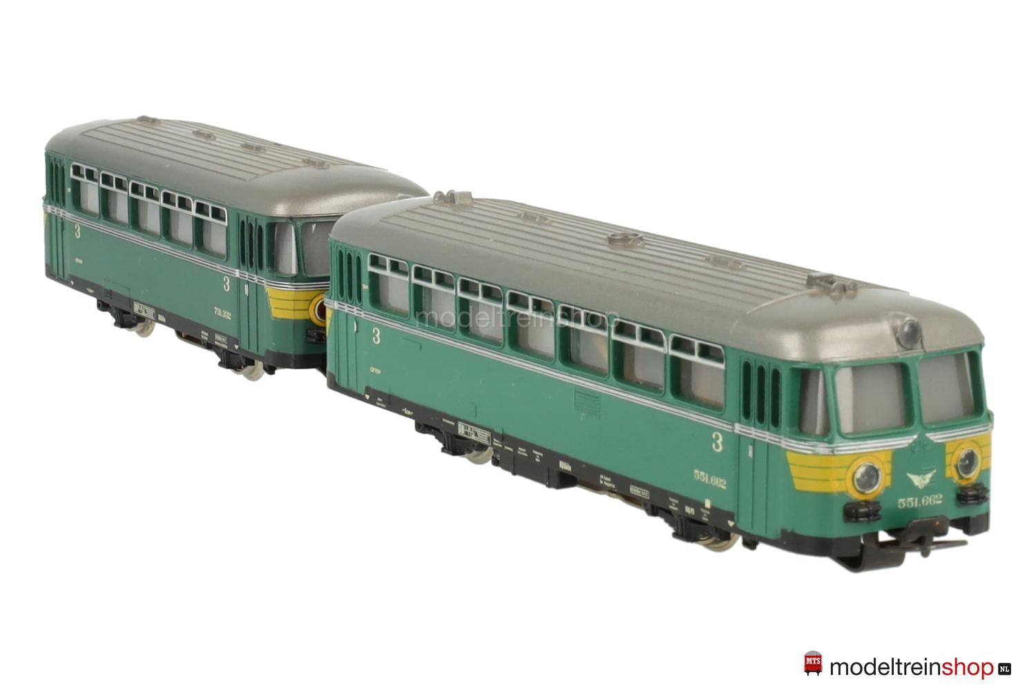 Achsfolge B. Schwarzes Gußfahrgestell, eine angetriebene Achse. Grünes Kunststoffgehäuse, silbergraues Dach, umlaufender silberfarbener Zierstreifen, gelbe Streifen an den Fahrzeugecken, Betriebs-Nr.: 551.662, Fenster mit Cellonscheiben hinterlegt, erhabenes Märklin-Emblem an beiden Stirnseiten. Dreilicht-Spitzensignal beidseitig.