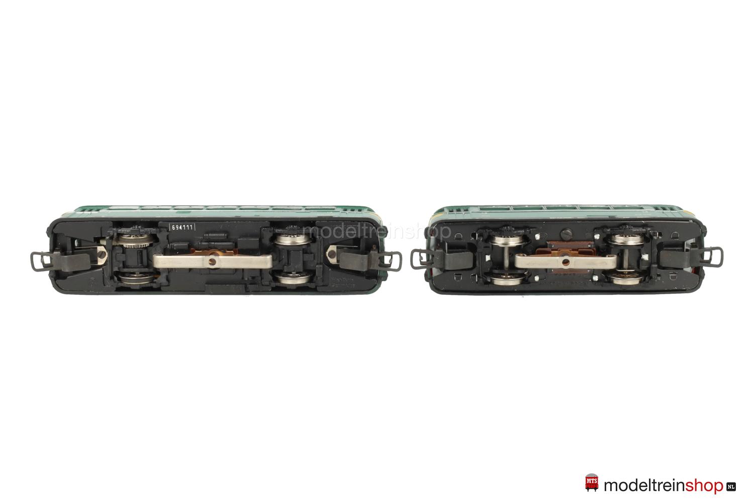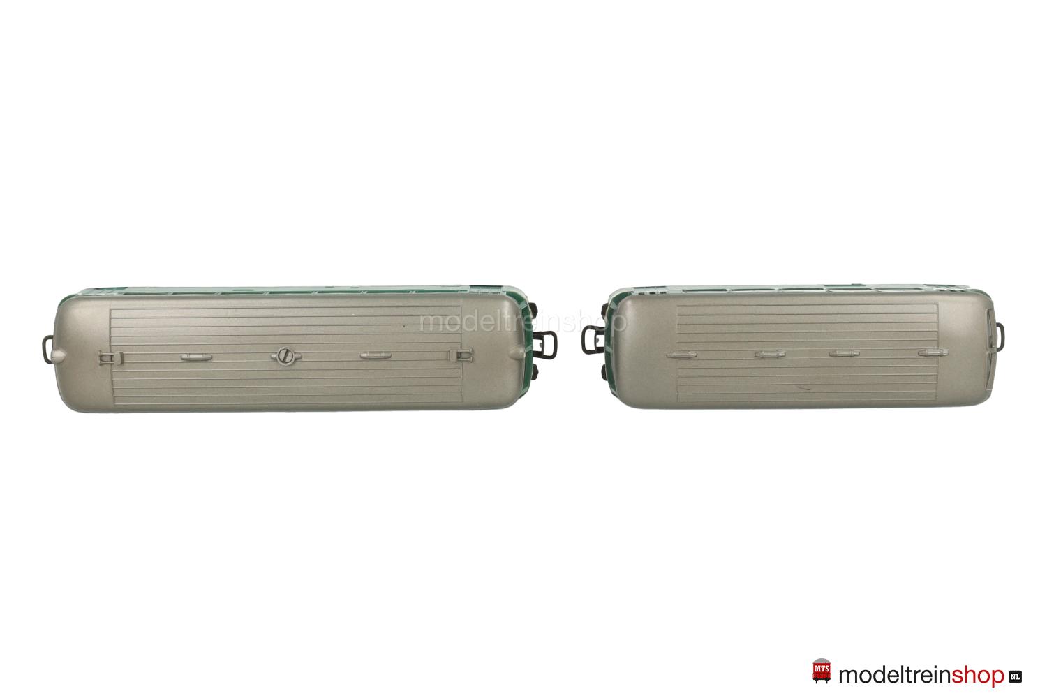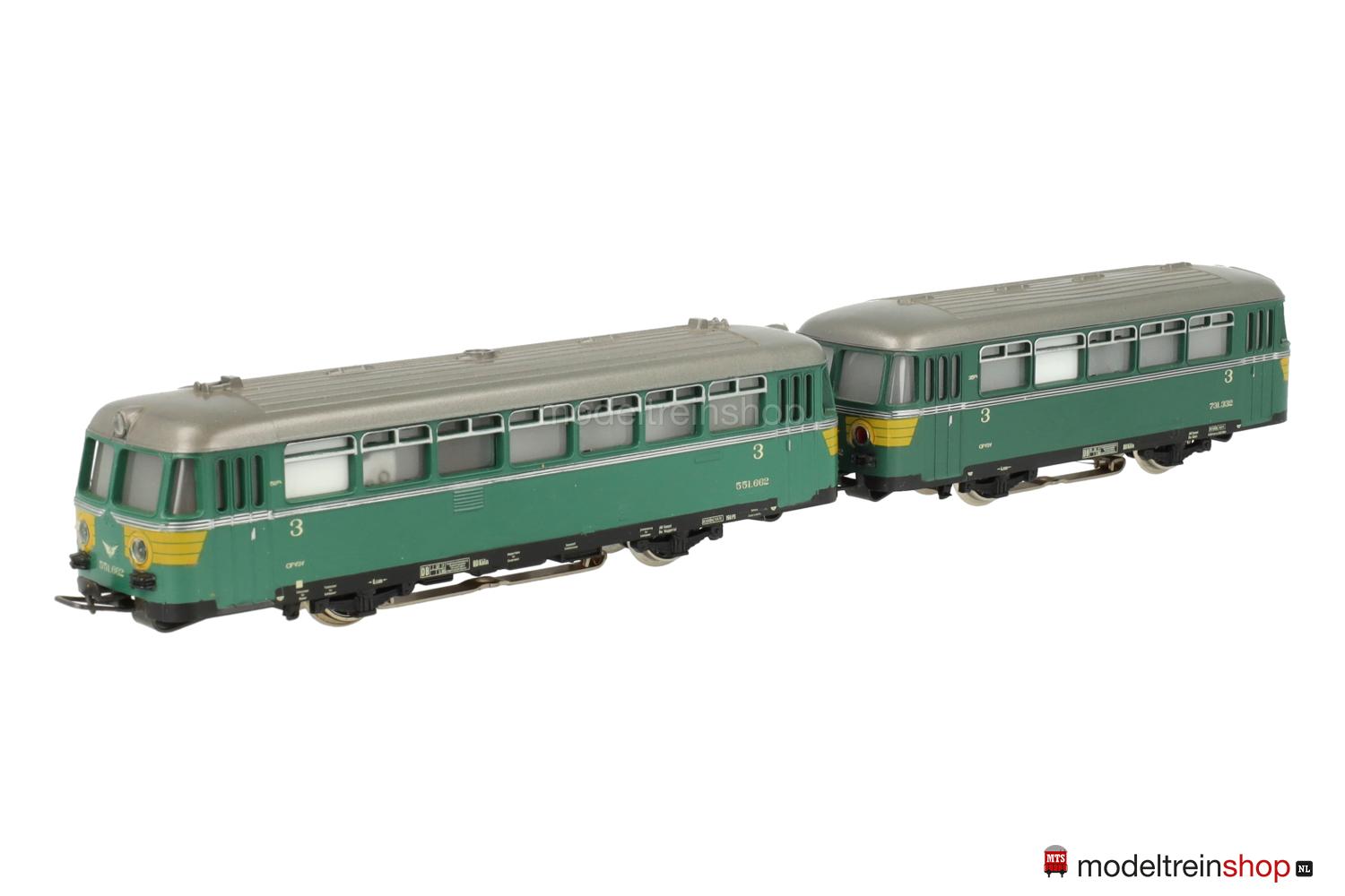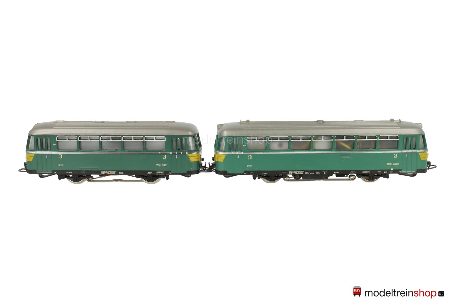 Achsfolge B. Schwarzes Gußfahrgestell, eine angetriebene Achse. Grünes Kunststoffgehäuse, silbergraues Dach, umlaufender silberfarbener Zierstreifen, gelbe Streifen an den Fahrzeugecken, Betriebs-Nr.: 551.662, Fenster mit Cellonscheiben hinterlegt, erhabenes Märklin-Emblem an beiden Stirnseiten. Dreilicht-Spitzensignal beidseitig.