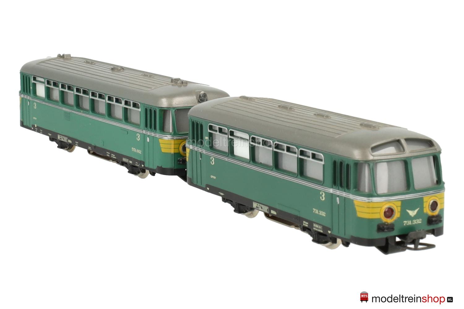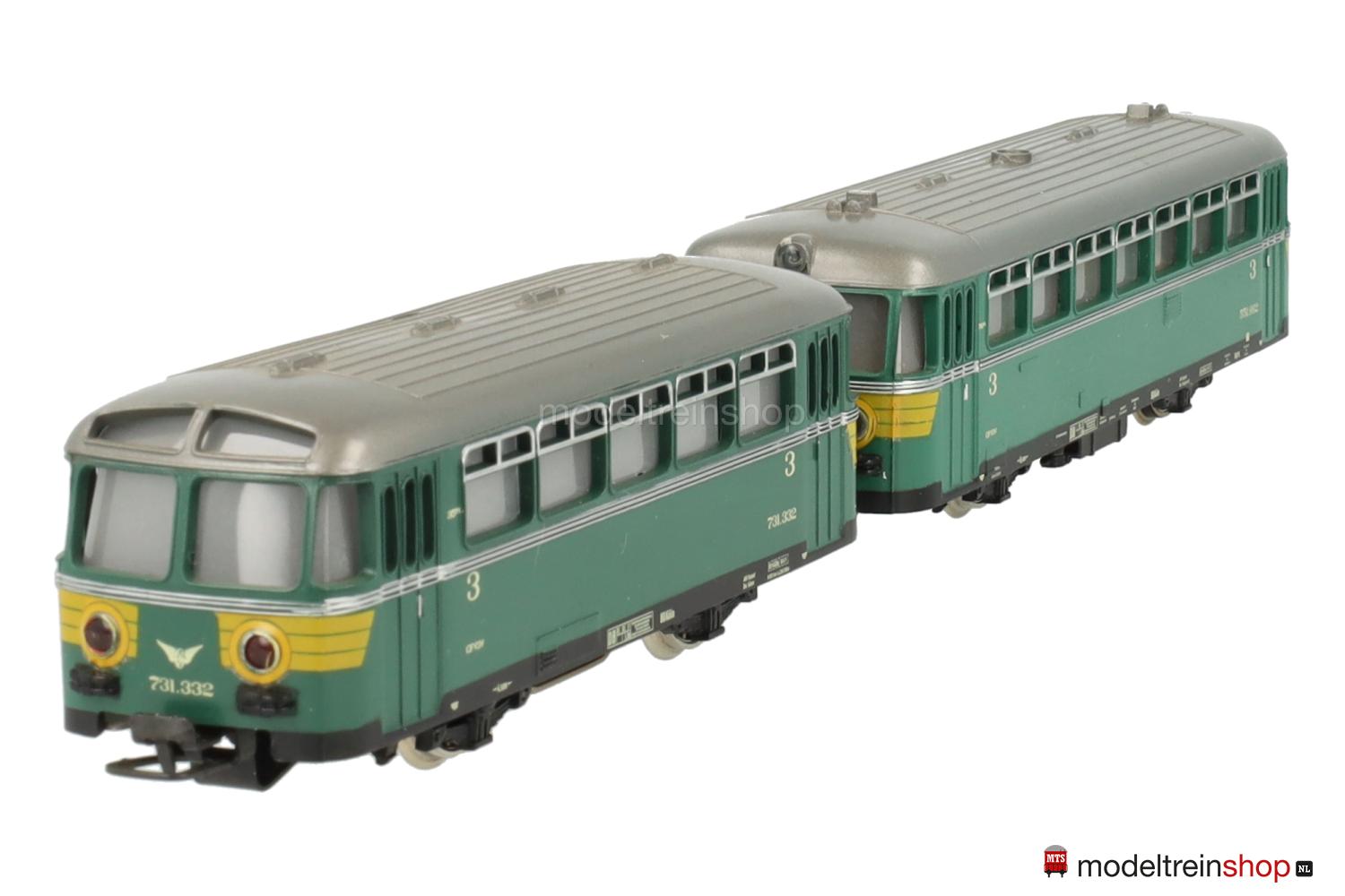 Achsfolge B. Schwarzes Blechfahrgestell. Kunststoffgehäuse, grün, Dach silbergrau, umlaufender silberner Zierstreifen, gelbe Streifen an den Fahrzeugecken, Betriebs-Nr.: 731.332, Fenster mit Cellonscheiben hinterlegt, Innenbeleuchtung, zwei rote Schlußlichter beidseitig.