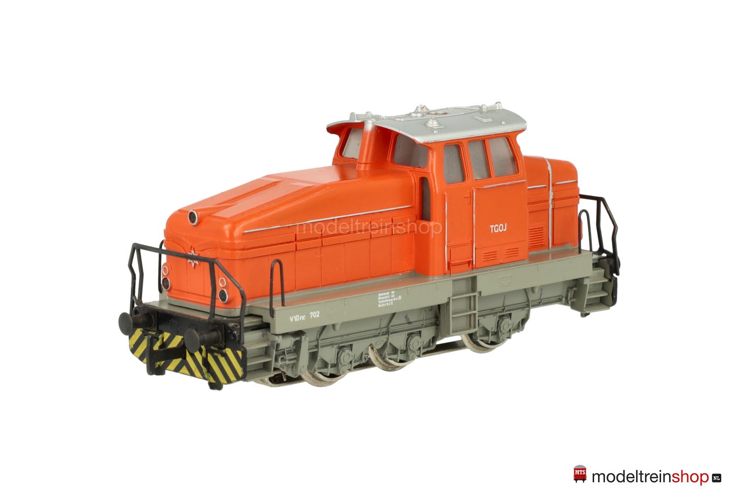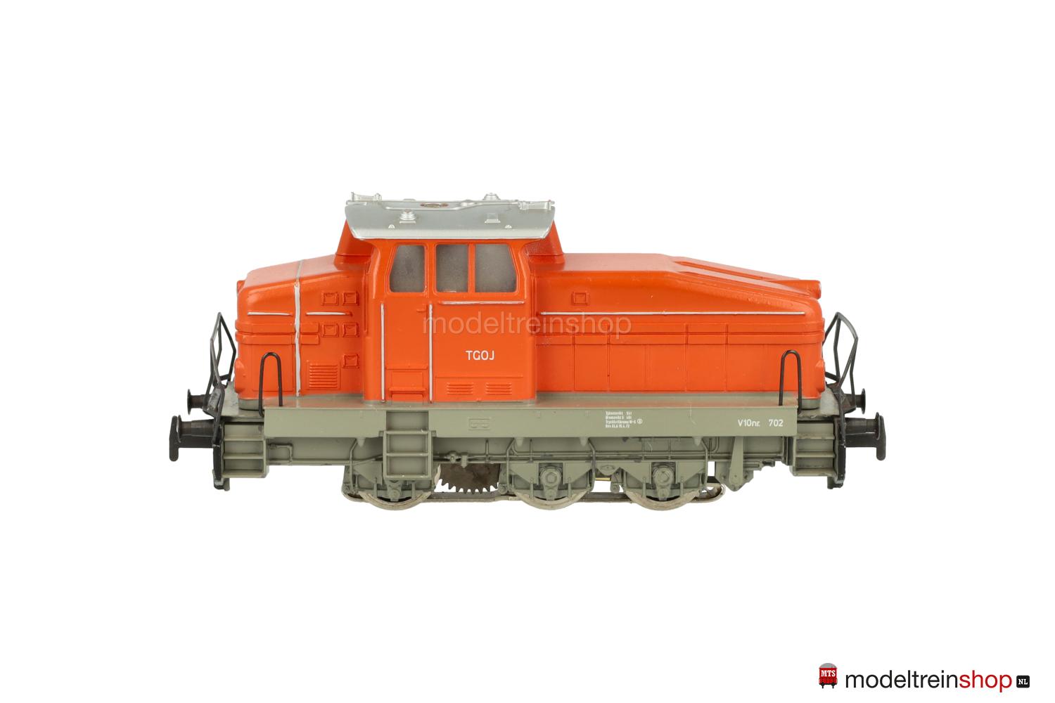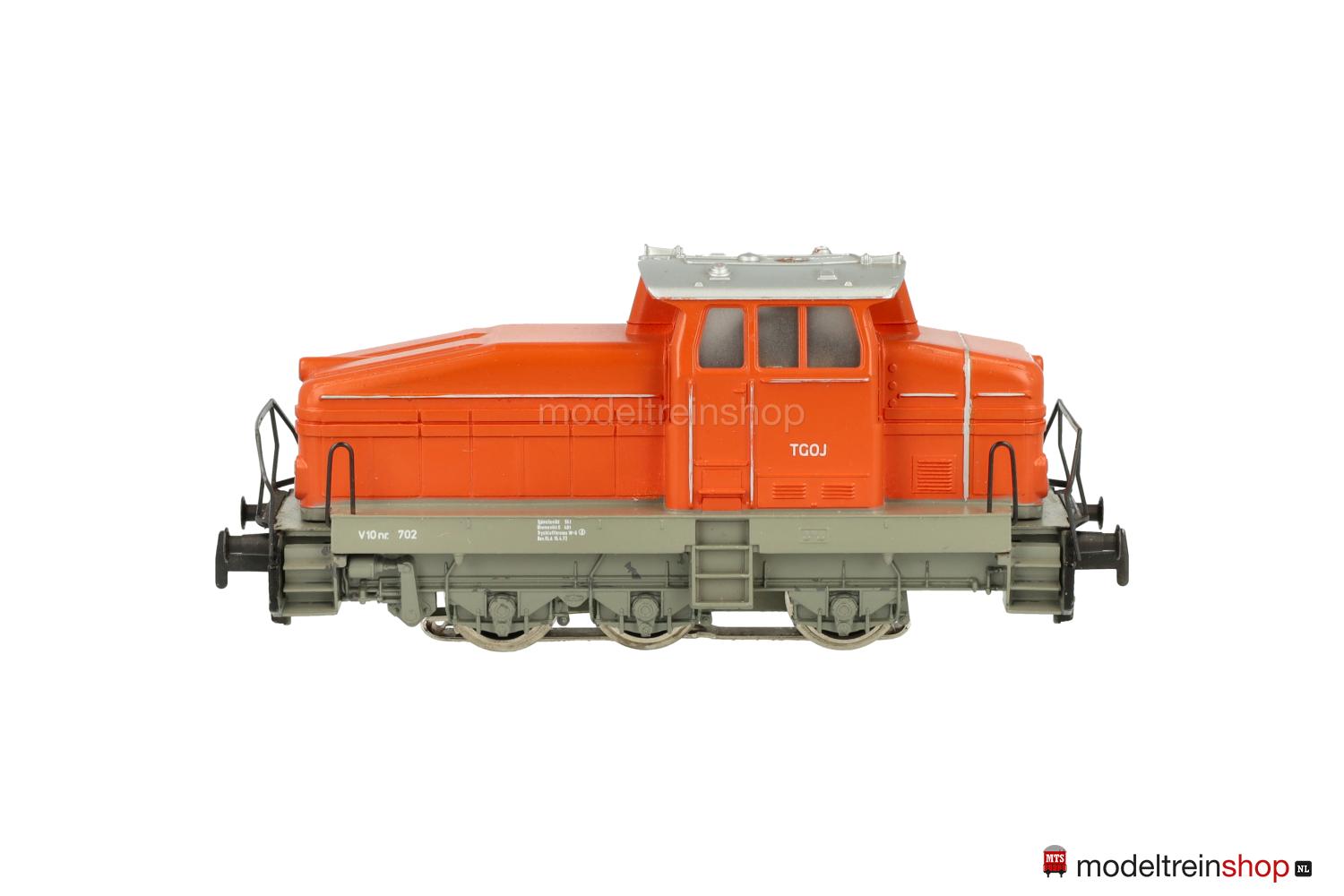Achsfolge C. Graues Gußfahrgestell, drei angetriebene Achsen, Bühnengeländer an den Stirnseiten, erhabene “HENSCHEL”-Fabrikschilder am Rahmen. Orangefarbenes Kunststoffgehäuse, graues Fahrwerk und grauer Gehäuserahmen, silberfarbenes Dach, weiße Aufschriften – u.a.: “TGOJ”, Betriebs-Nr.: 702, Fahrwerk-Stirnseiten mit gelb/schwarzem Warnanstrich, Fenster mit Cellonscheiben hinterlegt, Bühnengeländer an den Stirnseiten. Dreilicht-Spitzensignal beidseitig.