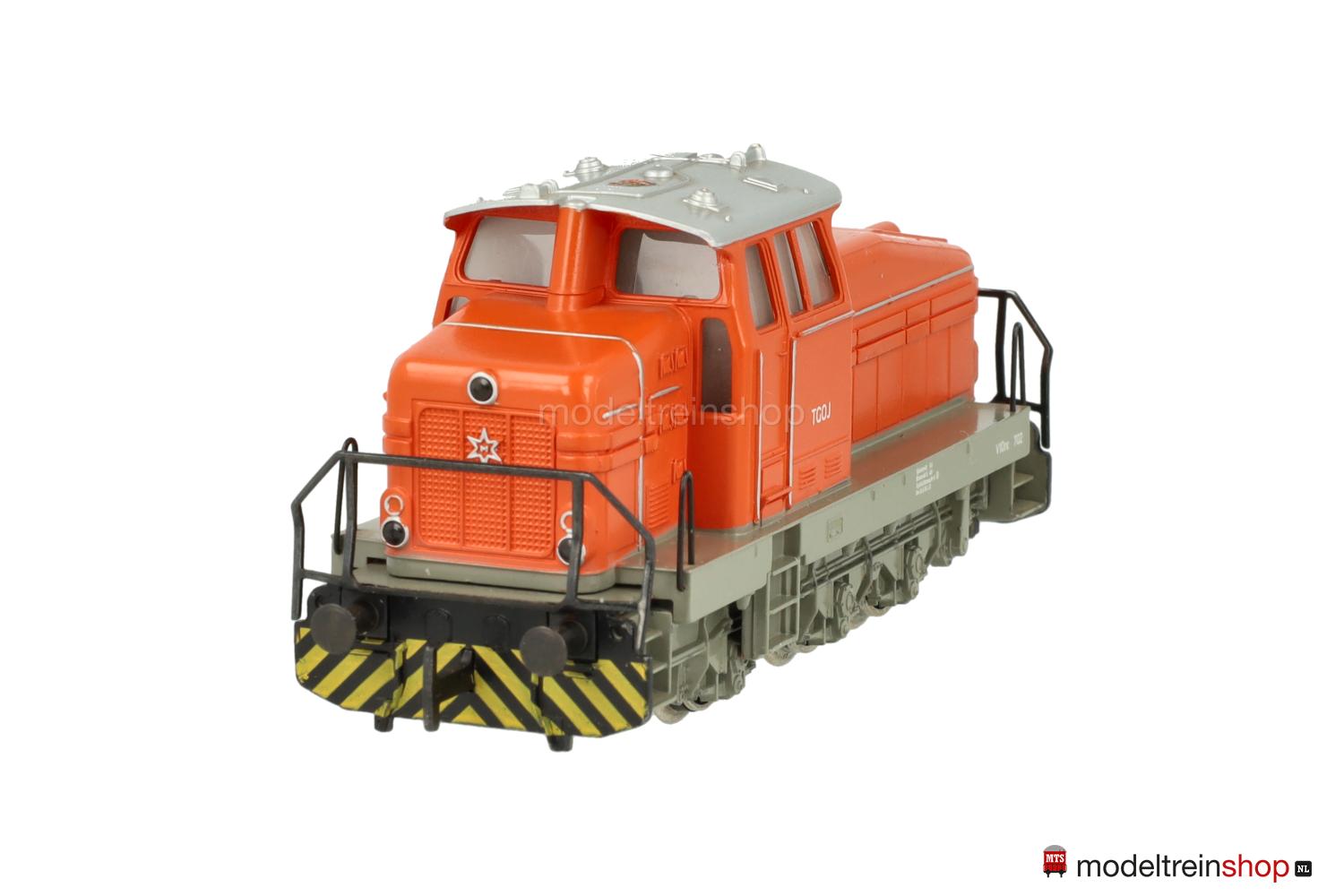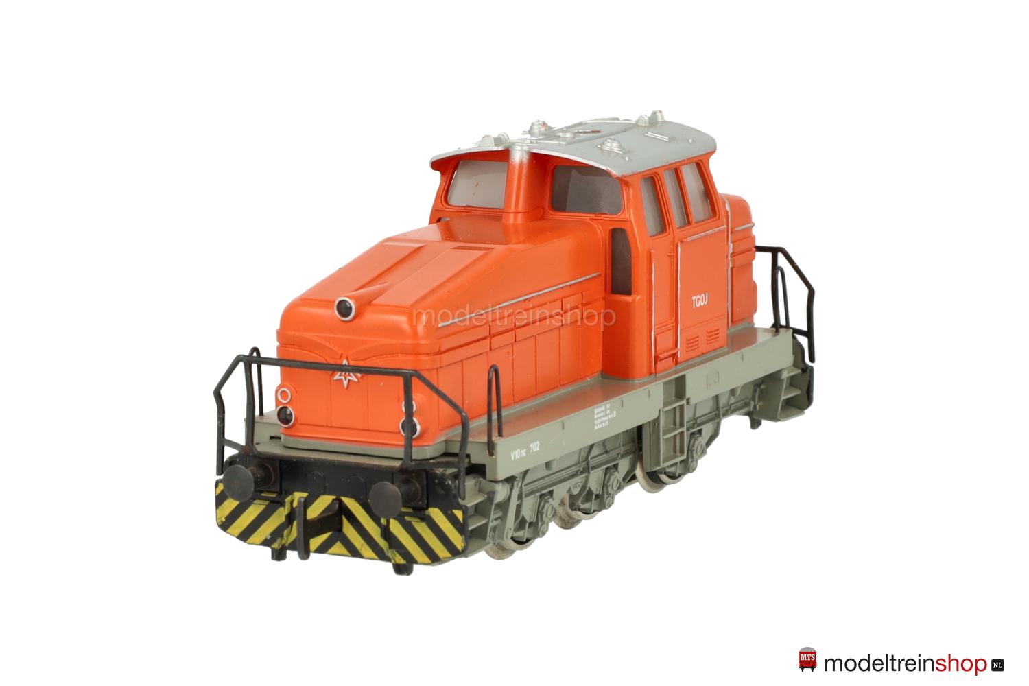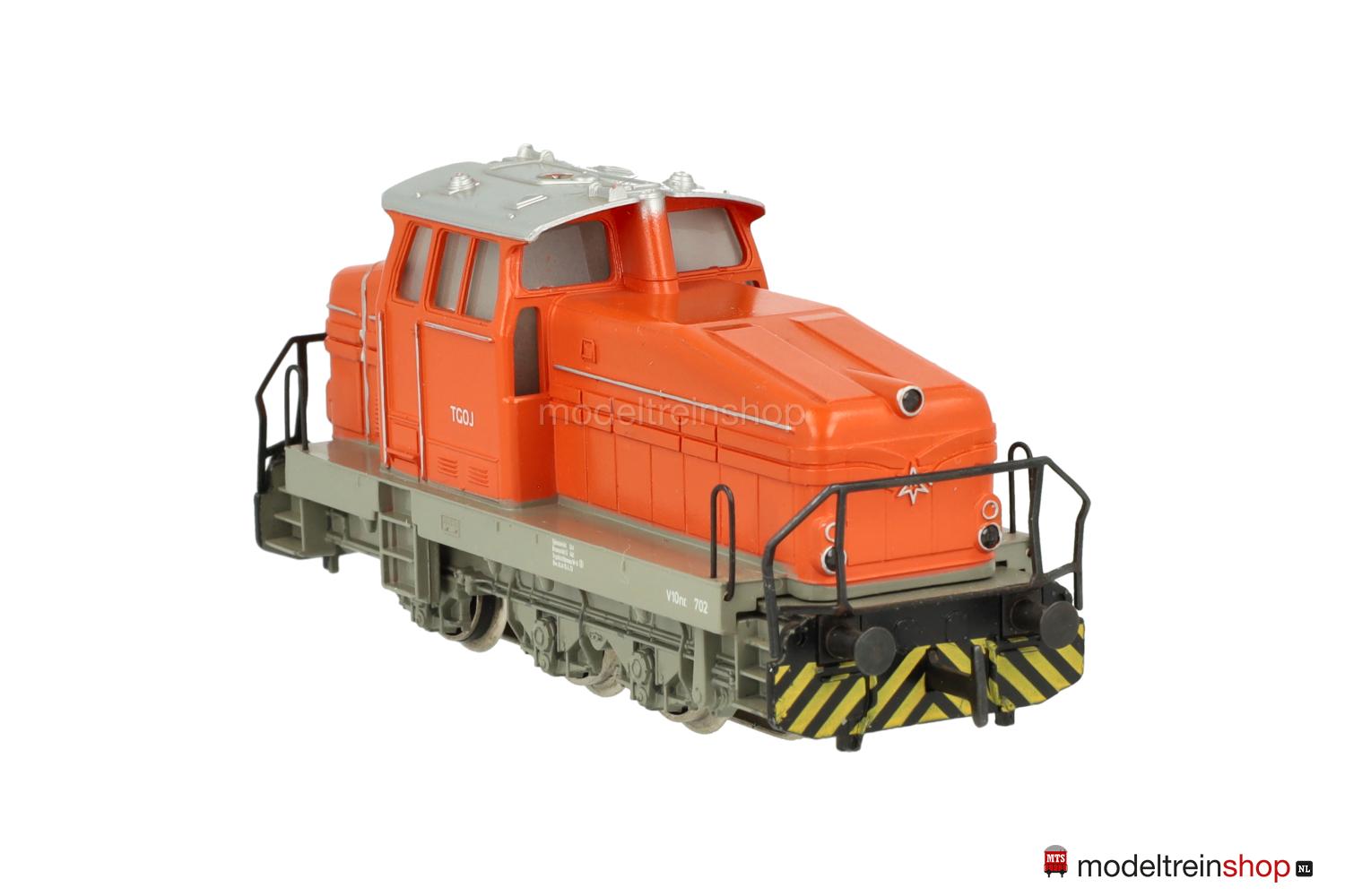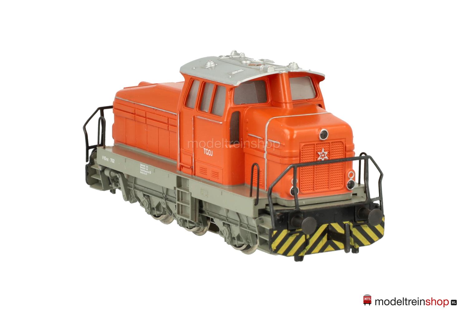 Achsfolge C. Graues Gußfahrgestell, drei angetriebene Achsen, Bühnengeländer an den Stirnseiten, erhabene “HENSCHEL”-Fabrikschilder am Rahmen. Orangefarbenes Kunststoffgehäuse, graues Fahrwerk und grauer Gehäuserahmen, silberfarbenes Dach, weiße Aufschriften – u.a.: “TGOJ”, Betriebs-Nr.: 702, Fahrwerk-Stirnseiten mit gelb/schwarzem Warnanstrich, Fenster mit Cellonscheiben hinterlegt, Bühnengeländer an den Stirnseiten. Dreilicht-Spitzensignal beidseitig.