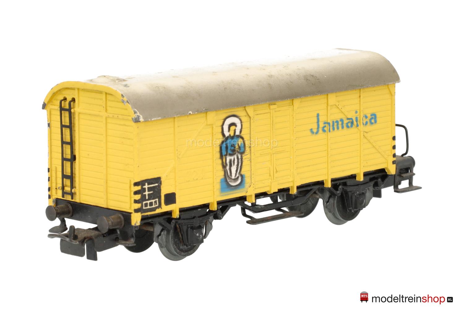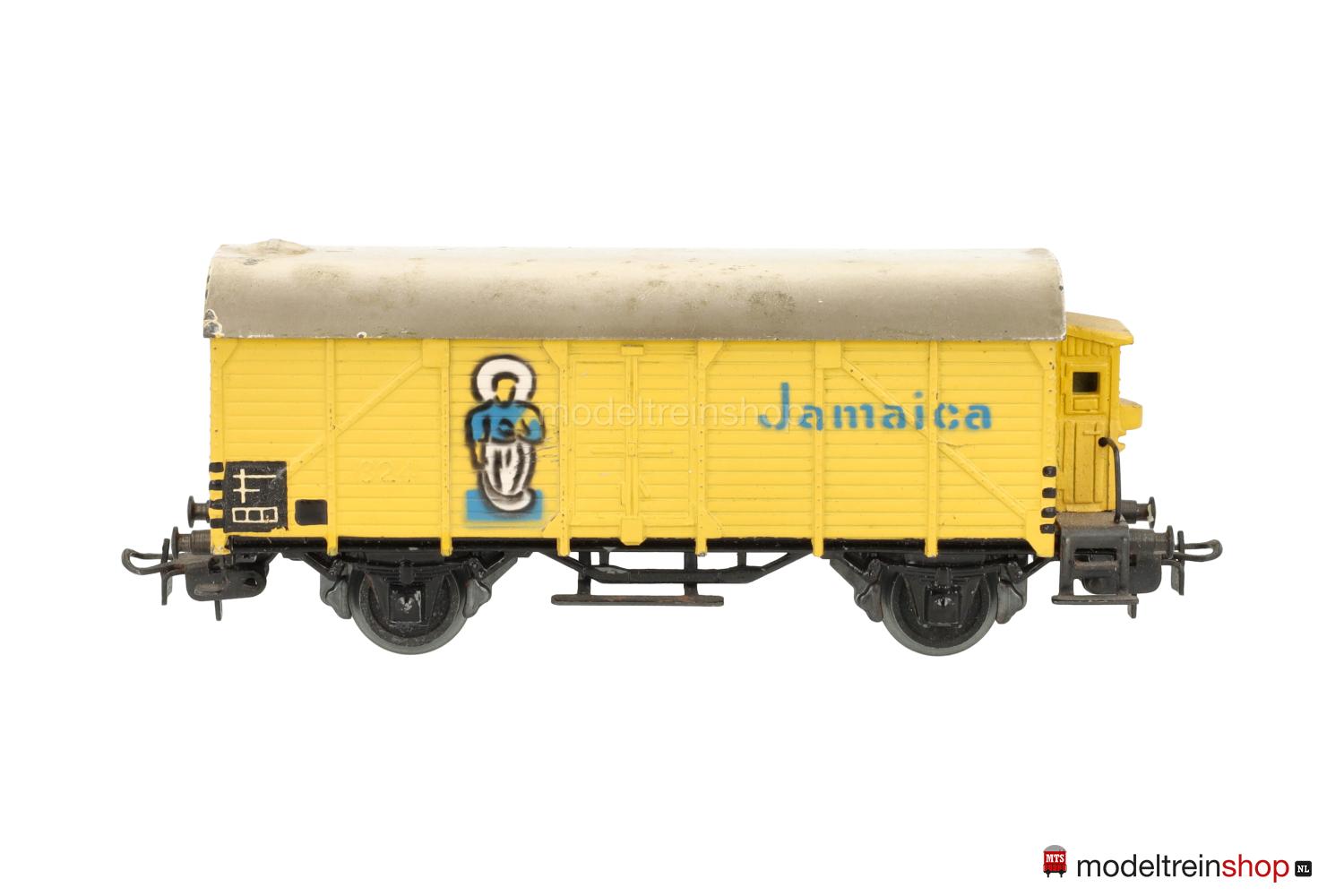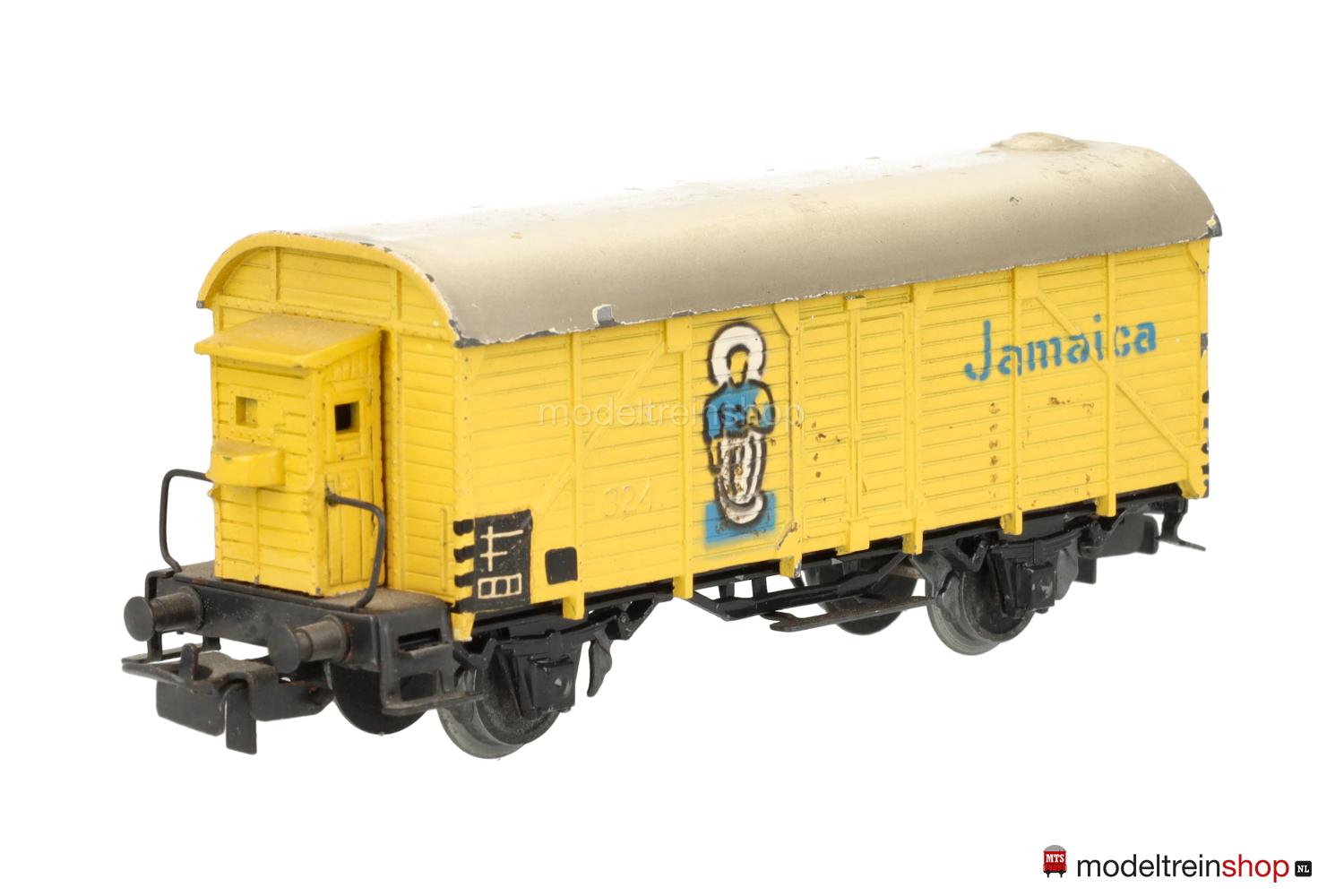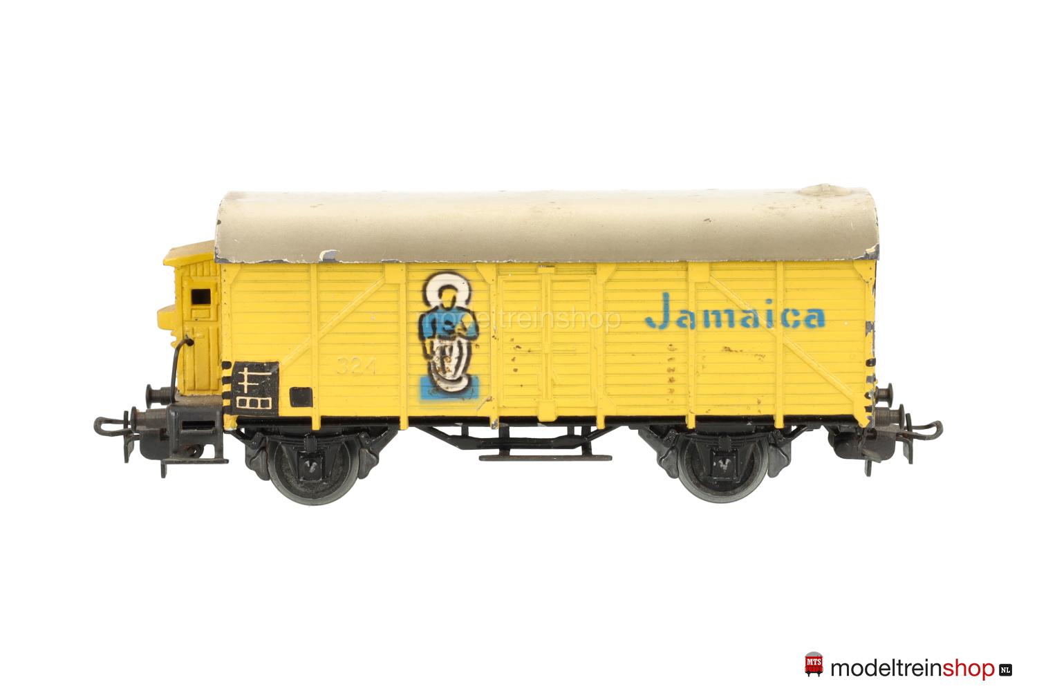 Schwarzes Guß-Untergestell mit angenieteten Trittbrettern, Pufferbohle mit Trittstufen, Trittbretter an der Bremserbühne, Radsätze mit Stummelachsen. Guß-Aufbau: gelber Wagenkasten, weißes und schattiertes Dach (in verschiedenen Farbnuancen ausgeliefert), ohne Aufschriften, erhabene Nr. “324”, Übergabezettel-Felder = Schiebebilder, handgemalte Bremszeichen an den Wagenecken, blaue Schablonen-Aufschrift: “Jamaica” und mehrfarbige Darstellung eines Bananenpflückers.