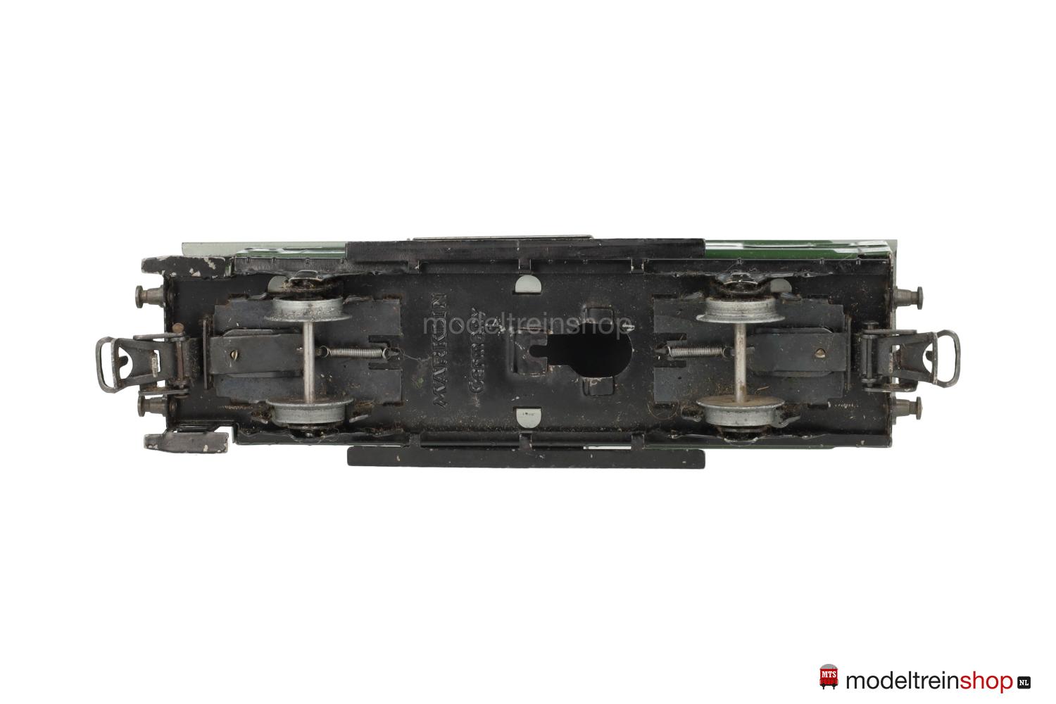 Schwarzes Blech-Untergestell. Blech-Aufbau: grüner Wagenkasten, graues Dach, Dachaufsatz aus Kunststoff, gelbe und weiße Aufschriften – teilweise schwarz unterlegt, Fenster ohne Verglasung, je Längsseite eine bewegliche Schiebetüre.
