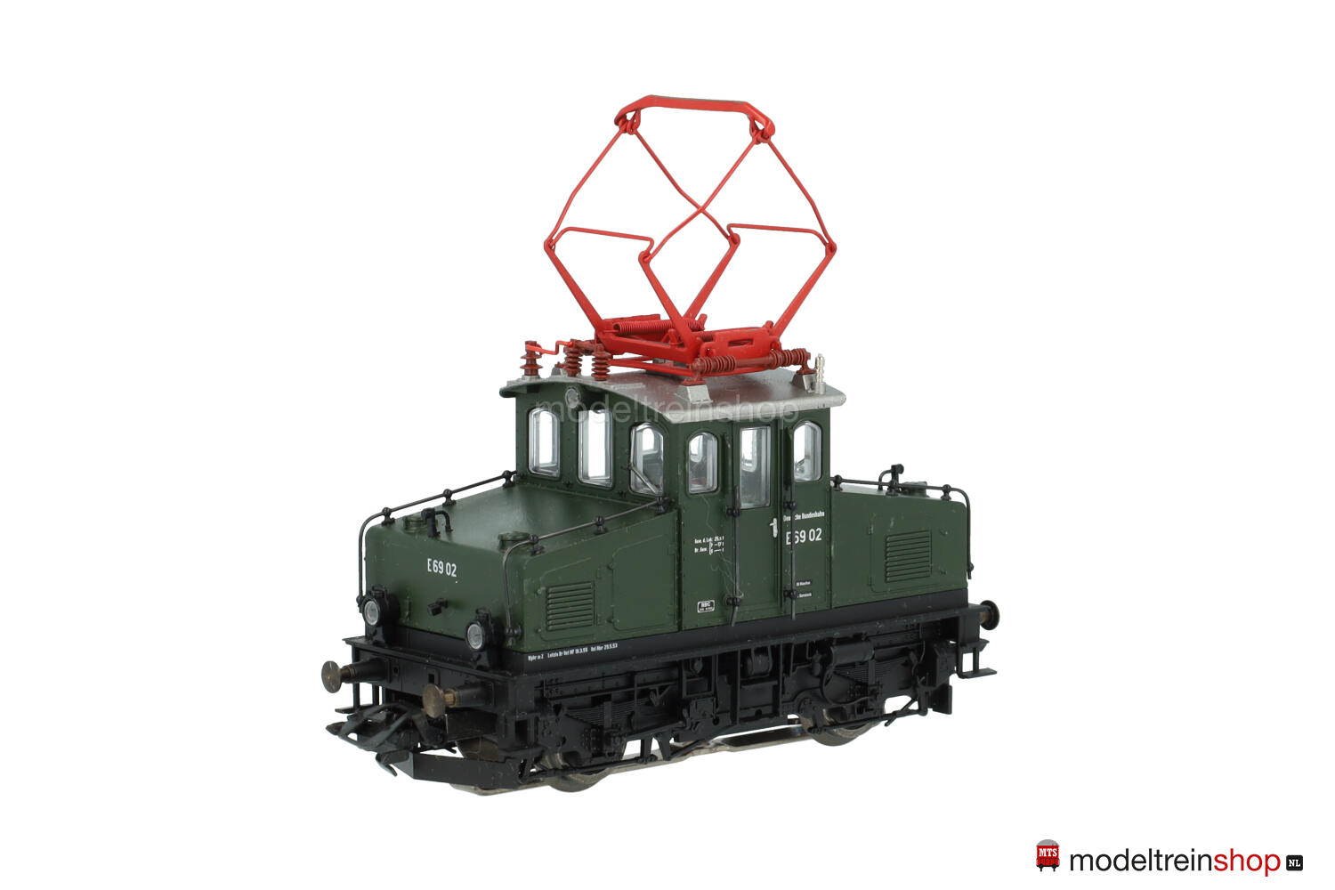 Dunkelgrünes Gehäuse, weiße Aufschriften, Betriebs-Nr.: E 69 02.