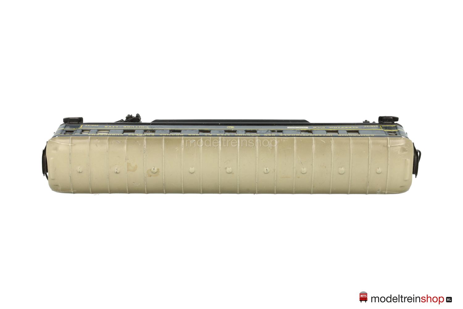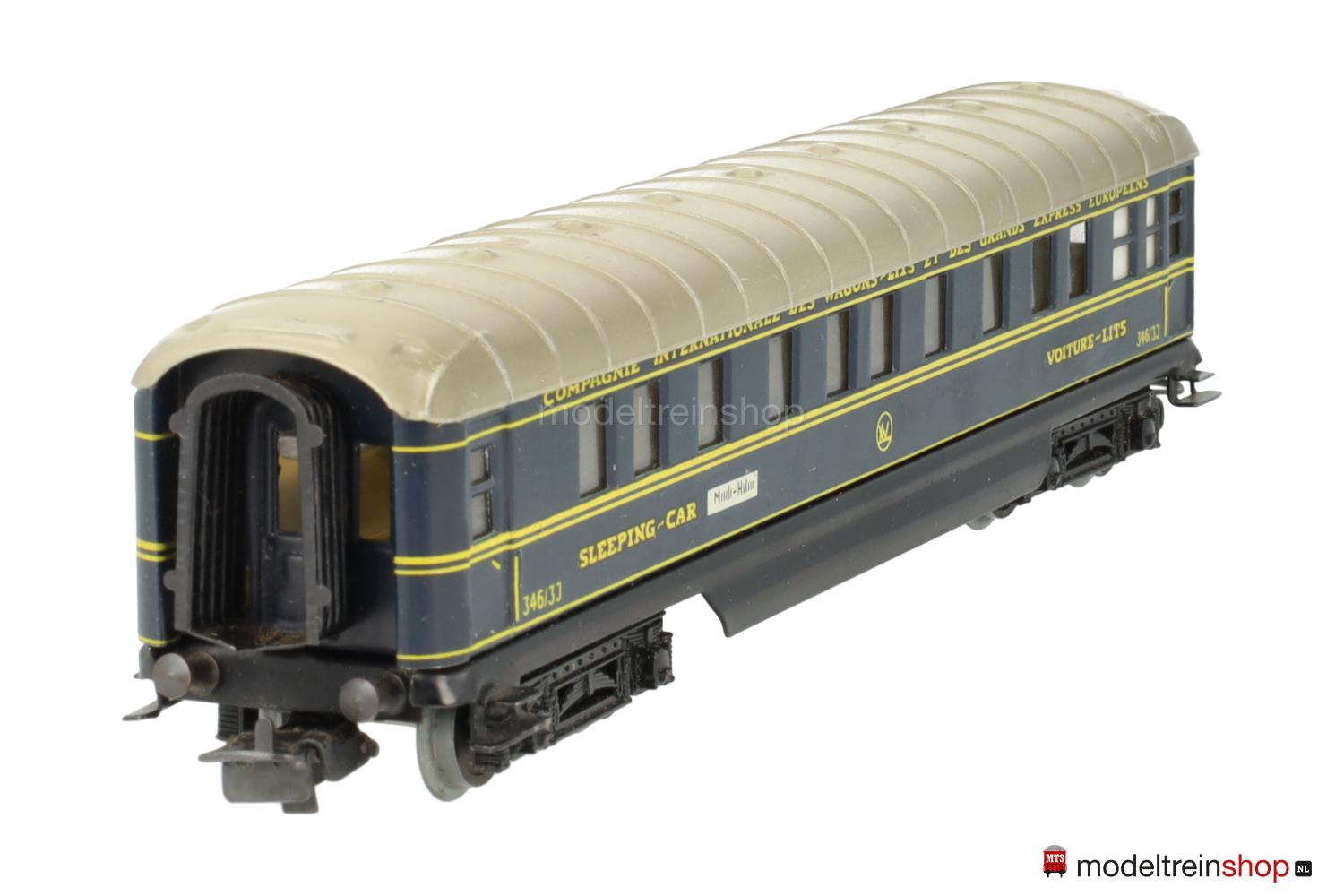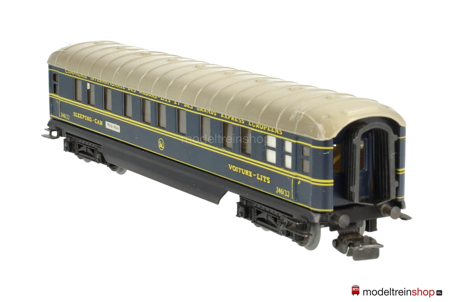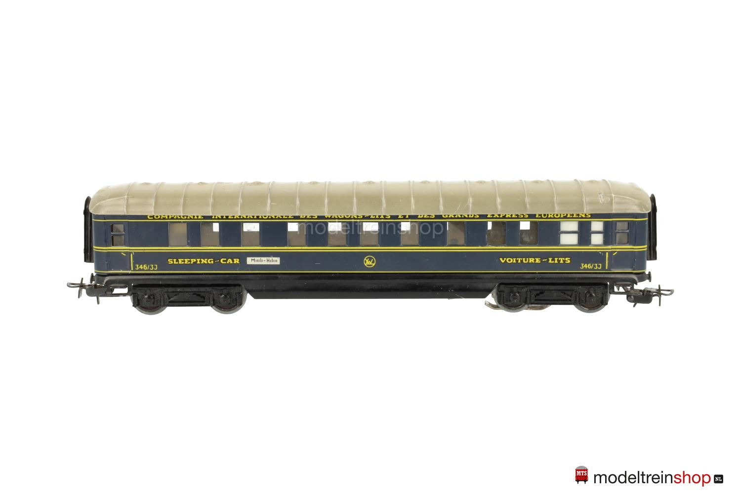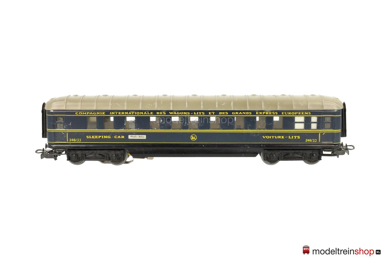 Schwarzes Blech-Untergestell, Görlitzer Drehgestelle. Blech-Aufbau: blauer Wagenkasten, beigegraues Dach mit Querstreben (Farben in verschiedenen Nuancen ausgeliefert), gelbe Zierstreifen und Aufschriften – u.a.: “SLEEPING-CAR” / “VOITURE-LITS” / “346/3 J” und CIWL-Embleme, Aufschriften der Zuglaufschilder nicht lesbar, Fenster mit Cellonscheiben hinterlegt, Faltenbalgübergänge.
