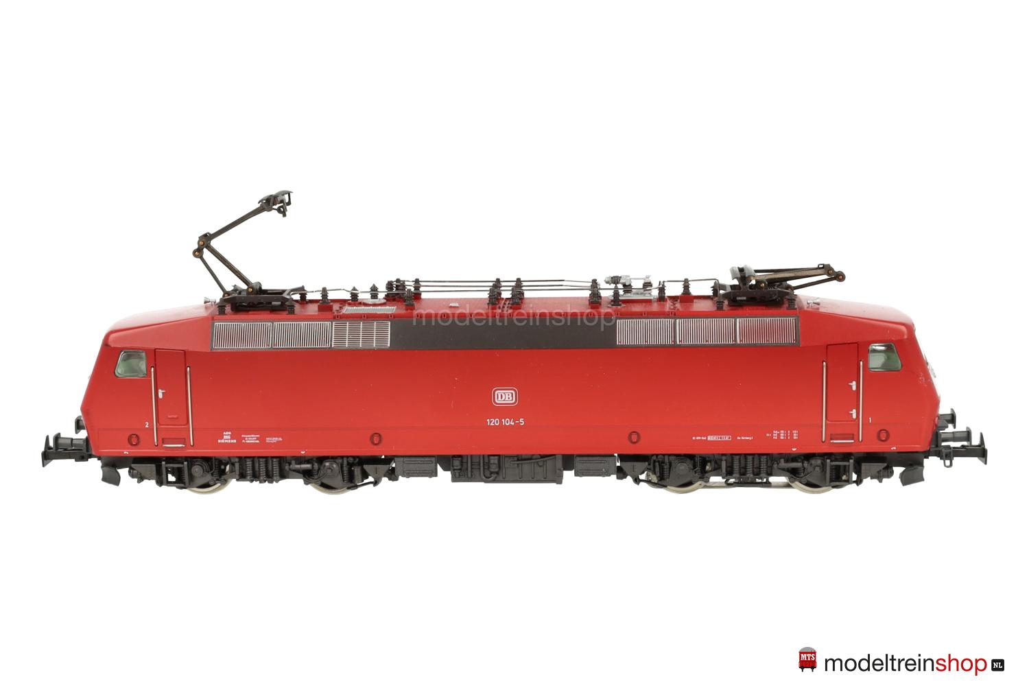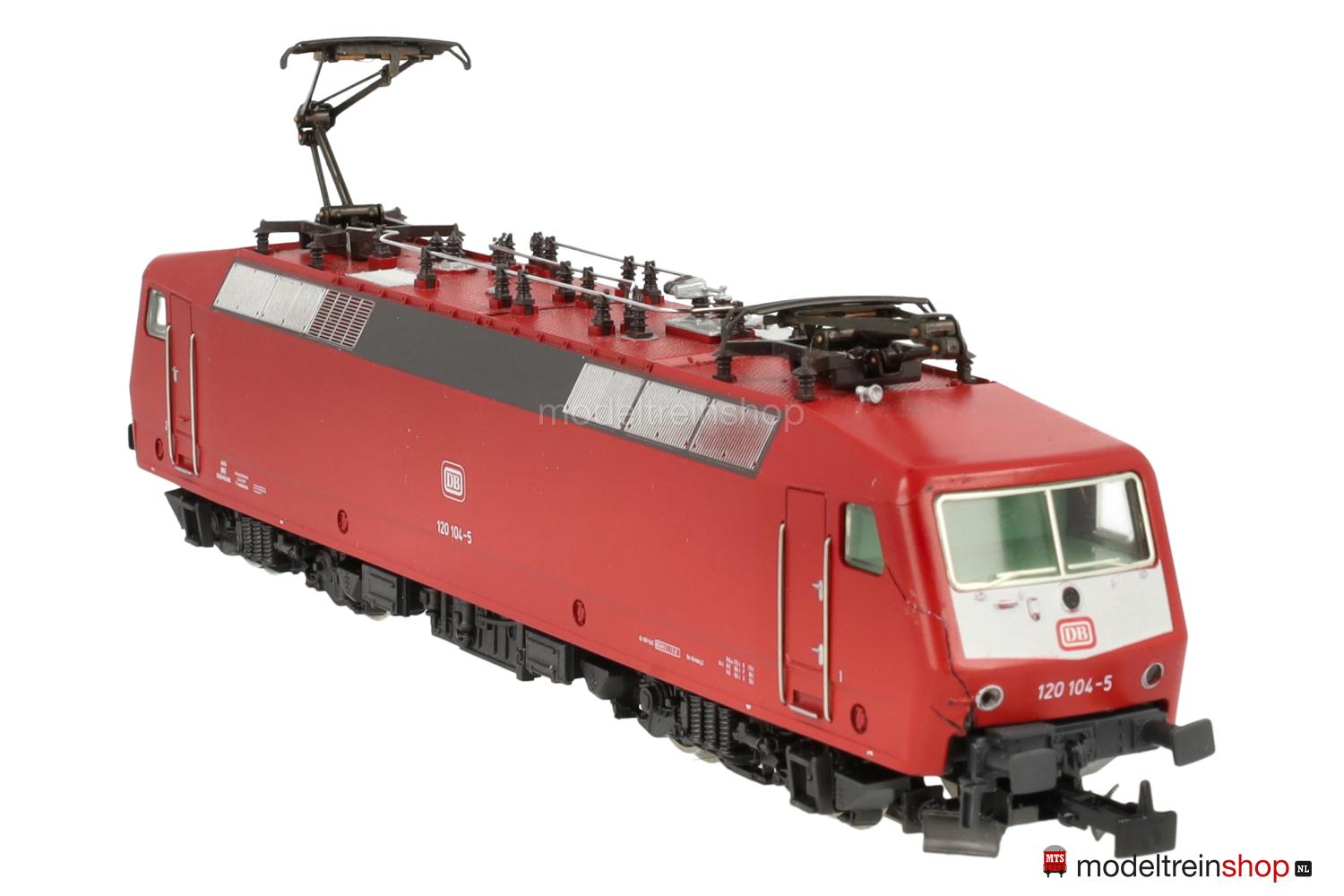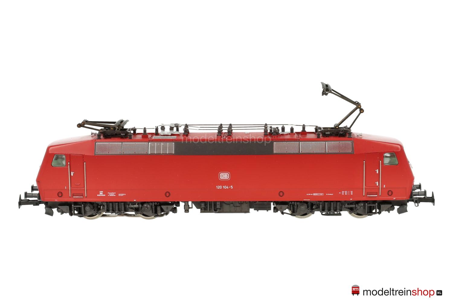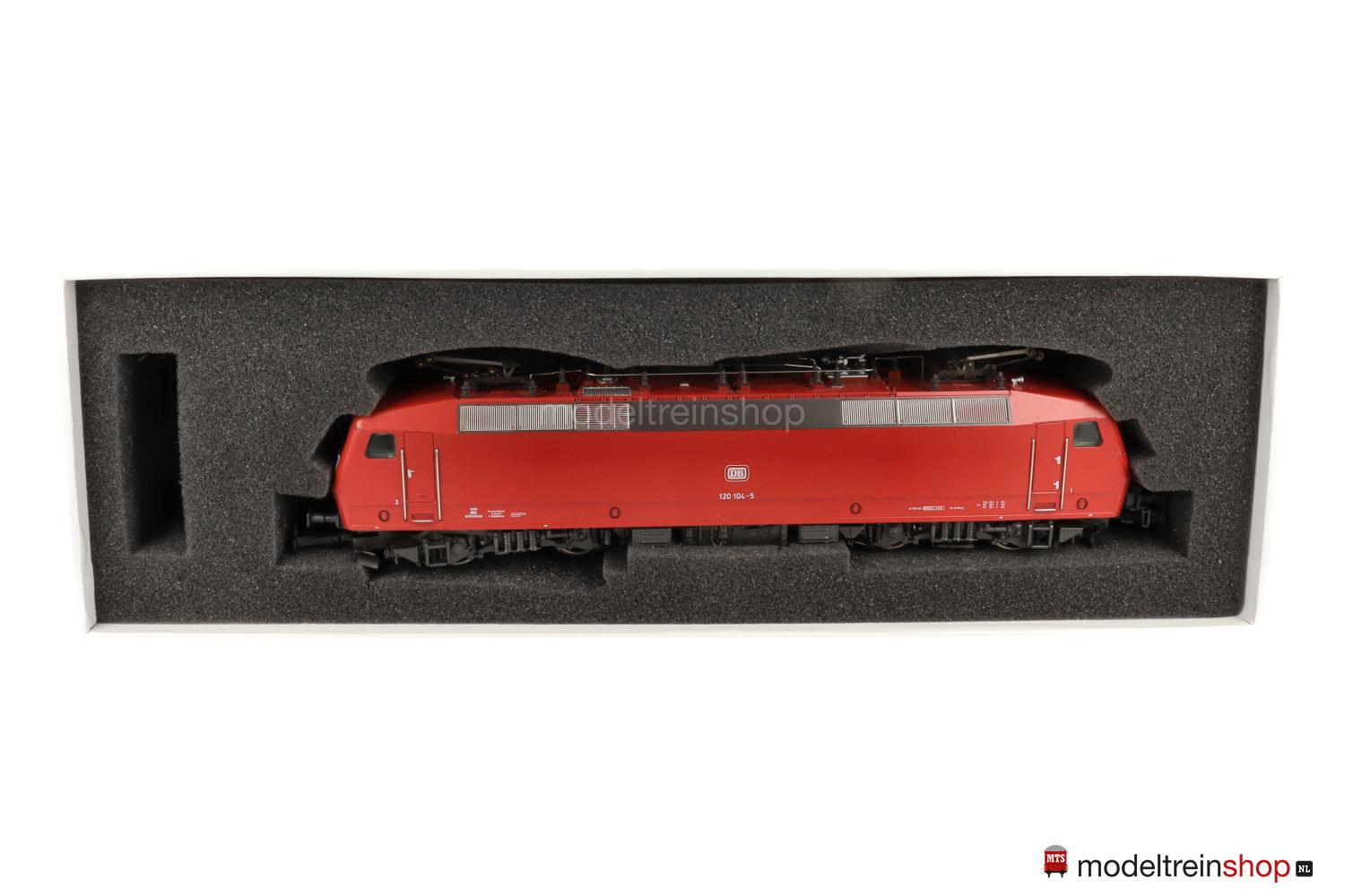 Achsfolge Bo’ Bo’. Gußfahrgestell, ein angetriebenes Drehgestell, anthrazitfarbenes Fahrwerk, Hochleistungs-Antrieb. Orientrotes Kunststoffgehäuse mit weißen Stirnflächen, weiße und rote DB-Embleme, weiße Aufschriften, Betriebs-Nr.: 120 104-5, Lüftergitter graphitgrau, eingesetzte Fenster, angesetzte Griffstangen. Dreilicht-Spitzensignal beidseitig, Lichtwechsel mit Fahrtrichtungsänderung.