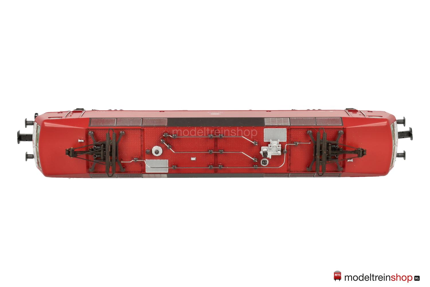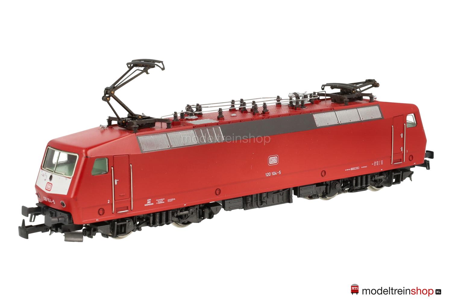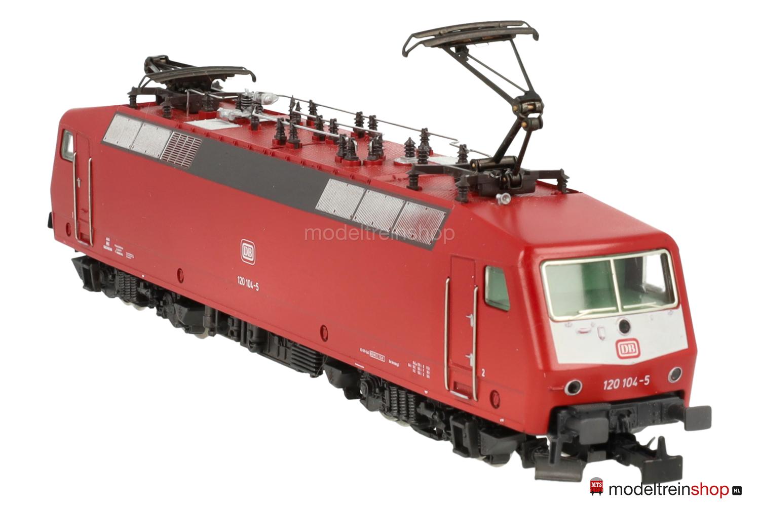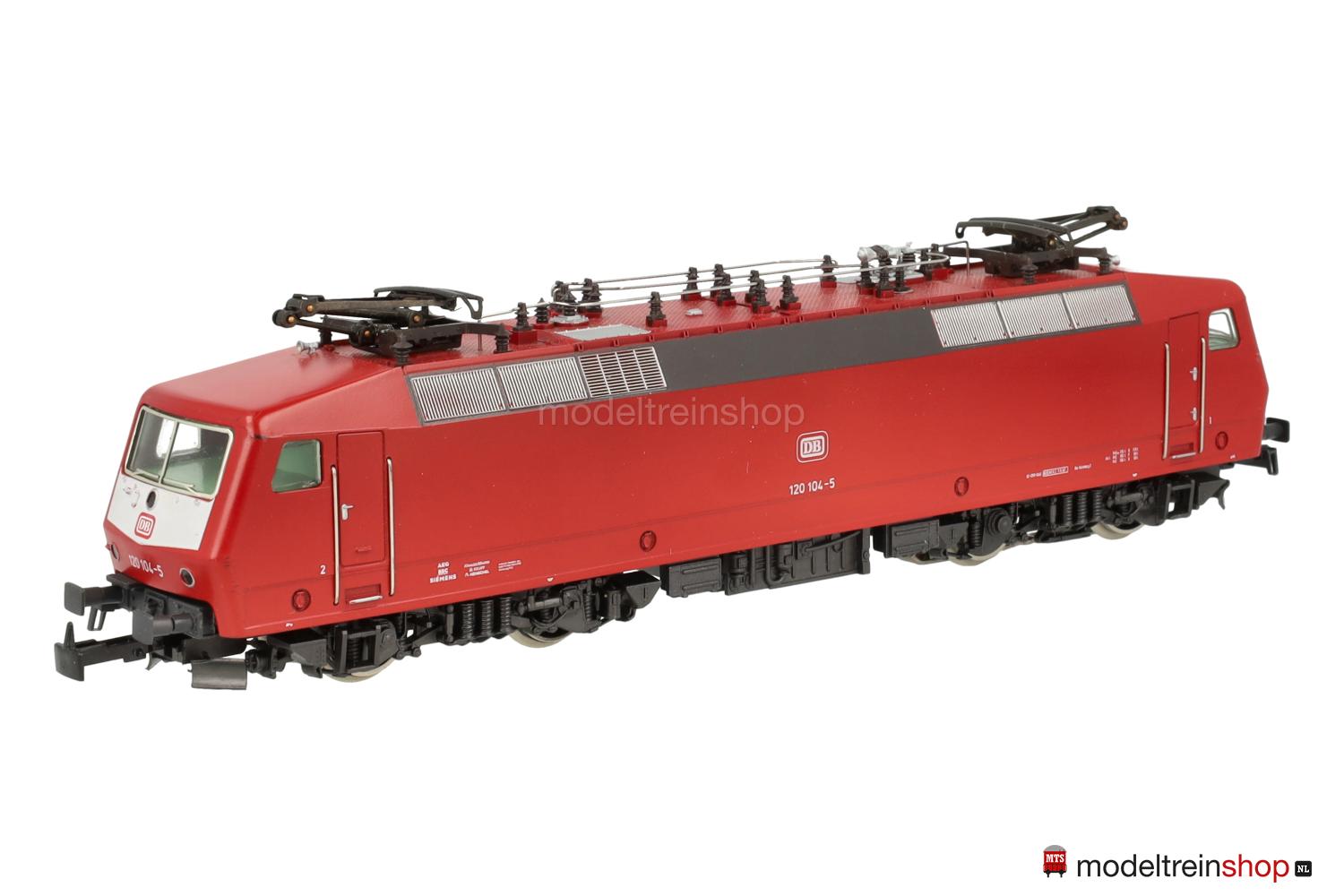 Achsfolge Bo’ Bo’. Gußfahrgestell, ein angetriebenes Drehgestell, anthrazitfarbenes Fahrwerk, Hochleistungs-Antrieb. Orientrotes Kunststoffgehäuse mit weißen Stirnflächen, weiße und rote DB-Embleme, weiße Aufschriften, Betriebs-Nr.: 120 104-5, Lüftergitter graphitgrau, eingesetzte Fenster, angesetzte Griffstangen. Dreilicht-Spitzensignal beidseitig, Lichtwechsel mit Fahrtrichtungsänderung.