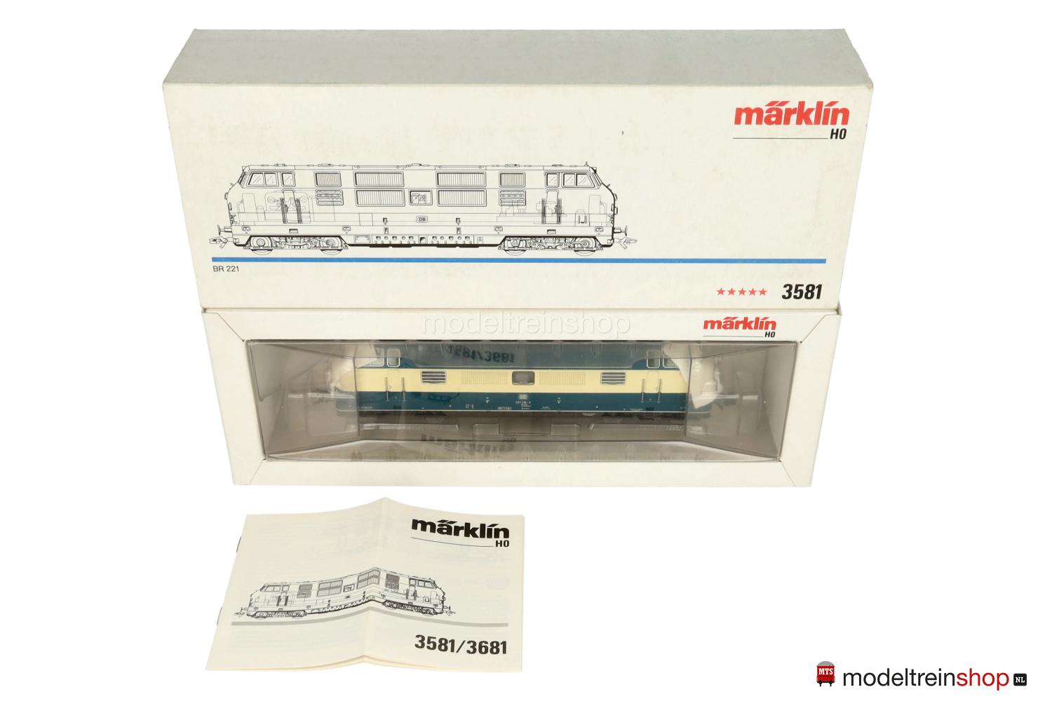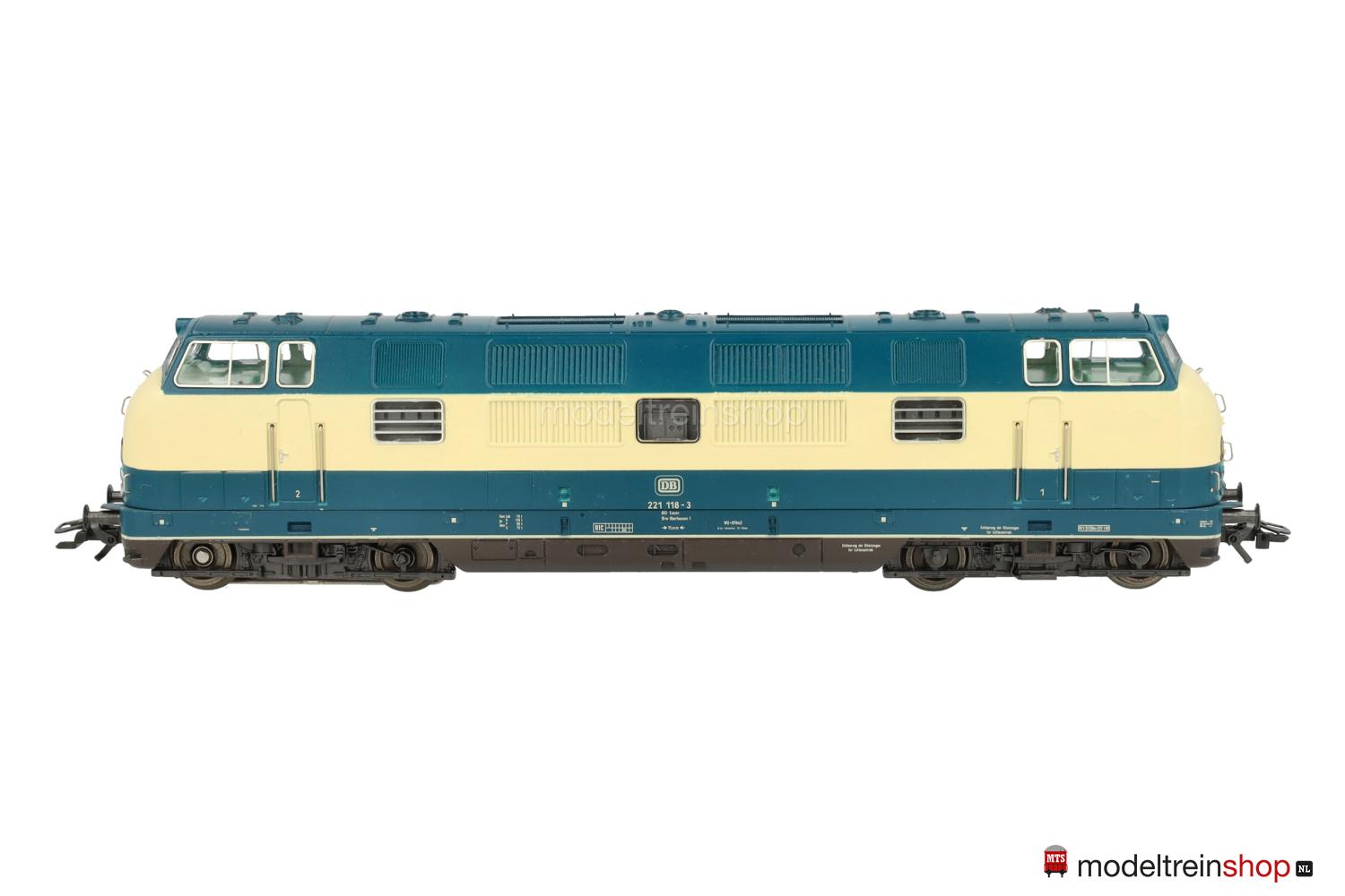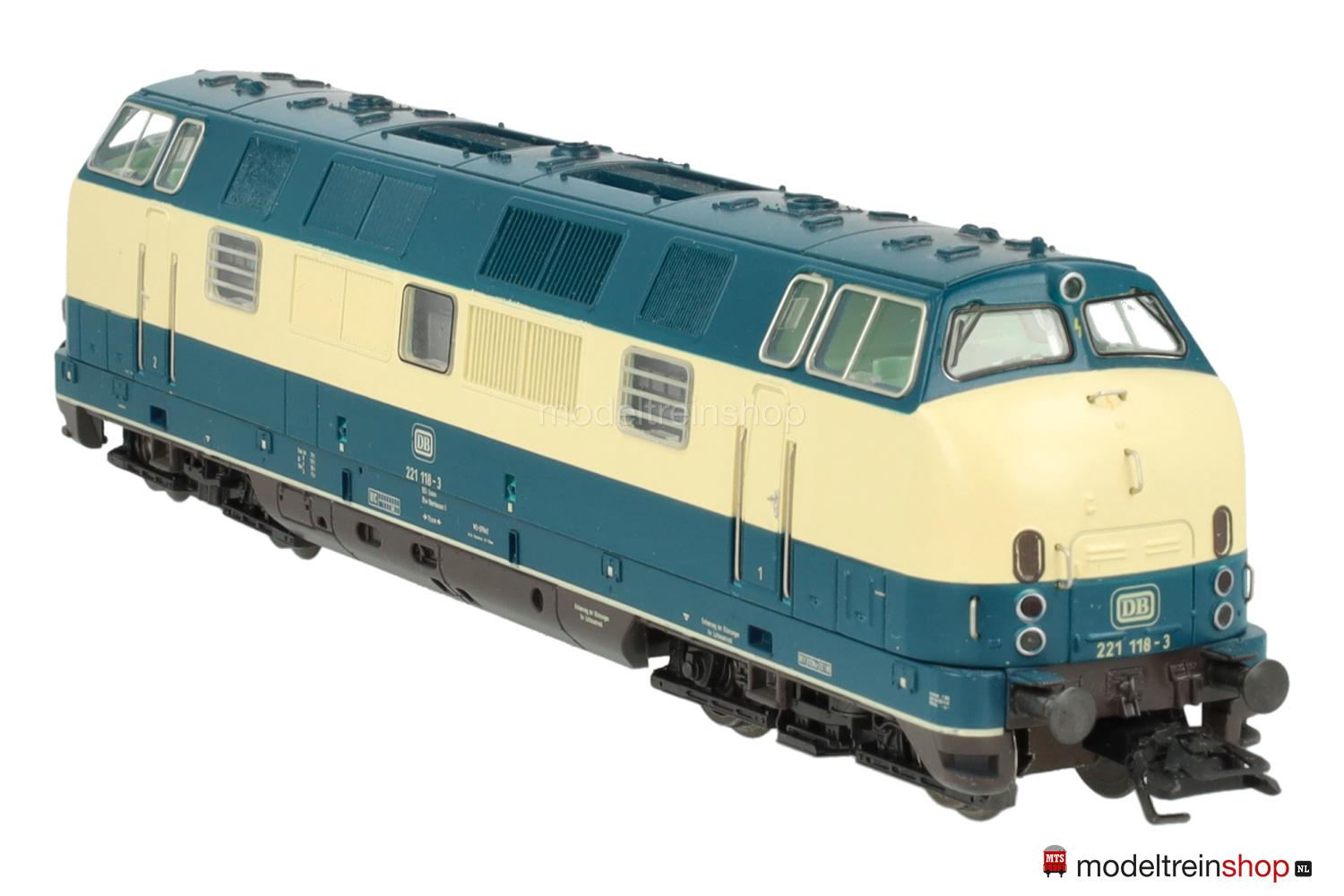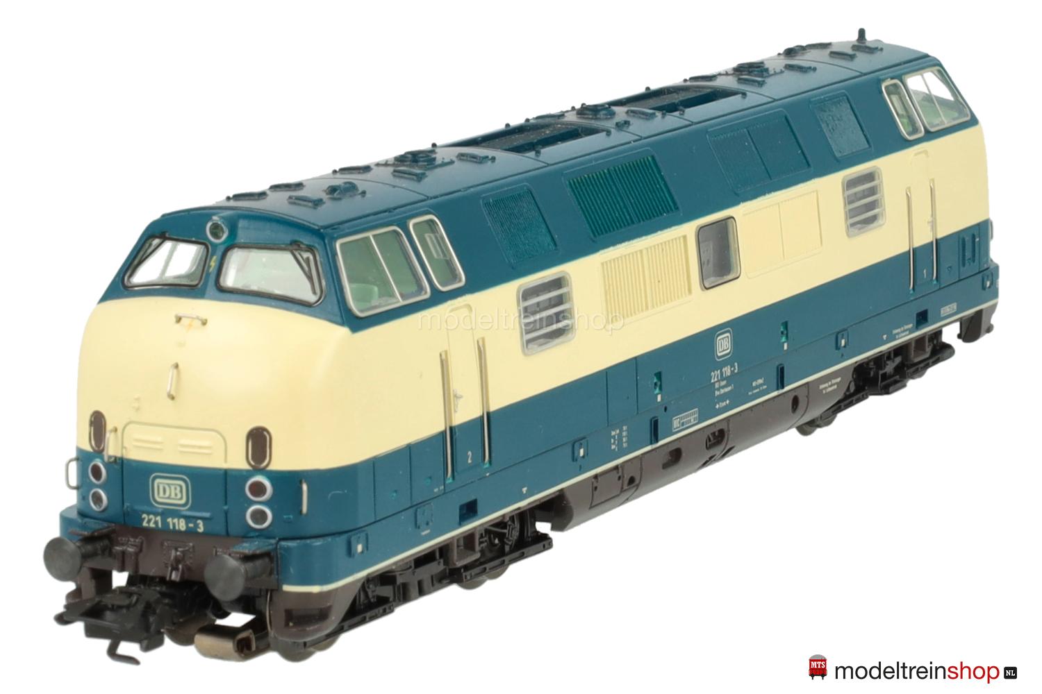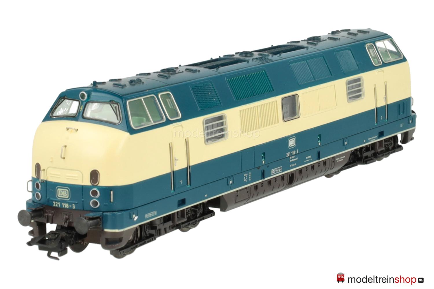 Dunkelgrau/ozeanblaues Fahrgestell. Ozeanblau/beigefarbenes Gehäuse, Dach und Fensterband ozeanblau, Dach-Oberseite schattiert, weiße Zierlinien, weiße Aufschriften, Betriebs-Nr.: 221 118-3, weiße DB-Embleme