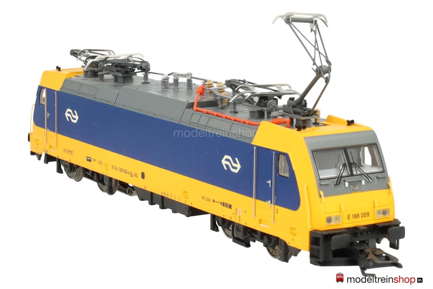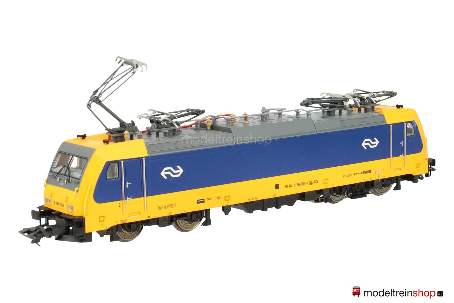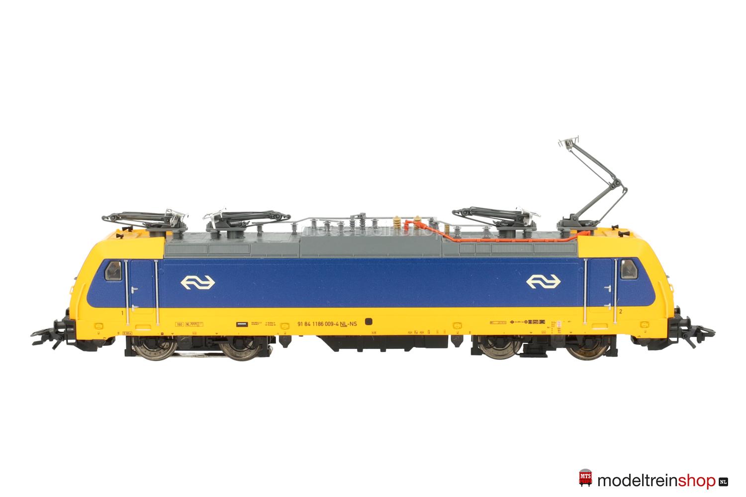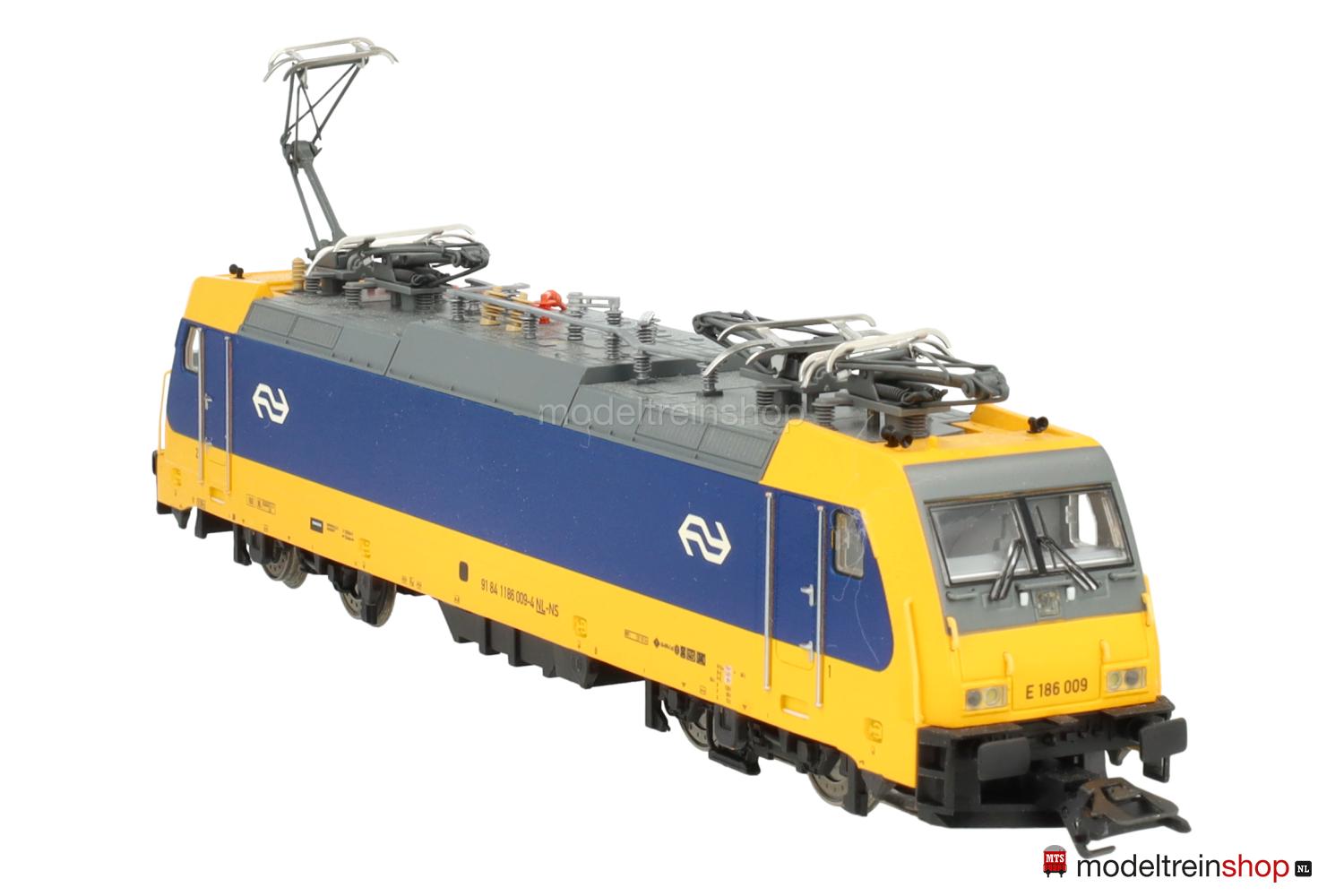 Achsfolge Bo’ Bo’. Schwarzes Gußfahrgestell, zwei schwarze angetriebene Drehgestelle. Dahliengelbes Gußgehäuse, eingesetzte Fenster, angesetzte Griffstangen und Haltegriffe, graues Dach, schwarze Signalhörner, mehrfarbige Dachleitungen, Führerstandseinrichtung. Betriebs-Nr.: 1186 009-4, schwarze Aufschriften, Führerstandskennzeichnung “1” und “2”, kobaltblaue Fläche mit weißen NS-Enblemen. Mfx-Decoder.LED-Dreilicht-Spitzensignal und 2 rote Schlusslichter, Lichtwechsel weiß/rot bei Fahrtrichtungsänderung. Weitere Digitalfunktionen: Ankuppelgeräusch, Betriebsgeräusch 1, Betriebsgeräusch 2, Bremsenquietschen aus, Dampf/Druckluft ablassen, Direktsteuerung, E-Lok-Fahrgeräusch, Lüfter, Rangierpfiff, Schaffnerpfiff, Schienenstoß, Signalhorn, Spitzensignal, Spitzensignal Lokseite 1.