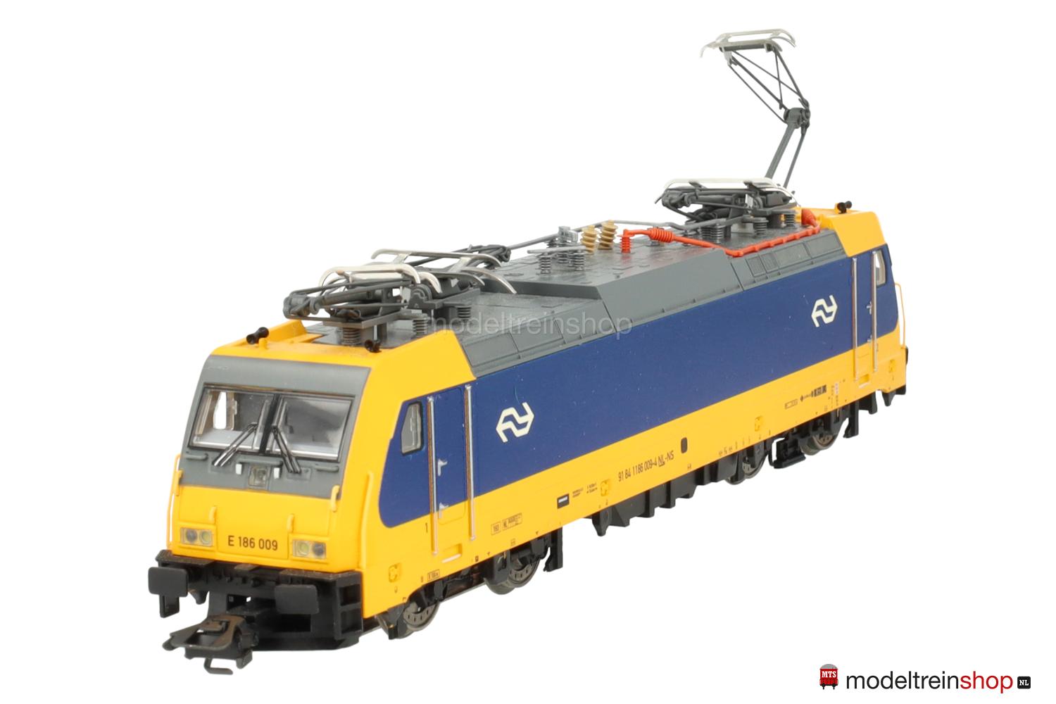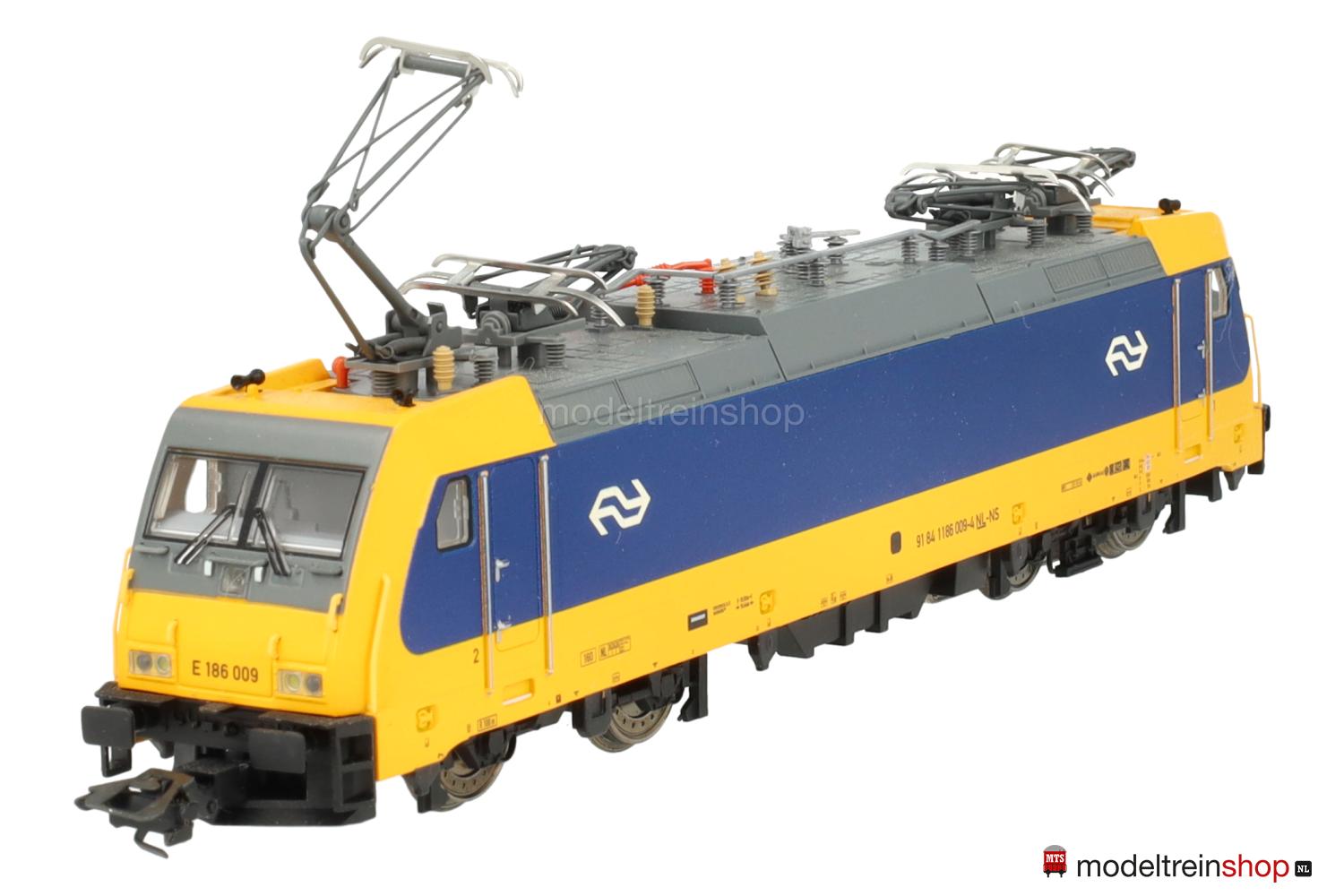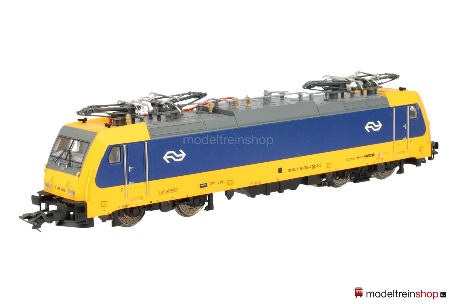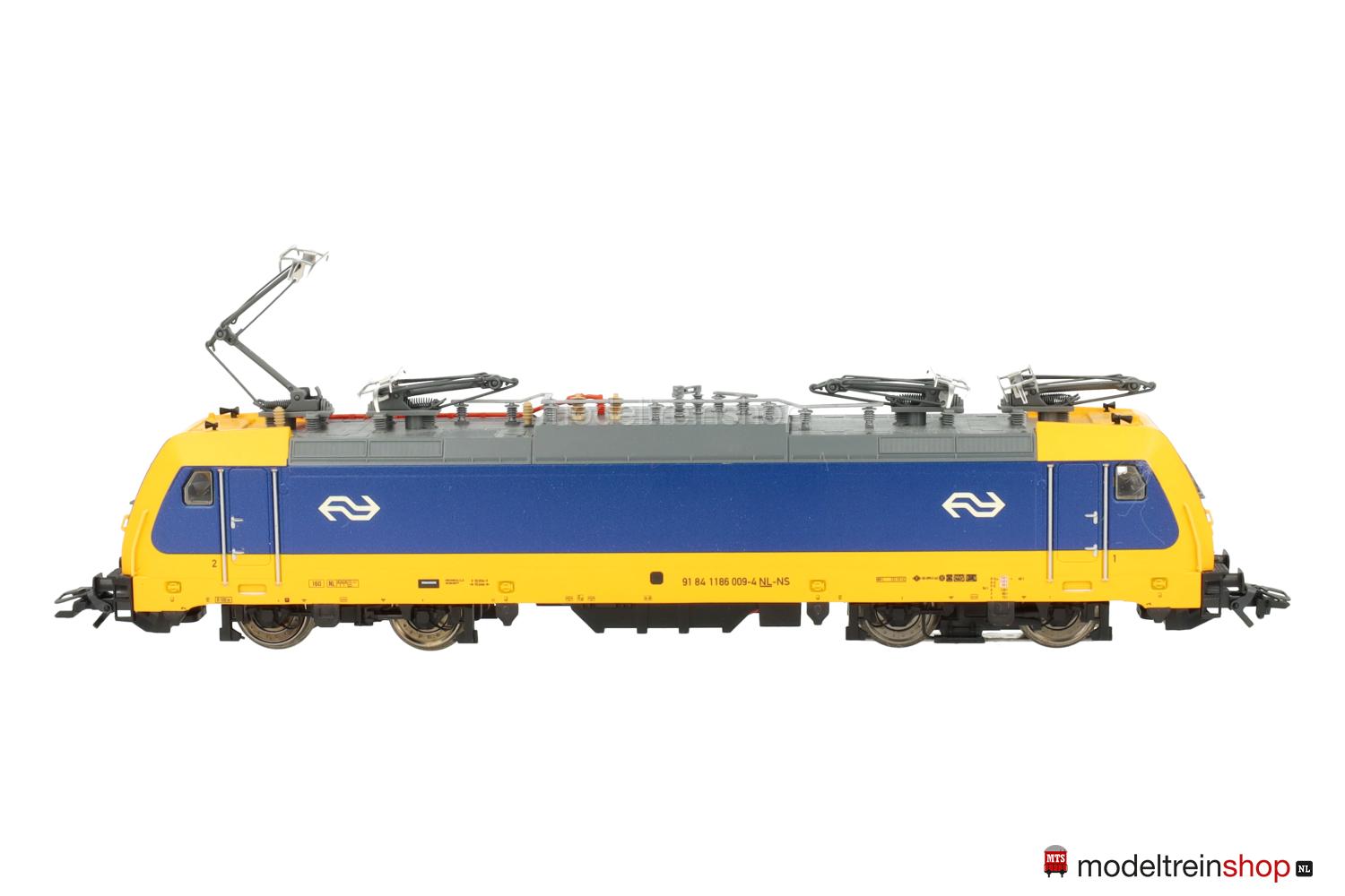 Achsfolge Bo’ Bo’. Schwarzes Gußfahrgestell, zwei schwarze angetriebene Drehgestelle. Dahliengelbes Gußgehäuse, eingesetzte Fenster, angesetzte Griffstangen und Haltegriffe, graues Dach, schwarze Signalhörner, mehrfarbige Dachleitungen, Führerstandseinrichtung. Betriebs-Nr.: 1186 009-4, schwarze Aufschriften, Führerstandskennzeichnung “1” und “2”, kobaltblaue Fläche mit weißen NS-Enblemen. Mfx-Decoder.LED-Dreilicht-Spitzensignal und 2 rote Schlusslichter, Lichtwechsel weiß/rot bei Fahrtrichtungsänderung. Weitere Digitalfunktionen: Ankuppelgeräusch, Betriebsgeräusch 1, Betriebsgeräusch 2, Bremsenquietschen aus, Dampf/Druckluft ablassen, Direktsteuerung, E-Lok-Fahrgeräusch, Lüfter, Rangierpfiff, Schaffnerpfiff, Schienenstoß, Signalhorn, Spitzensignal, Spitzensignal Lokseite 1.