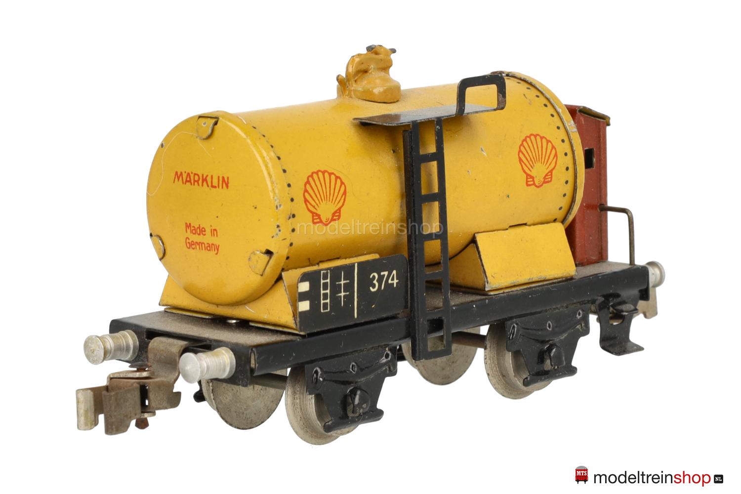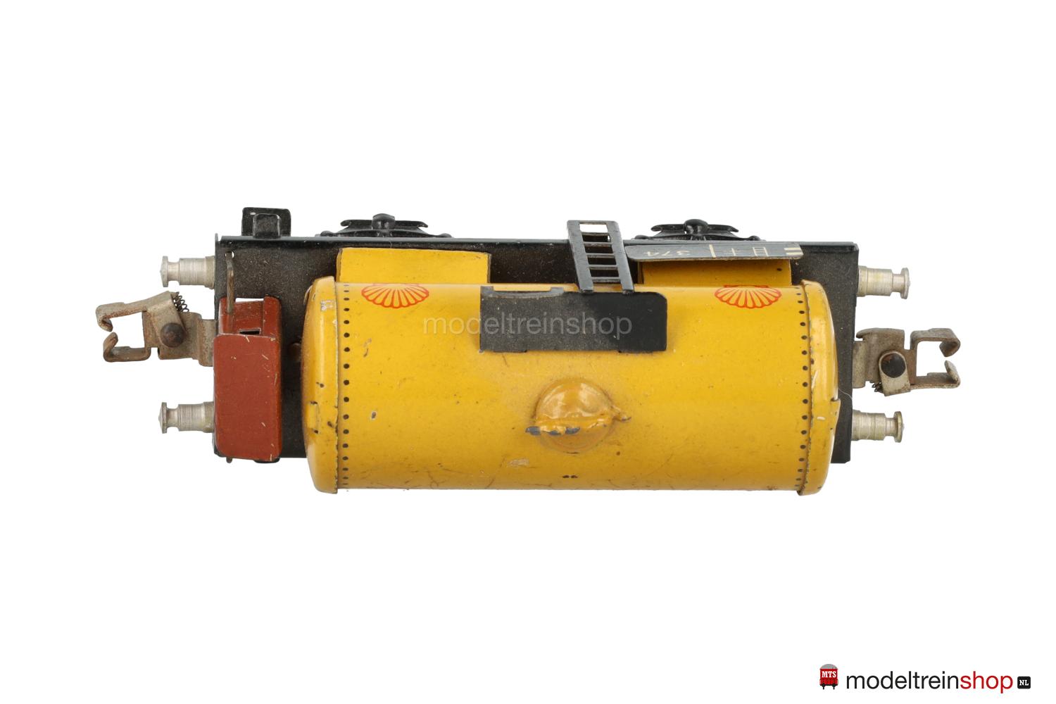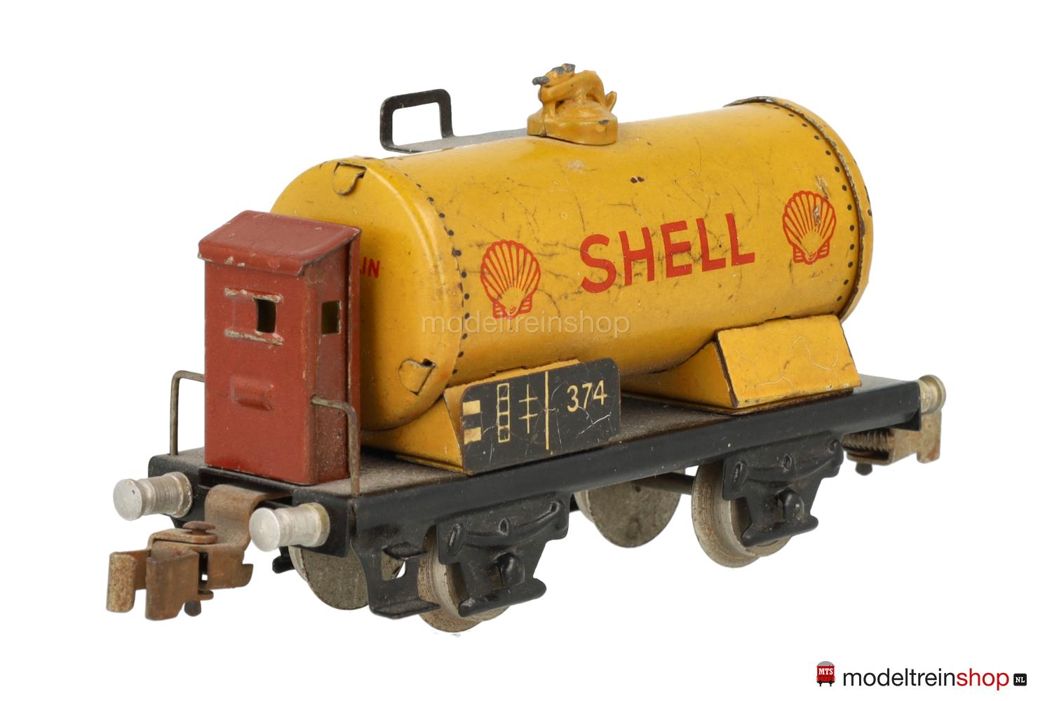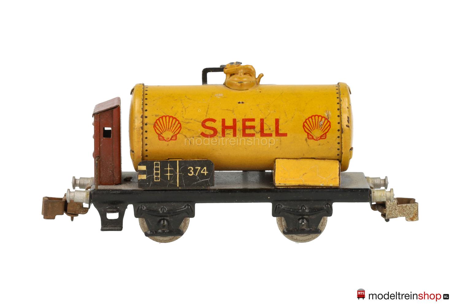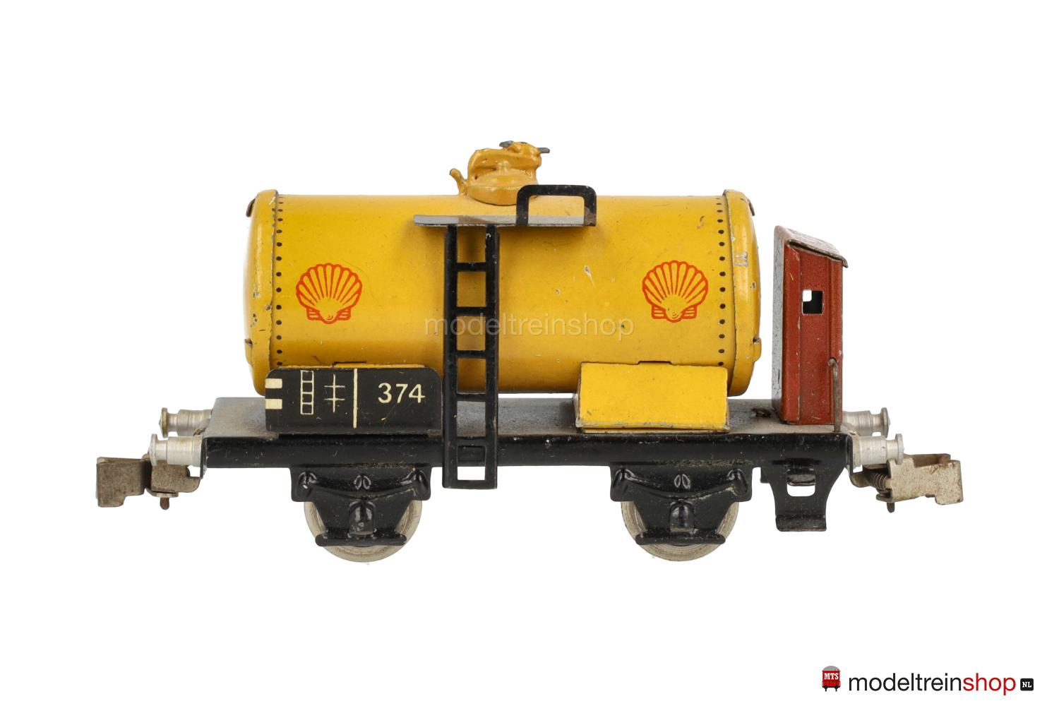 Schwarzes Blech-Untergestell mit Trittstufen und Geländer am Bremserhaus, Radsätze mit Stummelachsen. Gelber Blech-Kessel, rote SHELL-Embleme, braunes Bremserhaus (in verschiedenen Farbnuancen ausgeliefert), Leiter und Laufsteg aus Metall, Gattungsschilder mit Aufschrift “374”.