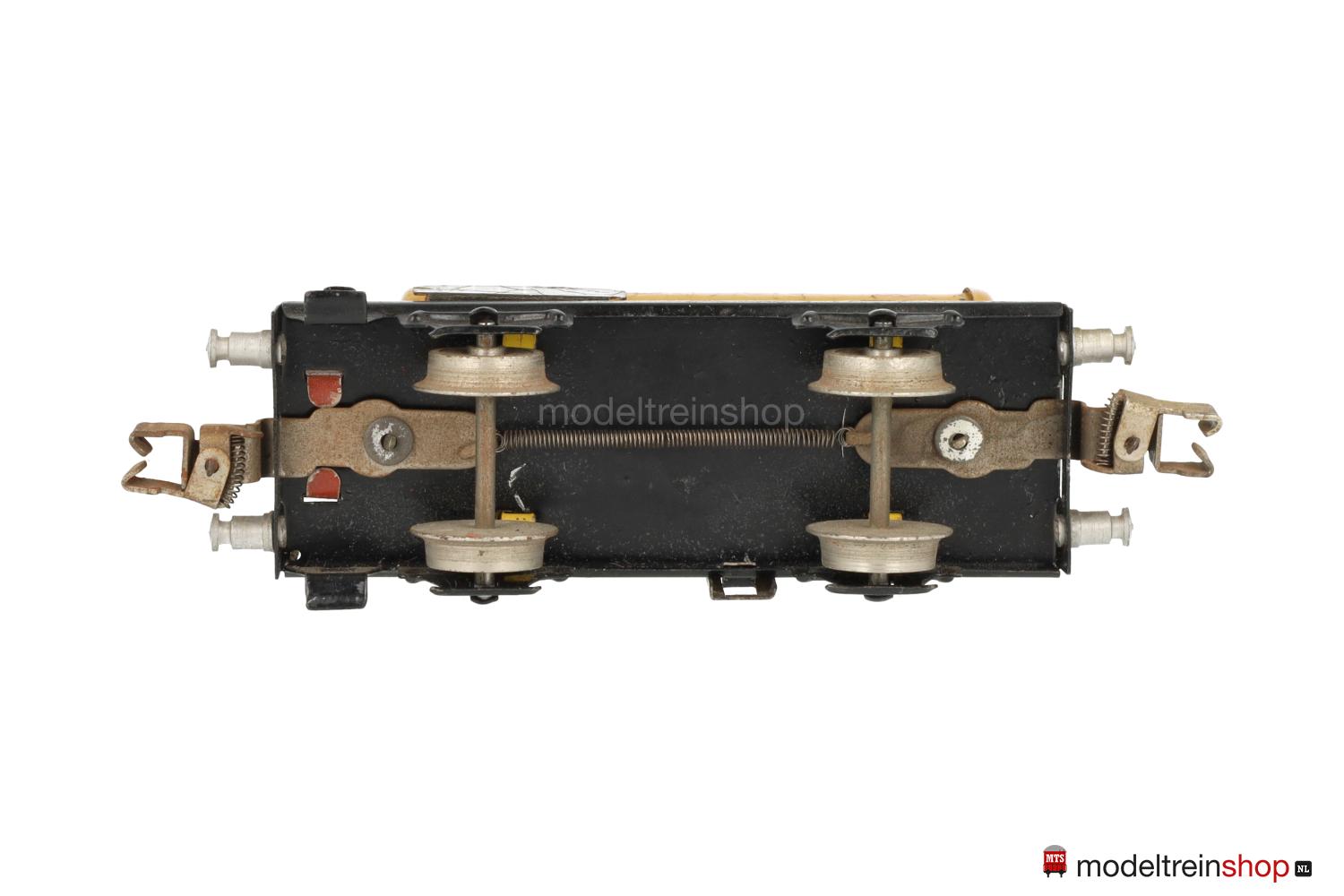 Achslager mit vier Federblättern, schwarze Puffer, ab 1950 Bodenprägung: “MÄRKLIN Germany”. Kessel-Strinseiten ohne Aufschriften, Einfüllstutzen wieder gelb, rotbraunes Bremserhaus.
