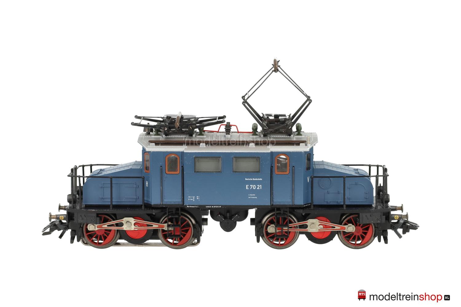 Achsfolge B’ B’. Schwarzes Gußfahrgestell, zwei Achsen und eine Blindwelle angetrieben, Digital-Hochleistungs-Antrieb. Blaues Gußgehäuse, silberfarbenes Dach, weiße Aufschriften, Betriebs-Nr.: E 70 21, eingesetzte Fenster – an den Ecken und Türen mit braunen Rahmen, angesetzte Griffstangen und Bühnengeländer. Digital-Decoder, Dreilicht-Spitzensignal beidseitig, Lichtwechsel mit Fahrtrichtungsänderung. Spitzensignal digital schaltbar.
