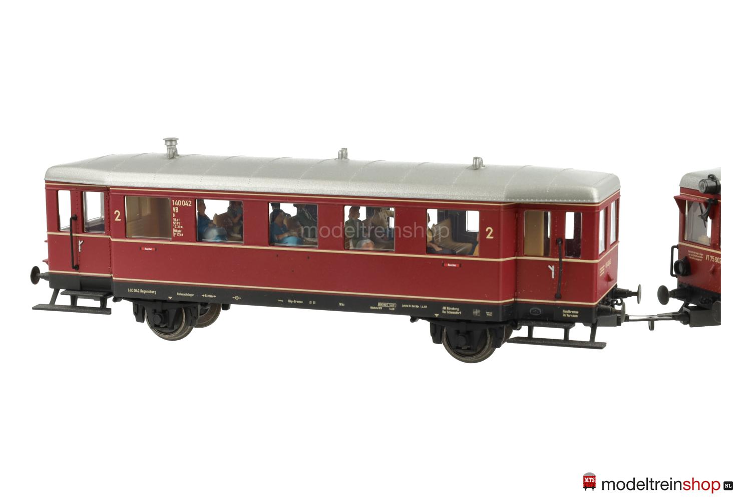 2-delig dieseltreinstel bestaande uit motorrijtuig serie VT 75.9 en aanhangrijtuig serie VB 140, 2e klas, van de Deutsche Bundesbahn (DB). Purperrode basiskleur. Cabines van het motorrijtuig voorzien van zonnekappen en op elke cabine een tyfoon met gebogen hoorn. Dakuitvoering van het motorrijtuig met gemonteerde dakkoelers en aan- en afvoerbuizen en extra bedieningsstangen. Motorrijtuig en aanhangrijtuig met stangenbuffers. Bedrijfsnummers VT 75 902 en VB 140 042. Bedrijfstoestand ca. 1959.