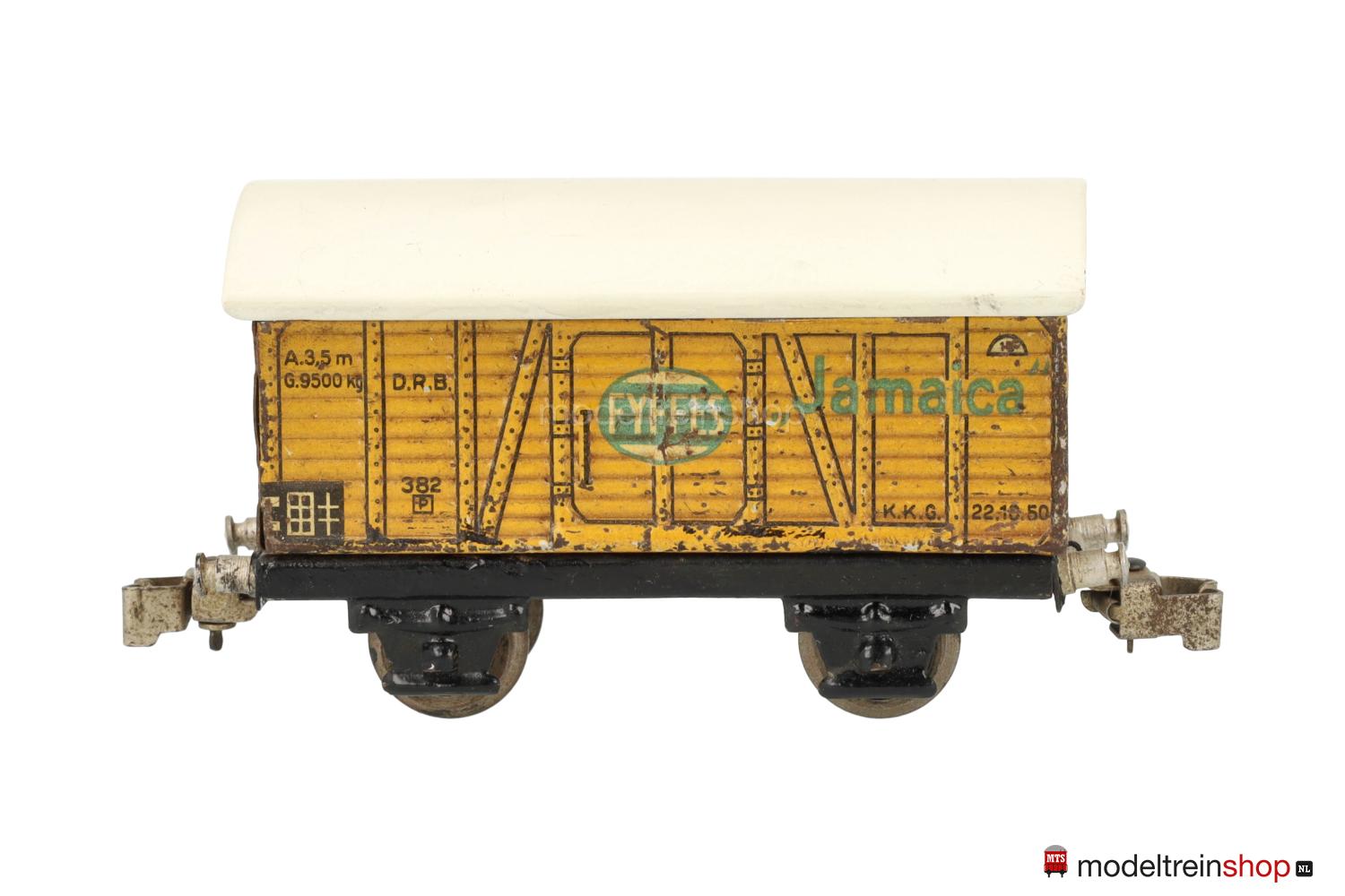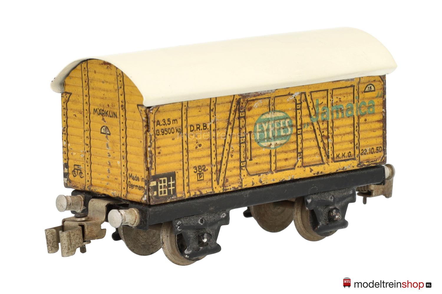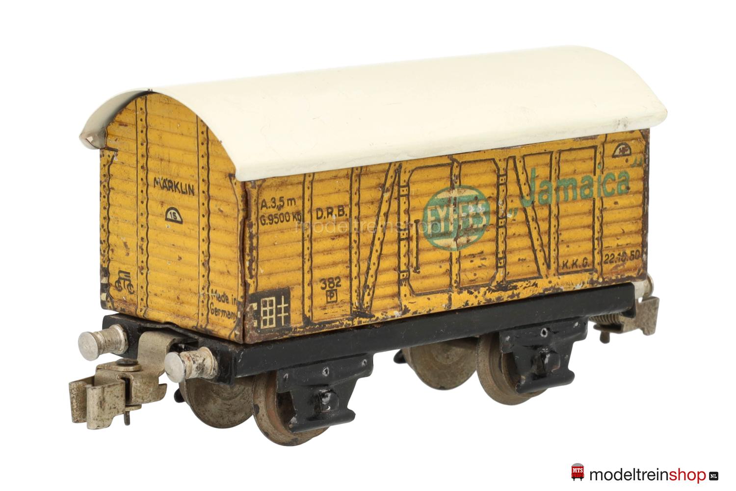 Schwarzes Blech-Untergestell, Radsätze mit Stummelachsen. Blech-Aufbau: gelber Wagenkasten, weißes Dach (Farben in verschiedenen Nuancen ausgeliefert), schwarze Aufschriften – u.a.: “382”, blaue Aufschrift: “Jamaica” und blau/weiße FYFFES-Embleme”, schwarze Stirnseiten-Aufschriften: “MÄRKLIN” und “Made in Germany”, schwarze MÄRKLIN-Embleme.