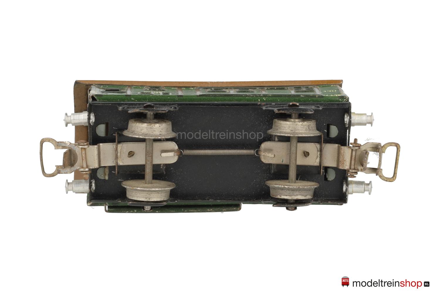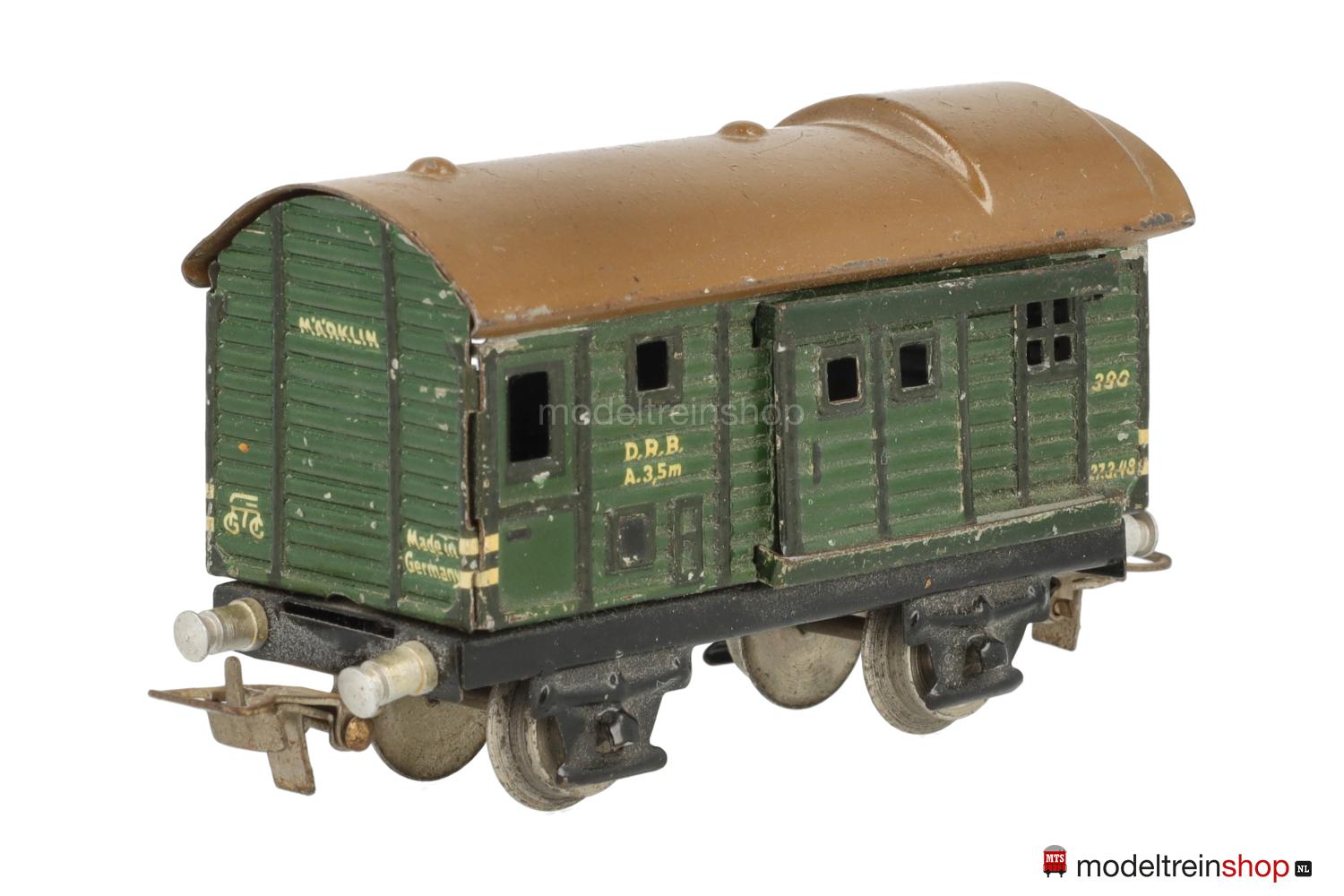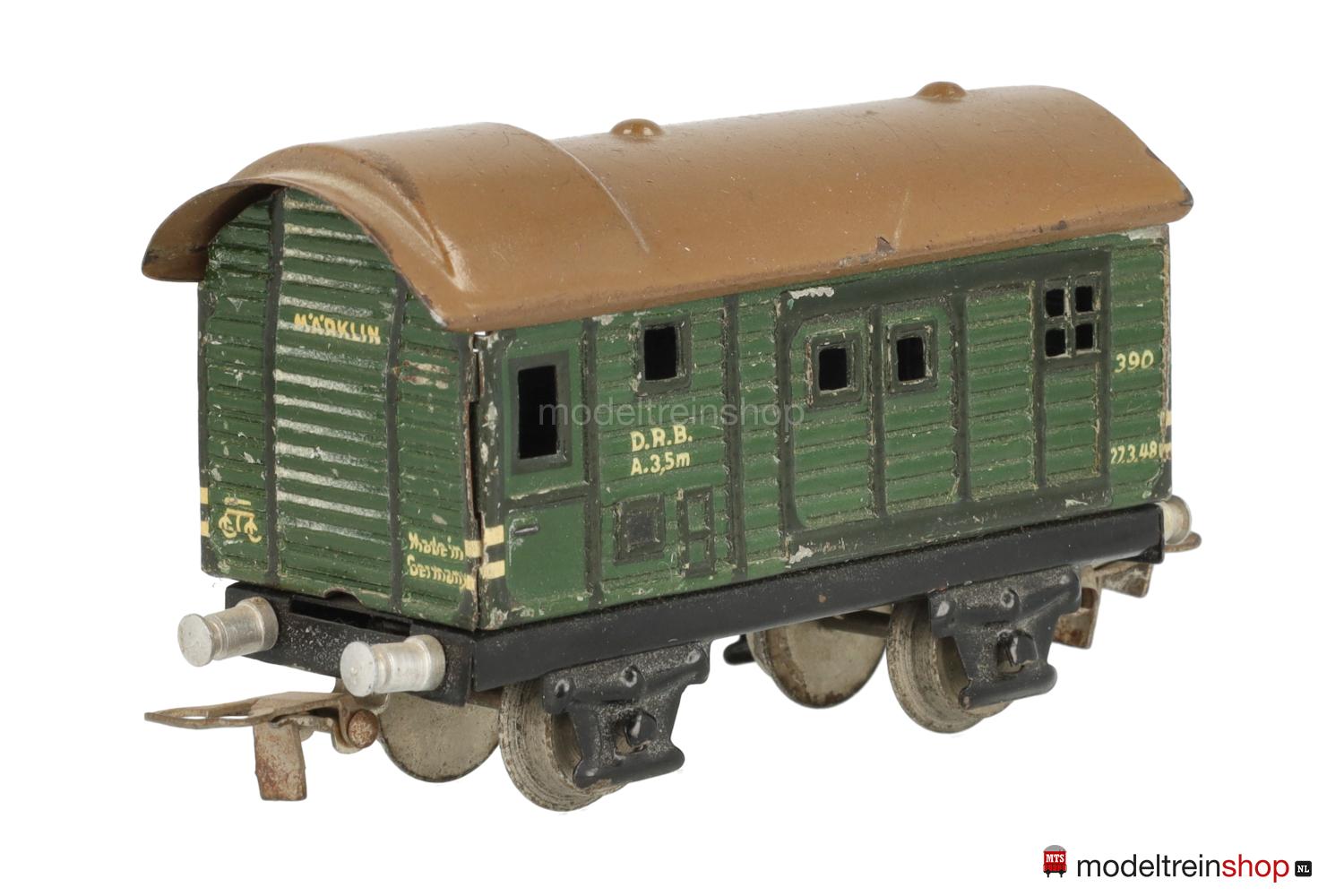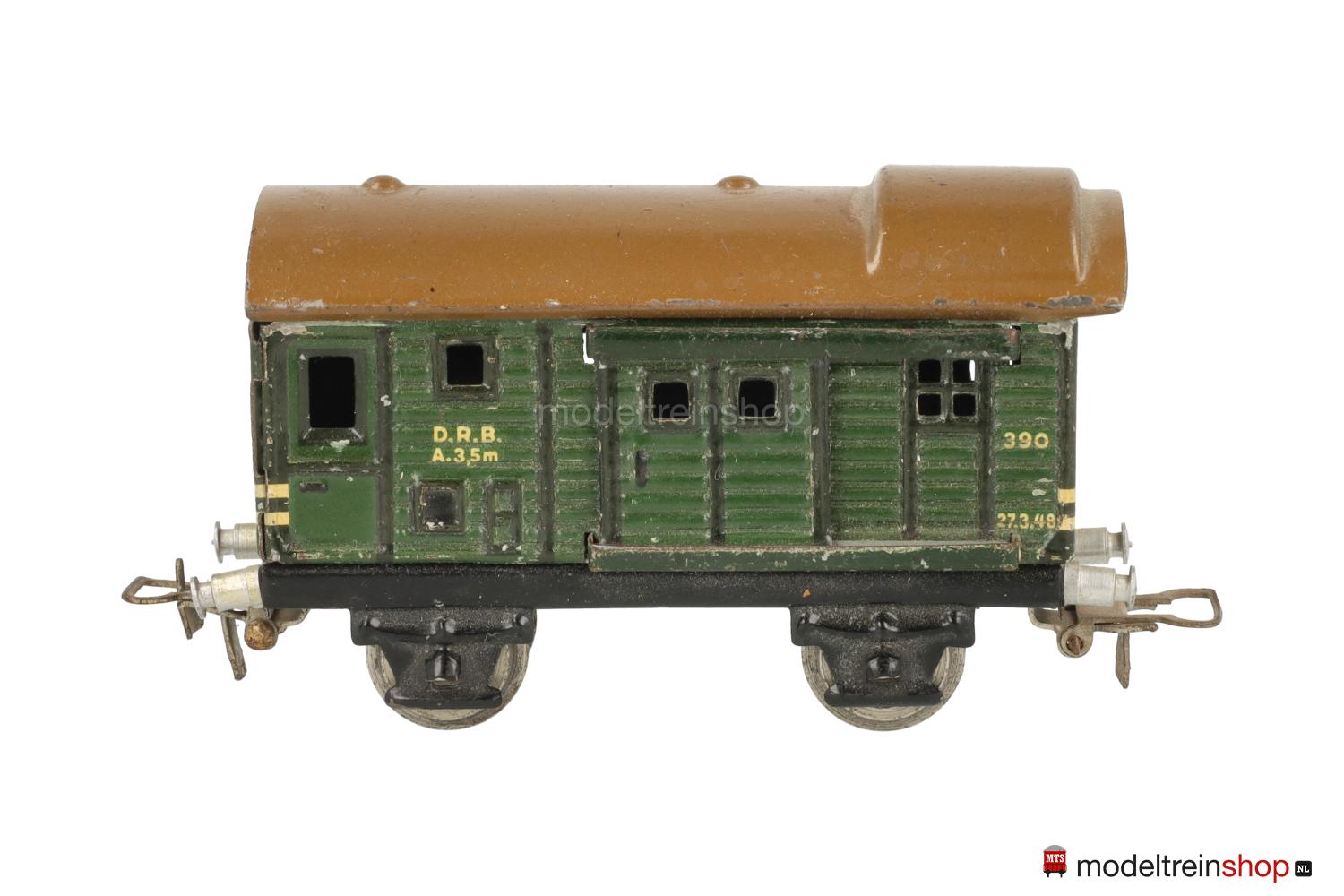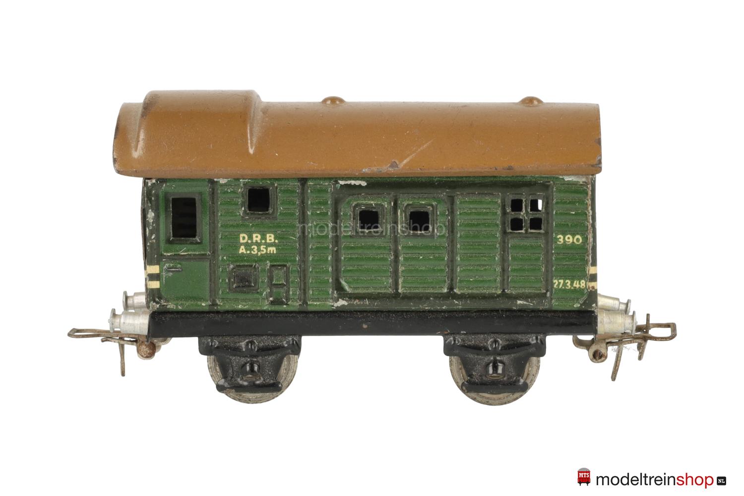 Schwarzes Blech-Untergestell, Radsätze mit Stummelachsen. Blech-Aufbau: dunkelgrüner Wagenkasten, braunes Dach (Farben in verschiedenen Nuancen ausgeliefert), weiße Aufschriften – u.a.: “390”, eine bewegliche Schiebetüre.