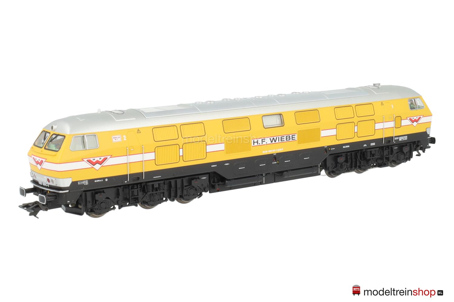 Zware diesellocomotief uit serie 320, met windscherm aan de cabineruiten en zendantenne. Gele basiskleurstelling. Locomotief van de particuliere spoorweg van de firma Wiebe Holding GmbH & Co. KG. Locomotiefbedrijfsnummer 320 001-1. Zoals in gebruik rond 2015.