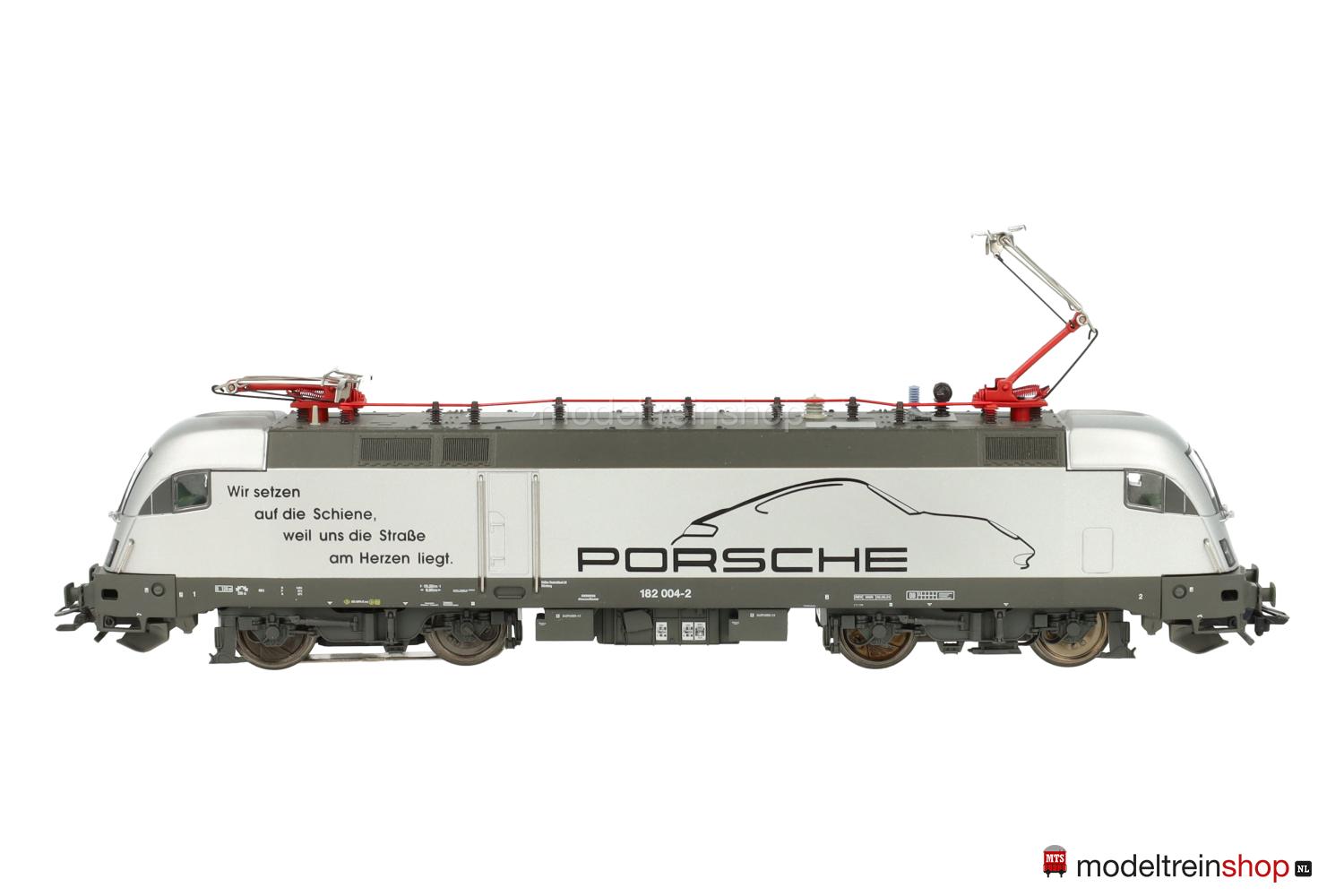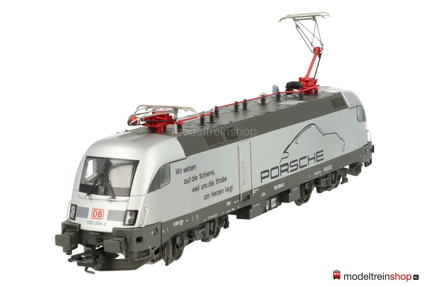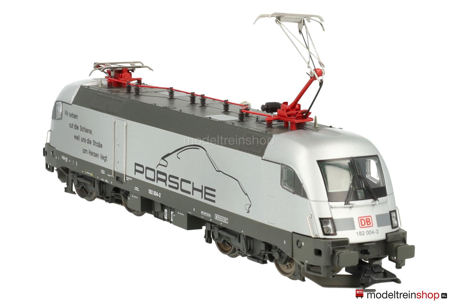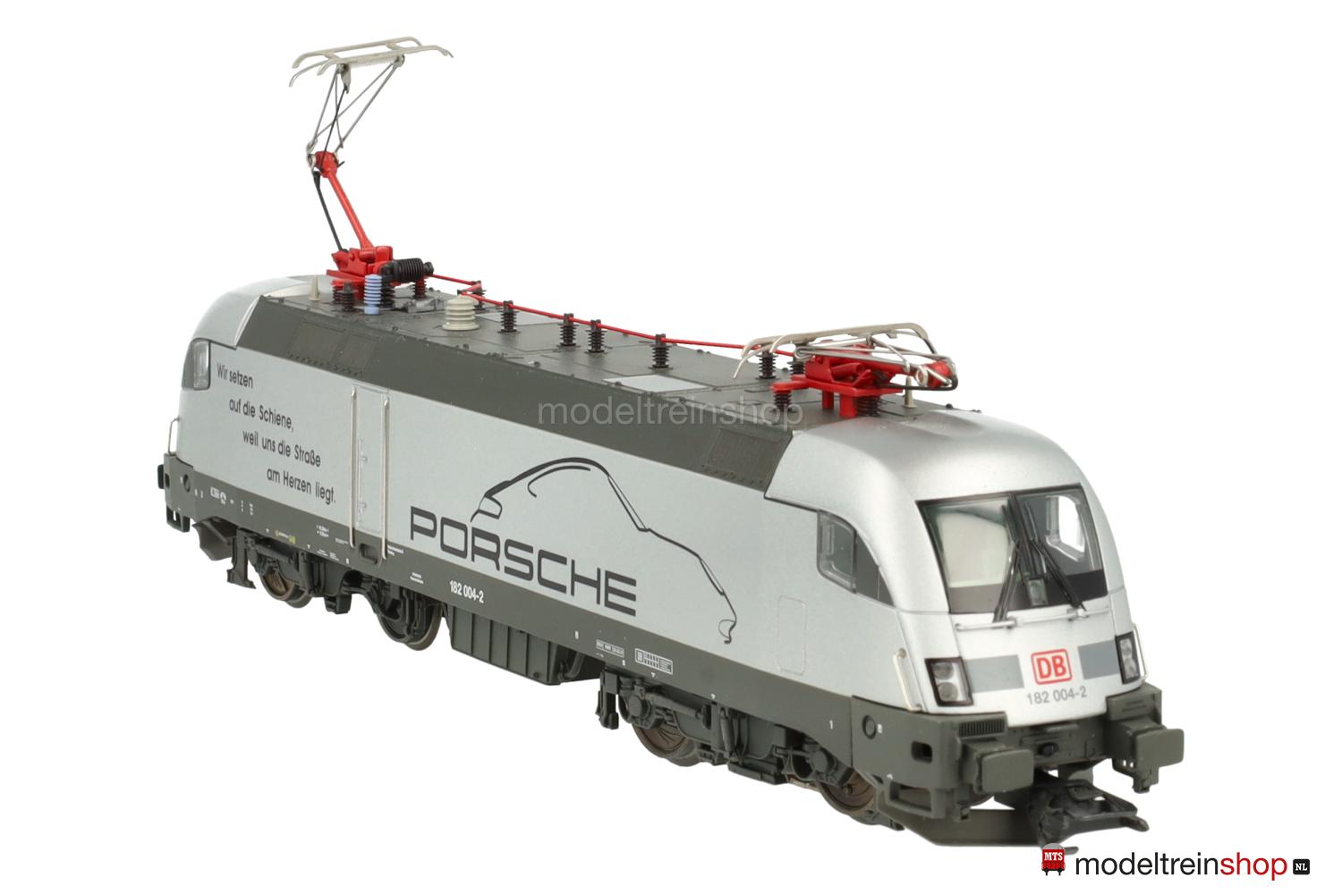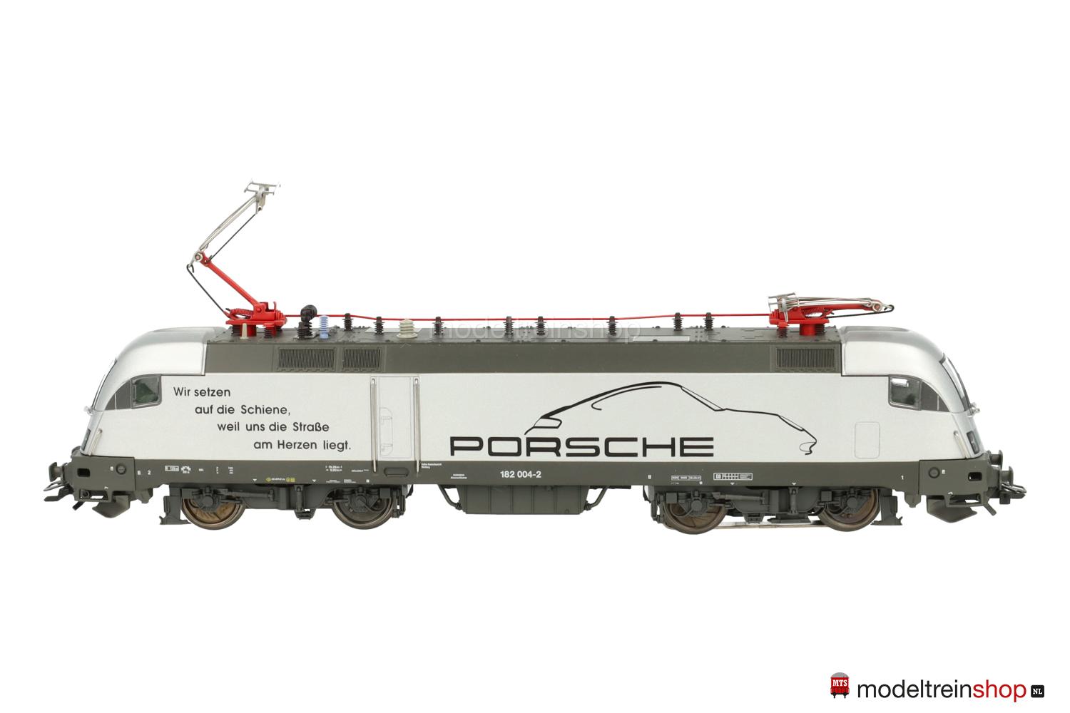 Achsfolge Bo’ Bo’. Anthrazitfarbenes Gußfahrgestell, ein angetriebenes Drehgestell, dunkelgraue Fahrwerke, C-Sinus-Motor. Silberfarbenes Gußgehäuse, dunkelgrauer Rahmen mit weißen Aufschriften, dunkelgraues Dach, filigrane Dachaufbauten. Führerstände mit Inneneinrichtung, eingesetzte Fenster mit schwarzen Rahmen, angesetzte Griffstangen und Handgriffe aus Metall. Betriebs-Nr.: 182 004-2, weiße Aufschriften, schwarze Schriftzüge “Wir setzen auf die Schiene, weil uns die Straße am Herzen liegt.” und “Porsche”, schwarze Silhouette eines Porsches. Mfx-Decoder, Geräuschmodul, beidseitig Dreilicht-Spitzensignal und zwei integrierte Schlußlichter, Lichtwechsel (weiß/rot) bei Fahrtrichtungsänderung. Spitzensignal, Schlußlichter, Fernscheinwerfer, Signalhorn sowie Anfahrbeschleunigung und Bremsverzögerung digital schaltbar. Weitere Zusatzfunktionen digital schaltbar.