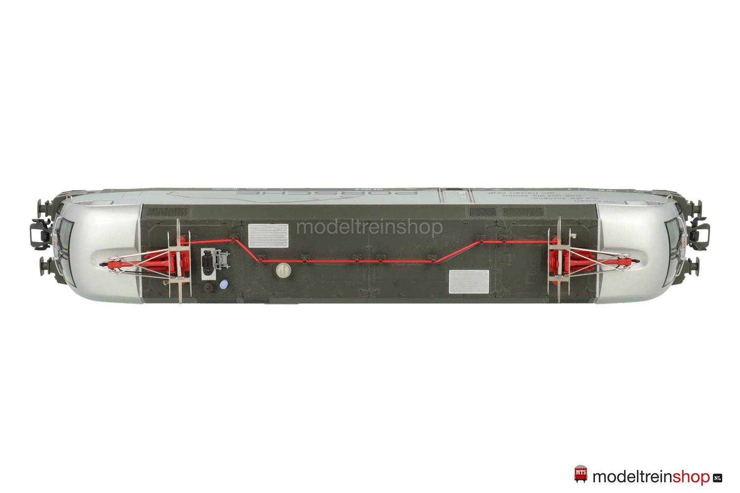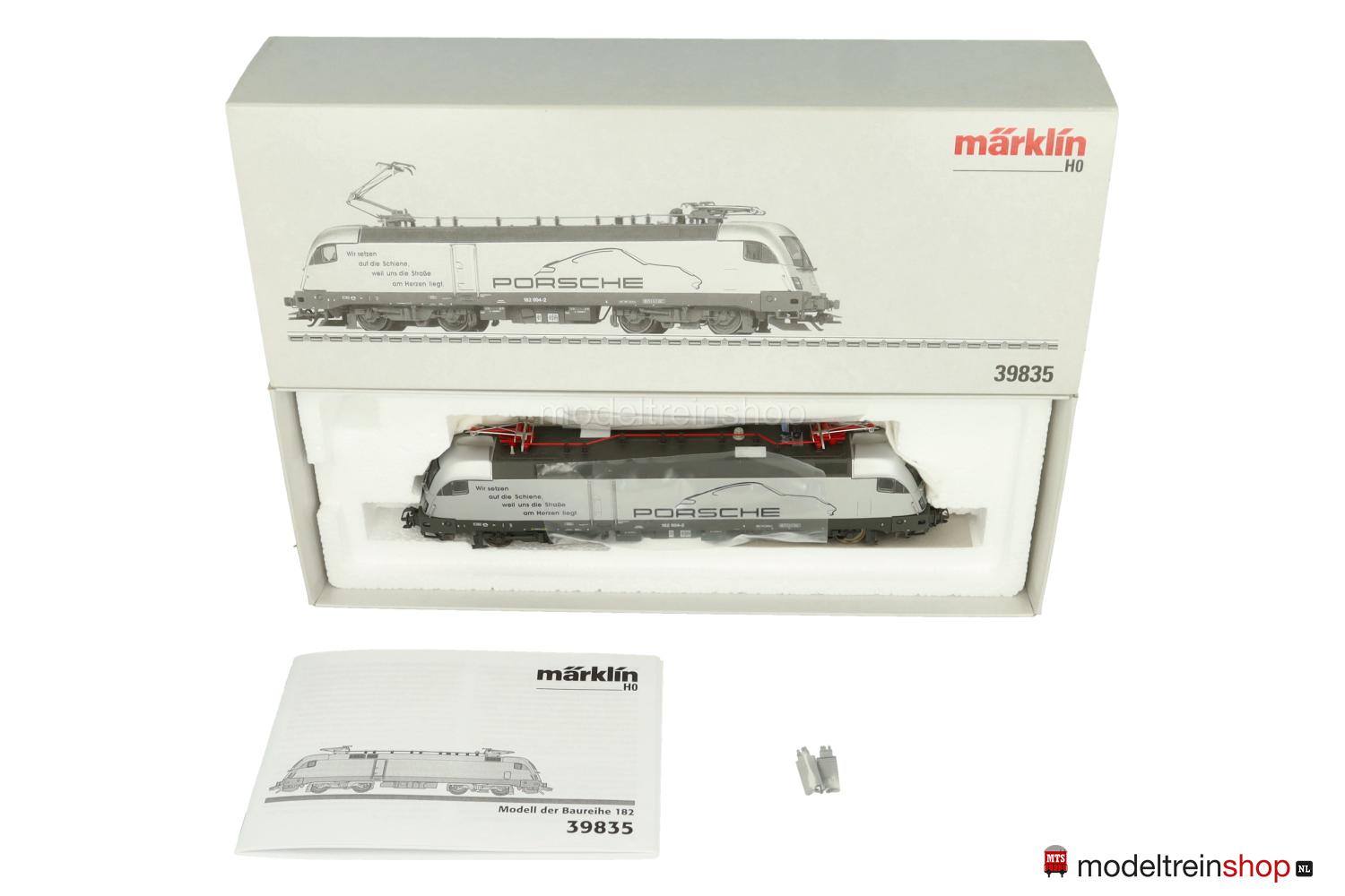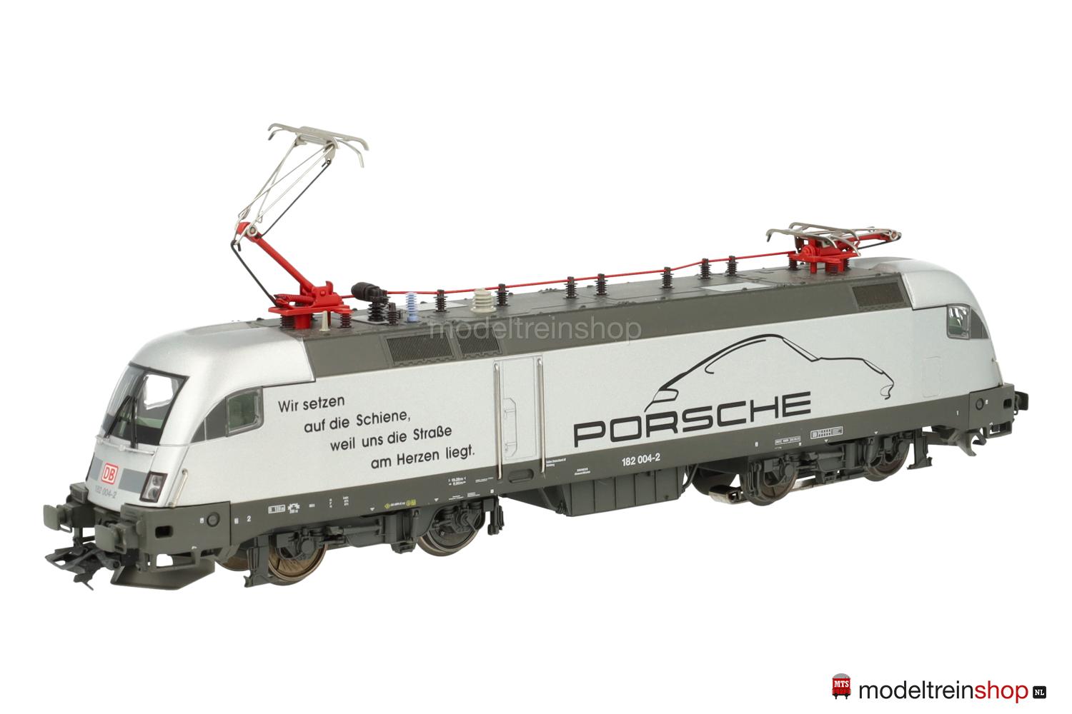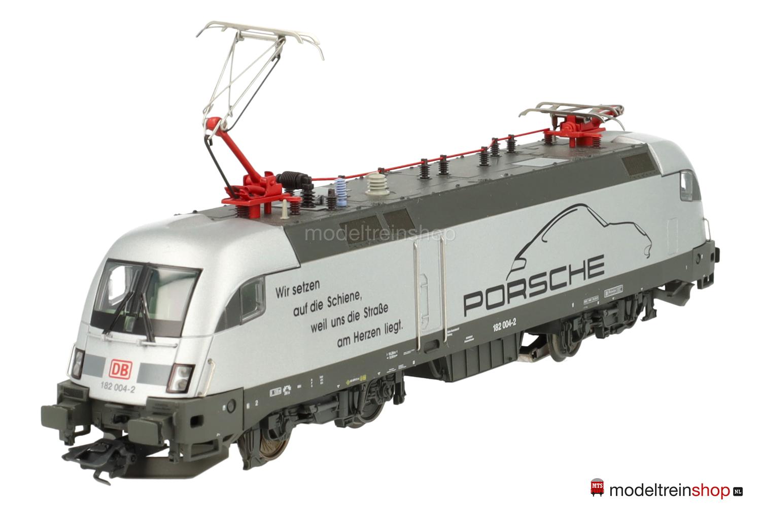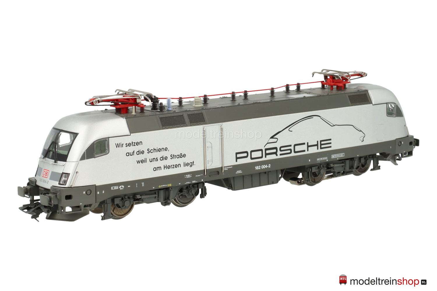 Achsfolge Bo’ Bo’. Anthrazitfarbenes Gußfahrgestell, ein angetriebenes Drehgestell, dunkelgraue Fahrwerke, C-Sinus-Motor. Silberfarbenes Gußgehäuse, dunkelgrauer Rahmen mit weißen Aufschriften, dunkelgraues Dach, filigrane Dachaufbauten. Führerstände mit Inneneinrichtung, eingesetzte Fenster mit schwarzen Rahmen, angesetzte Griffstangen und Handgriffe aus Metall. Betriebs-Nr.: 182 004-2, weiße Aufschriften, schwarze Schriftzüge “Wir setzen auf die Schiene, weil uns die Straße am Herzen liegt.” und “Porsche”, schwarze Silhouette eines Porsches. Mfx-Decoder, Geräuschmodul, beidseitig Dreilicht-Spitzensignal und zwei integrierte Schlußlichter, Lichtwechsel (weiß/rot) bei Fahrtrichtungsänderung. Spitzensignal, Schlußlichter, Fernscheinwerfer, Signalhorn sowie Anfahrbeschleunigung und Bremsverzögerung digital schaltbar. Weitere Zusatzfunktionen digital schaltbar.