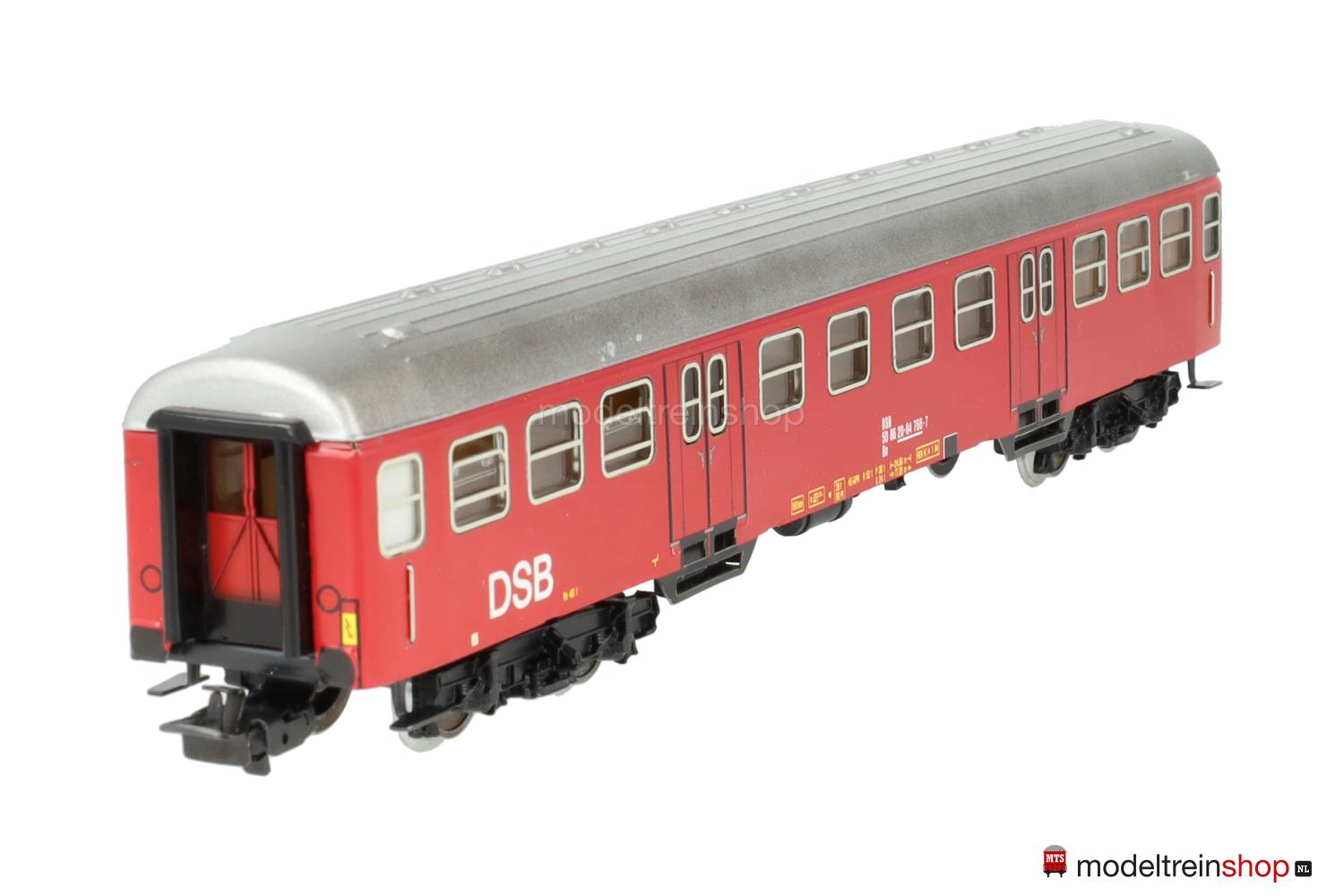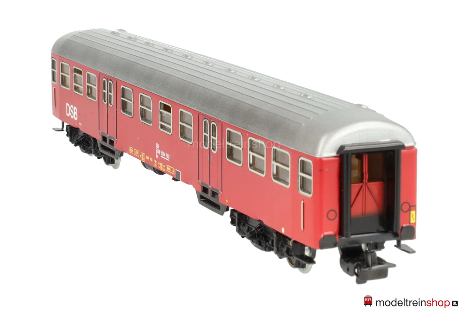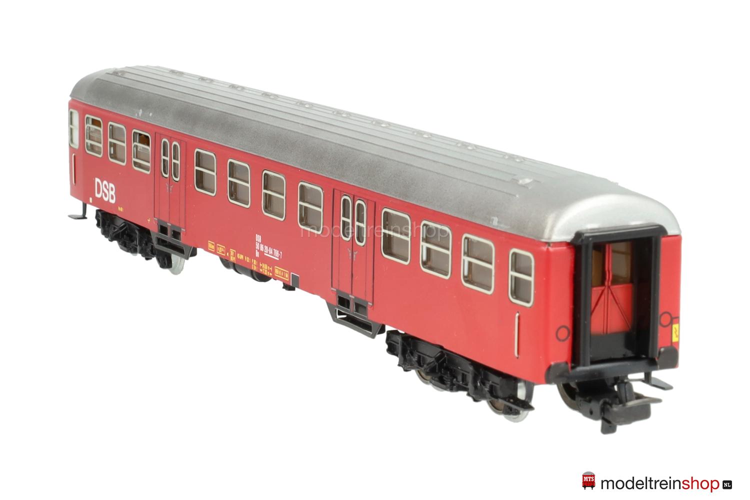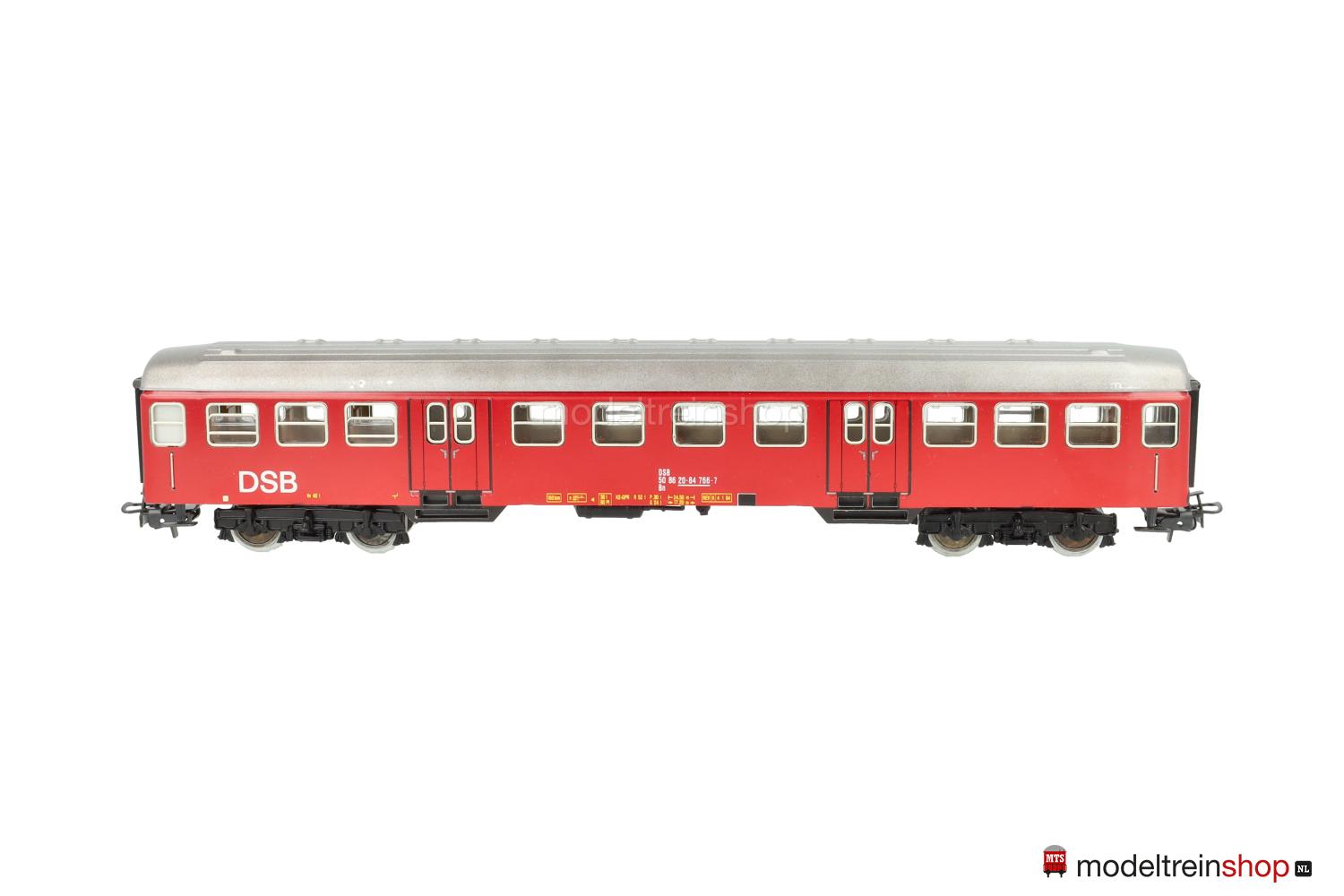 Schwarzes Blech-Untergestell, Minden-Deutz- Drehgestelle (Typ 5-b). Blech-Aufbau: roter Wagenkasten, silbergraues und schattiertes Dach mit Längssicken, weiße und gelbe Aufschriften, Wagen-Nr.: 50 86 20-84 766-7, weiße DSB-Embleme, eingesetzte Fenster mit silbernen Rahmen, angesetzte Griffstangen und Trittstufen, Inneneinrichtung, Gummiwulstübergänge.
