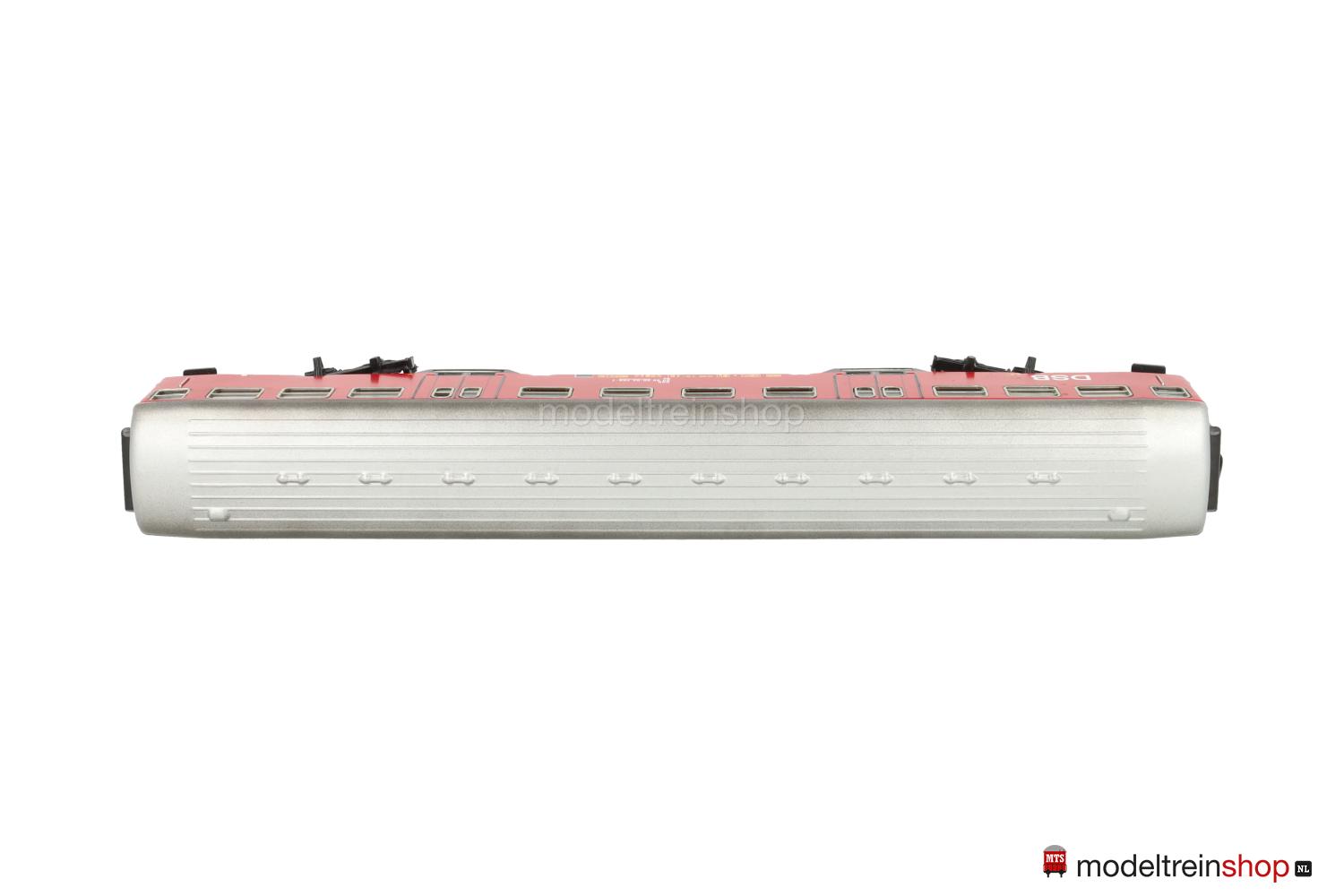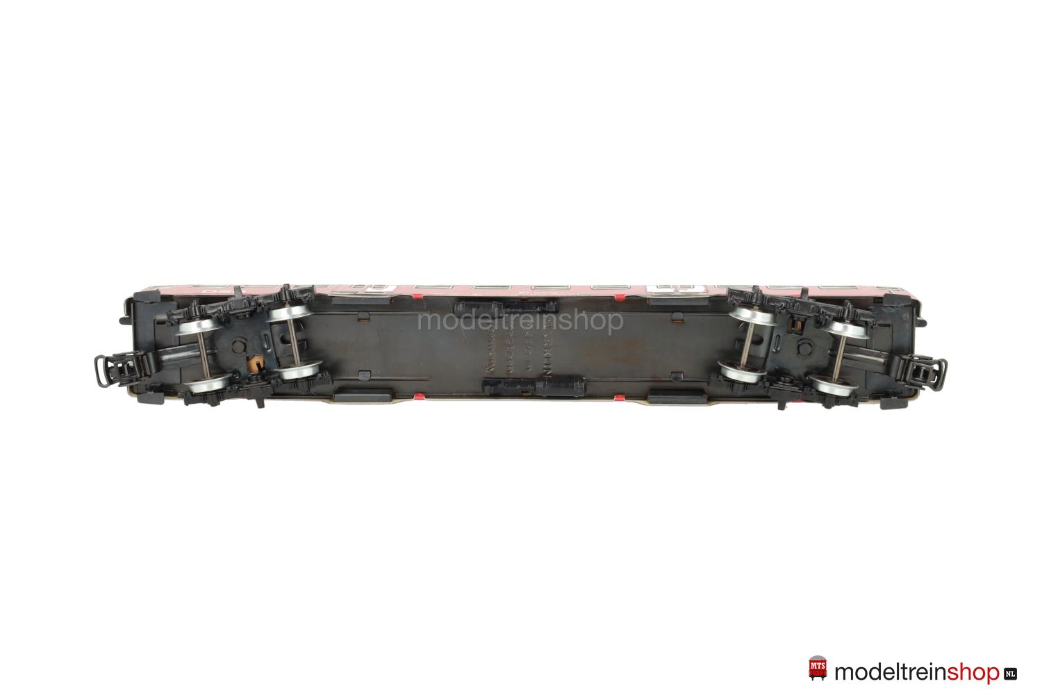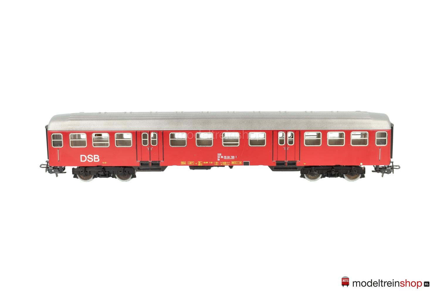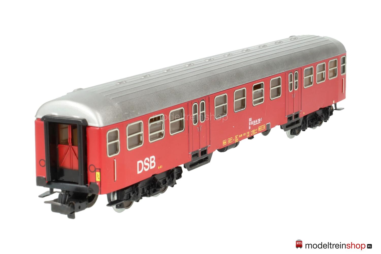 Schwarzes Blech-Untergestell, Minden-Deutz- Drehgestelle (Typ 5-b). Blech-Aufbau: roter Wagenkasten, silbergraues und schattiertes Dach mit Längssicken, weiße und gelbe Aufschriften, Wagen-Nr.: 50 86 20-84 766-7, weiße DSB-Embleme, eingesetzte Fenster mit silbernen Rahmen, angesetzte Griffstangen und Trittstufen, Inneneinrichtung, Gummiwulstübergänge.