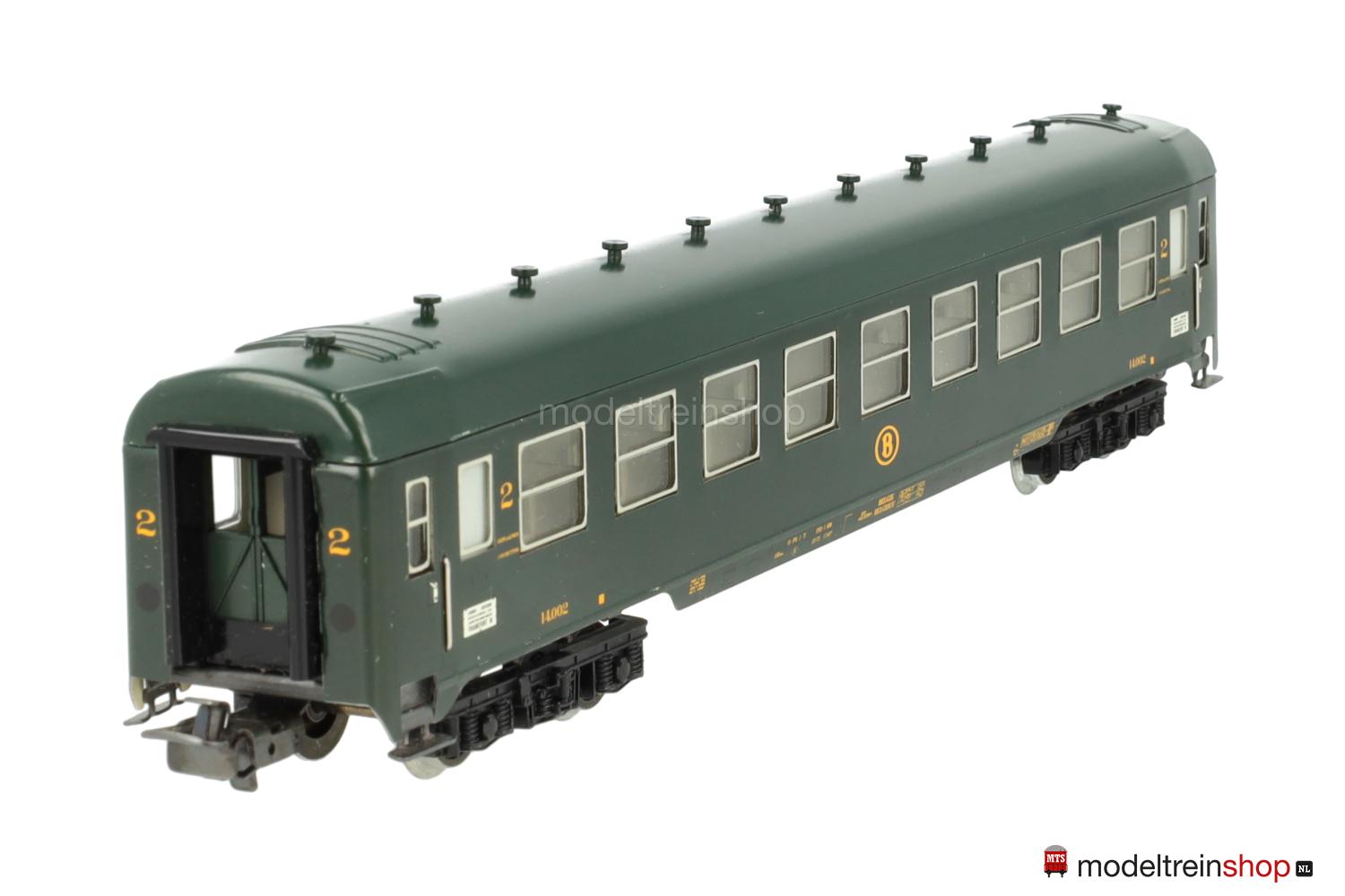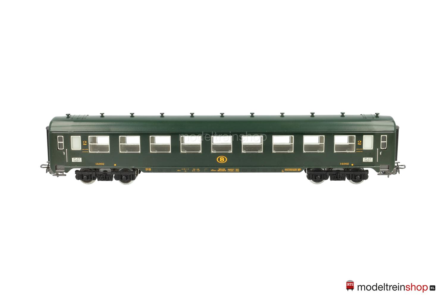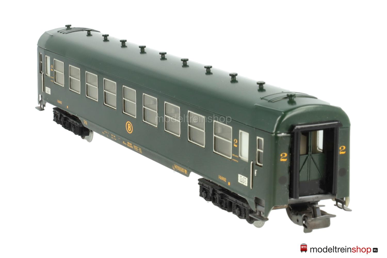 Schwarzes Blech-Untergestell. Blech-Aufbau: grüner Wagenkasten, elf aufgesteckte Dachlüfter. SNCB-Embleme, gelbe Aufschriften, Klassenkennzeichnung “2”, Zuglaufschilder mit Aufschrift: “LONDON – FRANKFURT/M”, eingesetzte Fenster mit silbernen Rahmen, angesetzte Griffstangen, Gummiwulstübergänge.