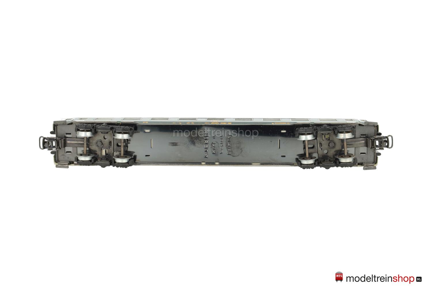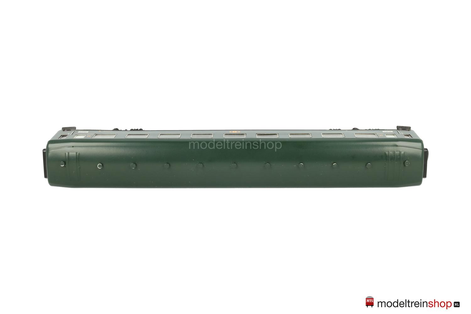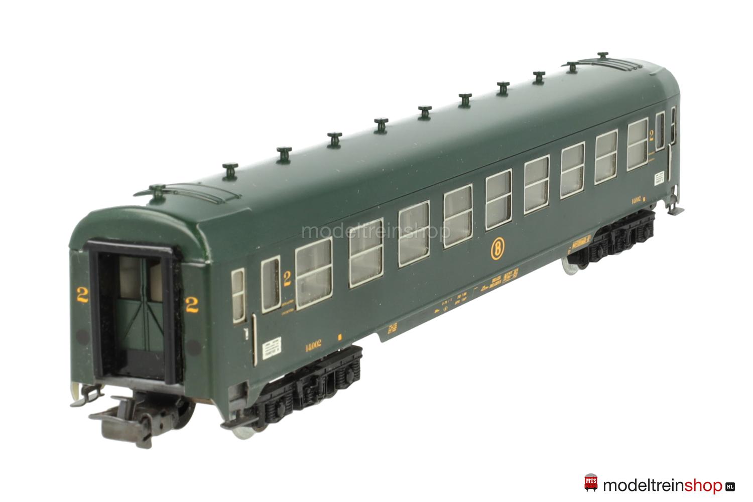 Schwarzes Blech-Untergestell. Blech-Aufbau: grüner Wagenkasten, elf aufgesteckte Dachlüfter. SNCB-Embleme, gelbe Aufschriften, Klassenkennzeichnung “2”, Zuglaufschilder mit Aufschrift: “LONDON – FRANKFURT/M”, eingesetzte Fenster mit silbernen Rahmen, angesetzte Griffstangen, Gummiwulstübergänge.