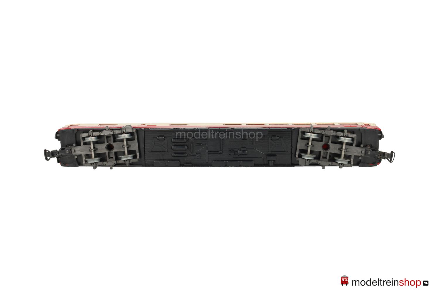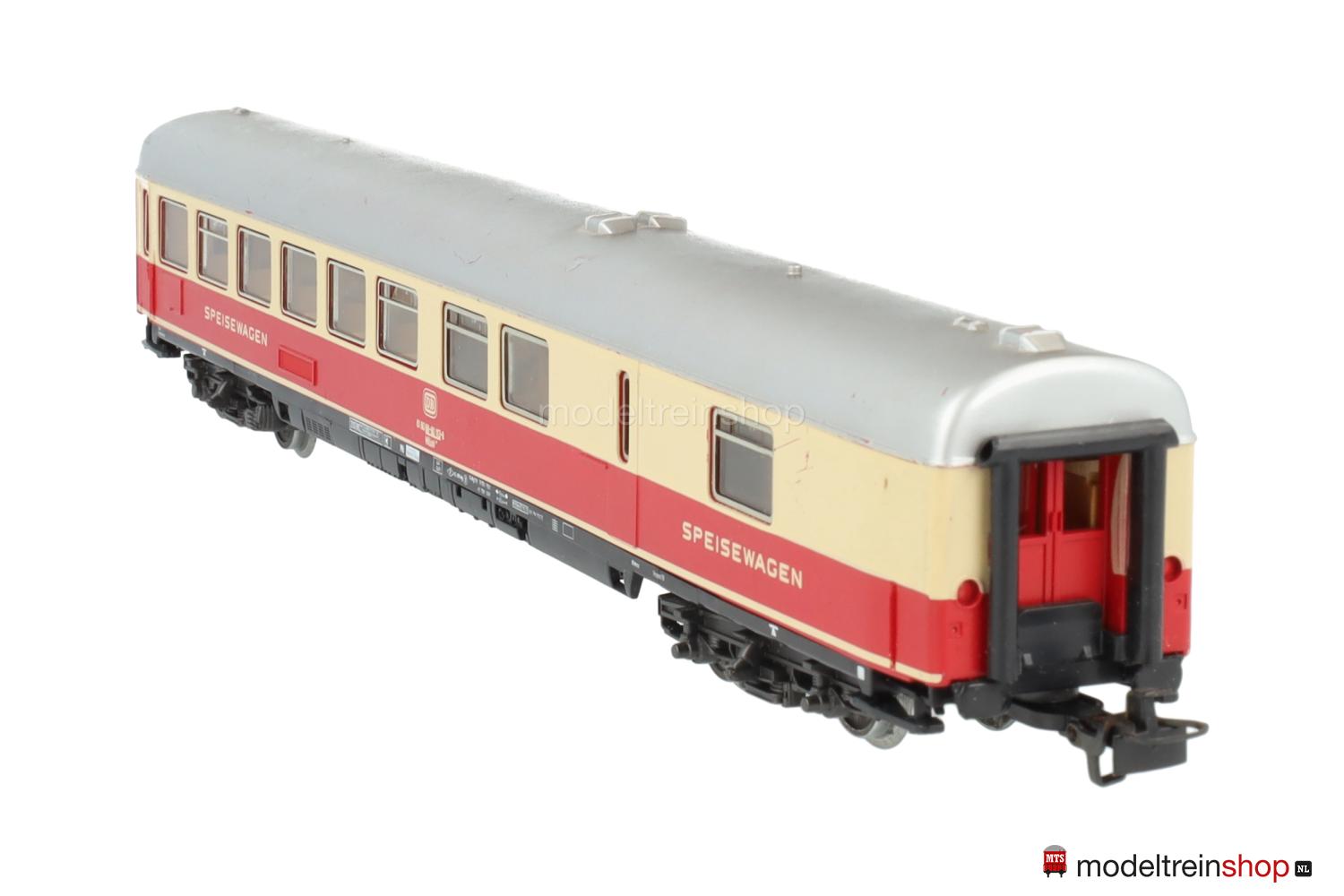 Kunststoff-Untergestell, Minden-Deutz-Drehgestelle, weiße Rahmenbeschriftung. Kunststoff-Aufbau: rot/beigefarbener Wagenkasten, silberfarbenes und schattiertes Dach, beigefarbene DB-Embleme und Aufschriften, Wagen-Nr.: 61 80 88-80 113-8, beigefarbene Schriftzüge “SPEISEWAGEN”, Zuglaufschilder als Schiebebilder-Satz (Nr.30628) beigelegt, eingesetzte Fenster mit silbernen Rahmen, Inneneinrichtung, Gummiwulstübergänge.