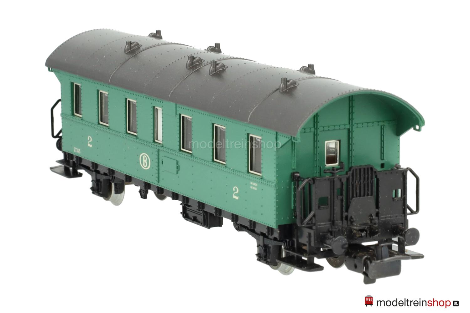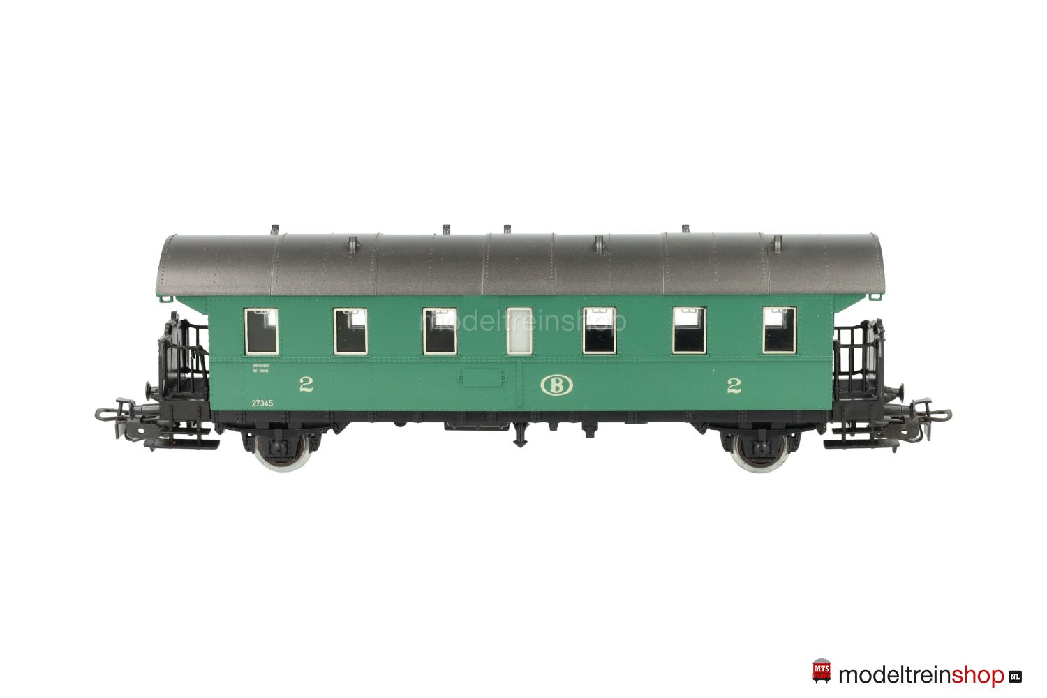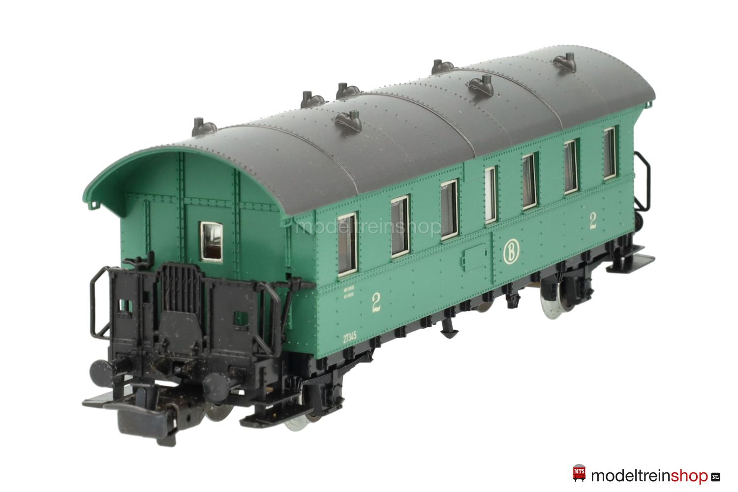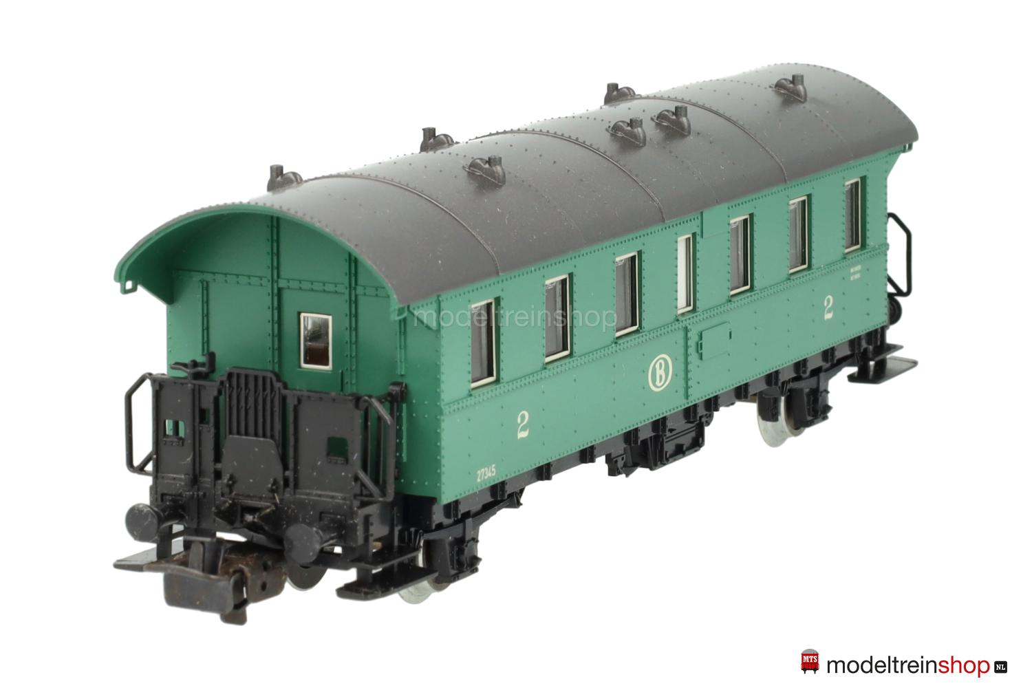 Schwarzes Kunststoff-Untergestell. Kunststoff-Aufbau: kieferngrüner Wagenkasten, anthrazitfarbenes Dach mit Wendler-Lüftern, gelbe SNCB-Embleme und Aufschriften, Wagen-Nr.: 27345, Klassenkennzeichnung “2”, Zuglaufschilder als Schiebebilder-Satz (Nr.31399) beigelegt), Inneneinrichtung, eingesetzte Fenster mit silbernen Rahmen.