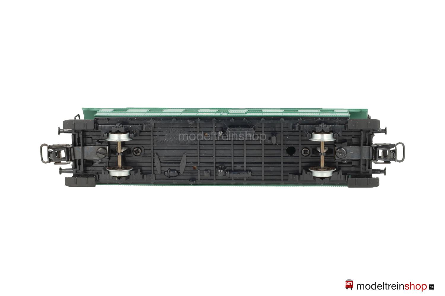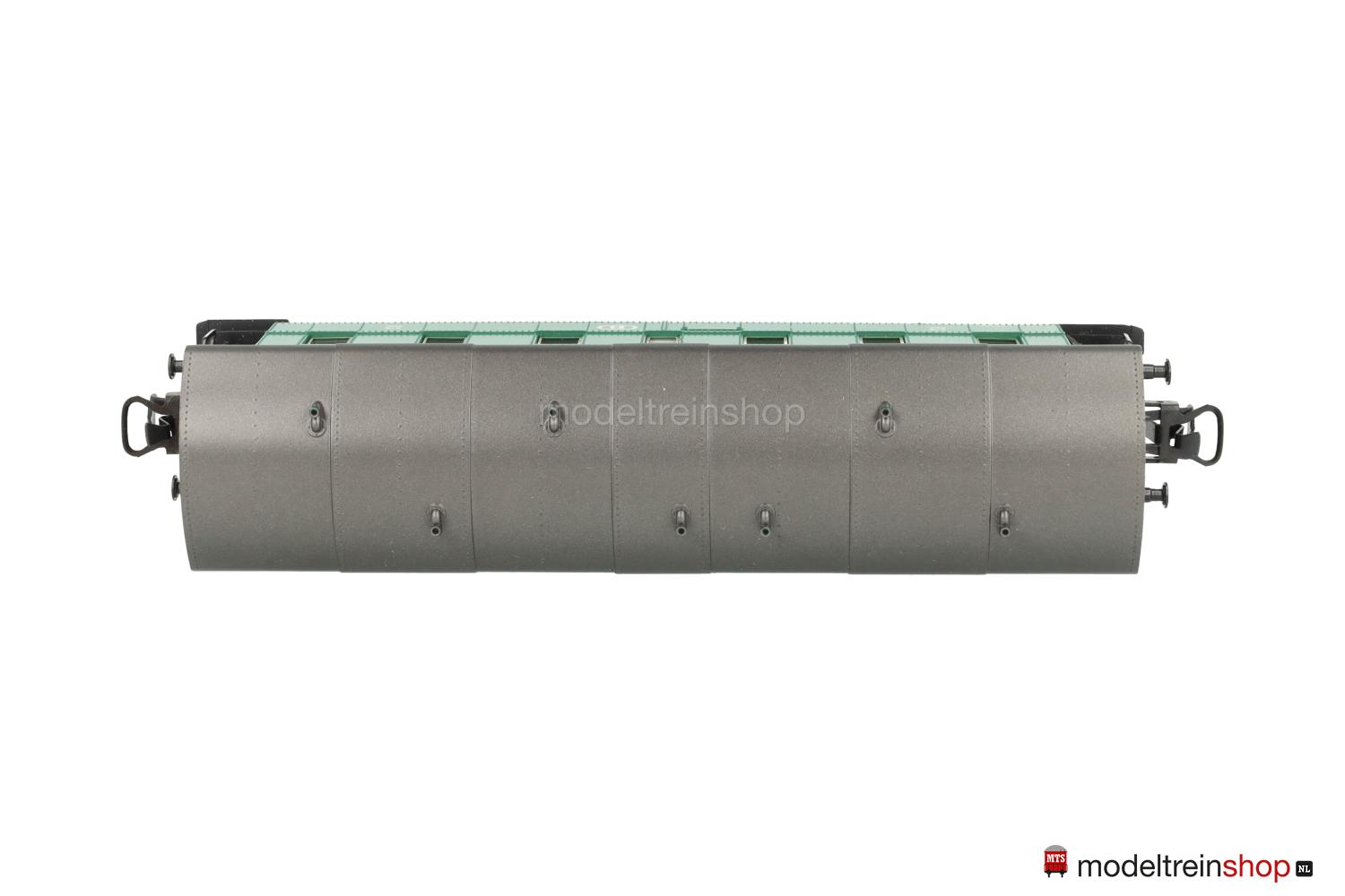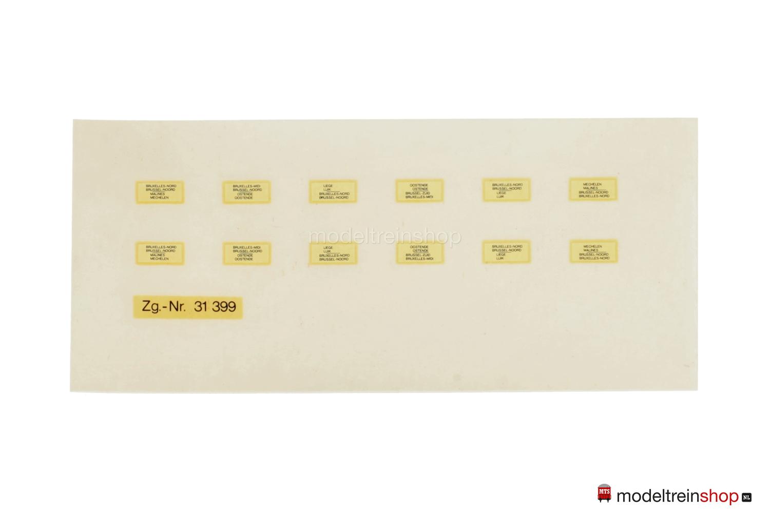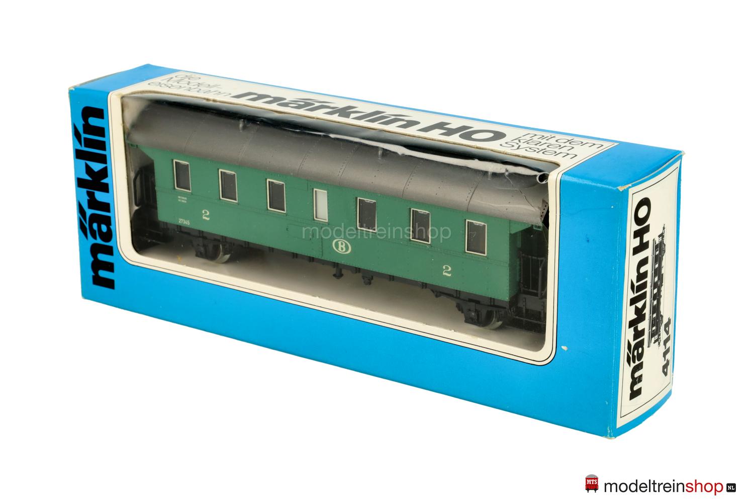 Schwarzes Kunststoff-Untergestell. Kunststoff-Aufbau: kieferngrüner Wagenkasten, anthrazitfarbenes Dach mit Wendler-Lüftern, gelbe SNCB-Embleme und Aufschriften, Wagen-Nr.: 27345, Klassenkennzeichnung “2”, Zuglaufschilder als Schiebebilder-Satz (Nr.31399) beigelegt), Inneneinrichtung, eingesetzte Fenster mit silbernen Rahmen.