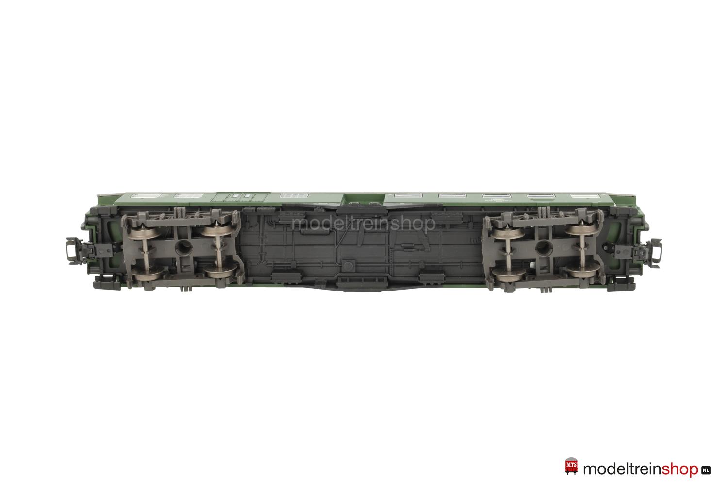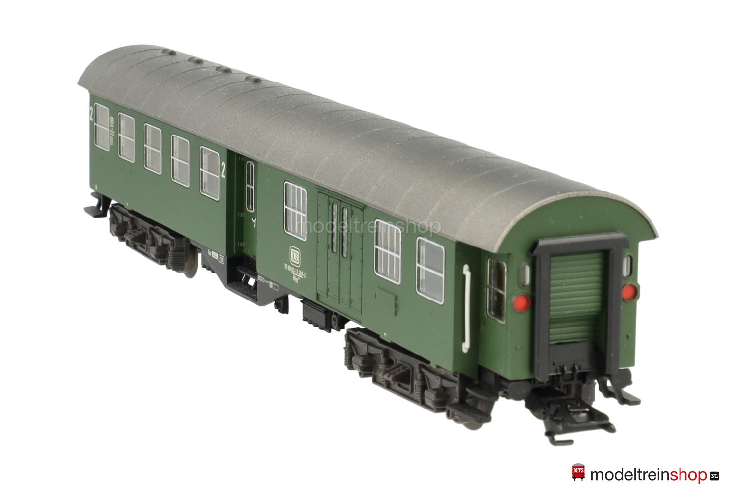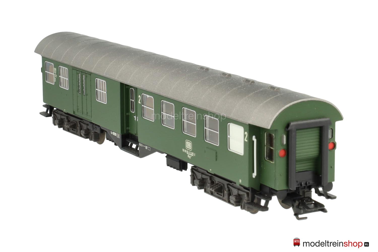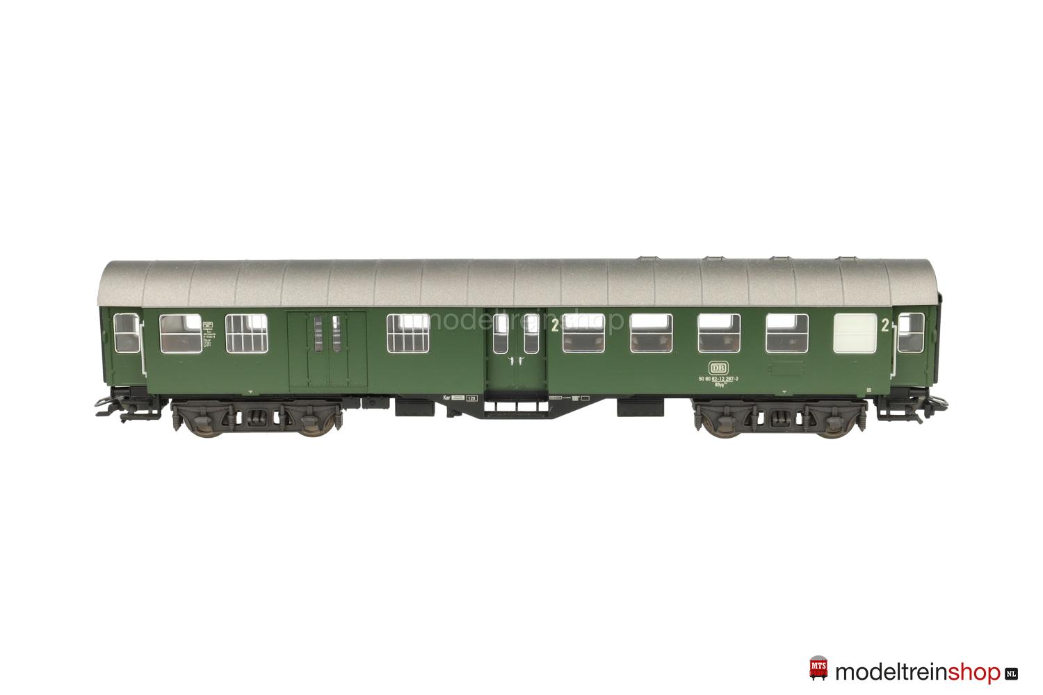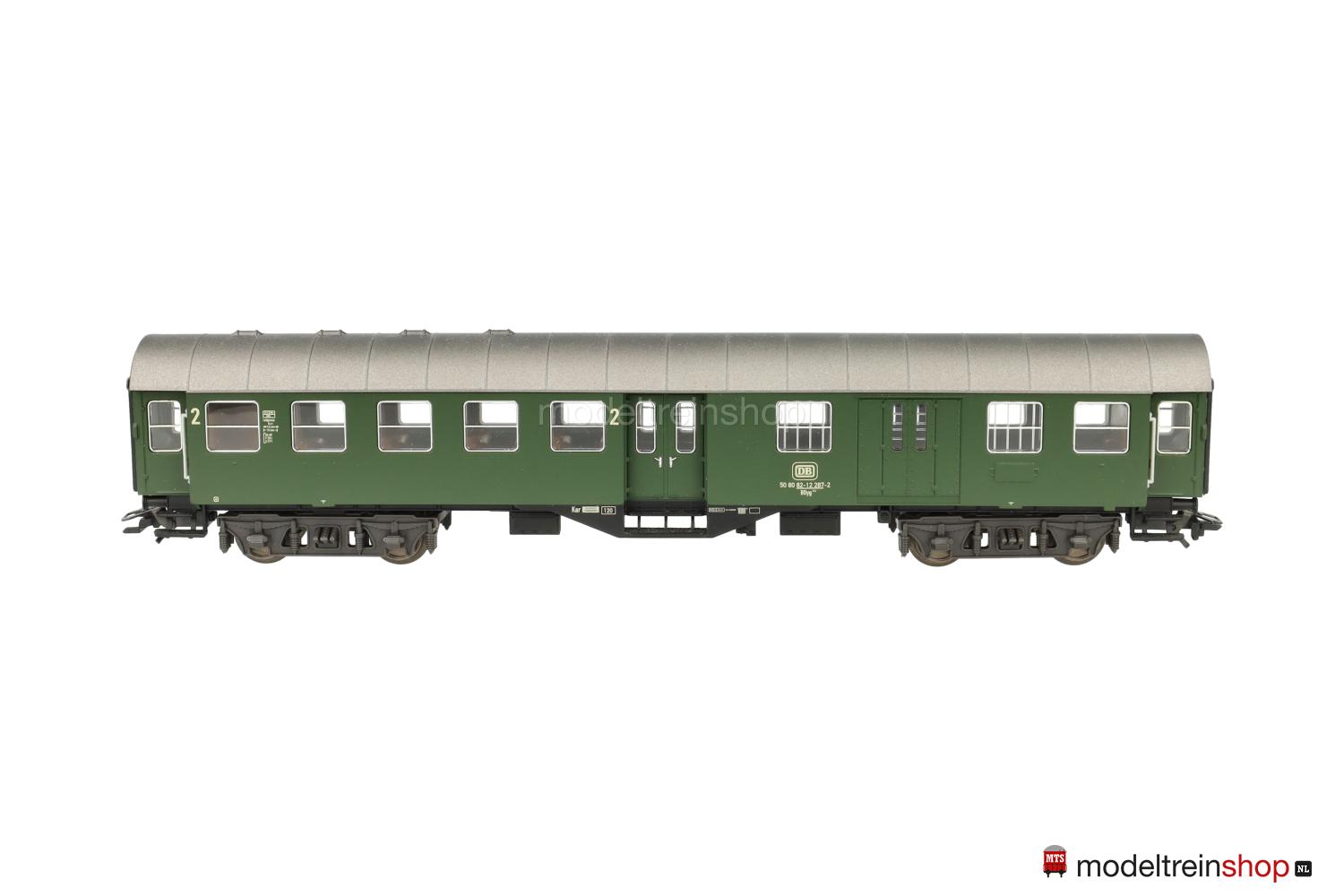 Kunststoff-Untergestell mit weißer Rahmenbeschriftung, KEPV-Regel-Drehgestelle (Typ 13-b). Kunststoff-Aufbau: grüner Wagenkasten, silbergrauer Dach, weiße DB-Embleme, weiße Aufschriften, Wagen-Nr.: 50 80 82-12 287-2, weiße Klassenkennzeichnung “2”, Zuglaufschilder als Schiebebilder-Satz (Nr.30924) beigelegt, eingesetzte Fenster mit silbernen Rahmen, angesetzte Griffstangen, Inneneinrichtung, Gummiwulstübergänge.