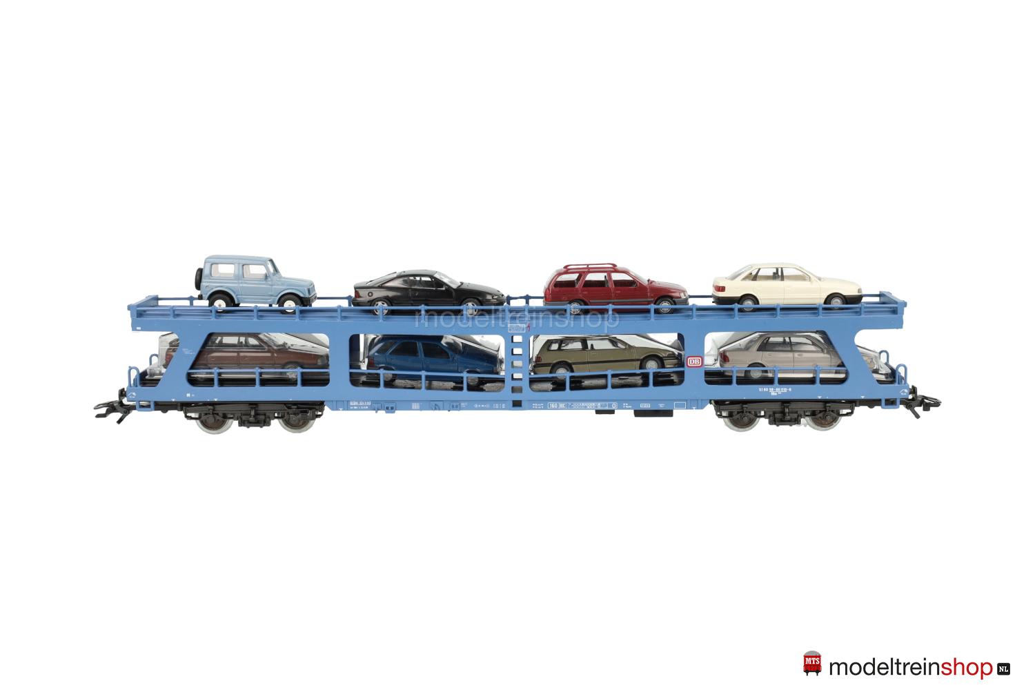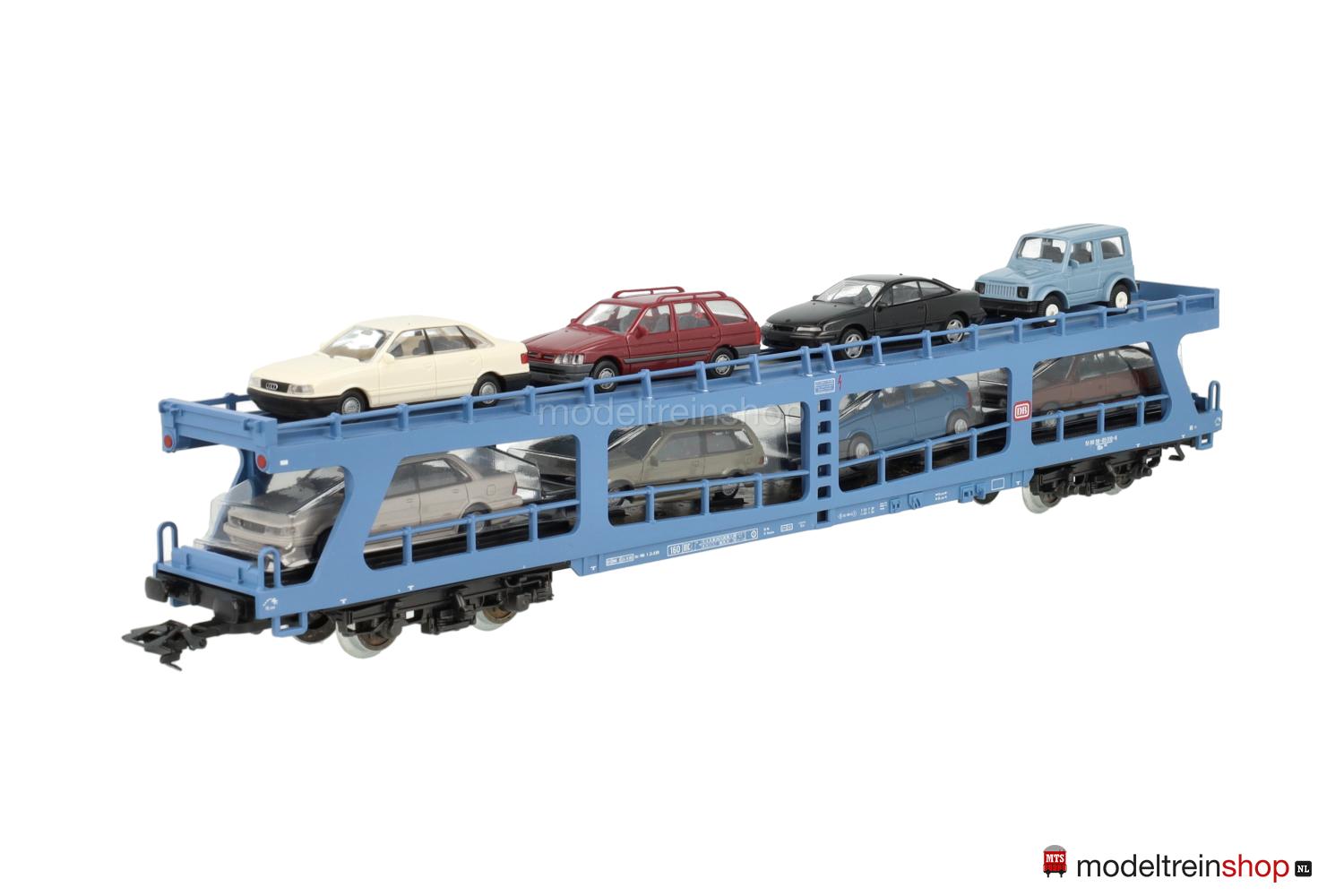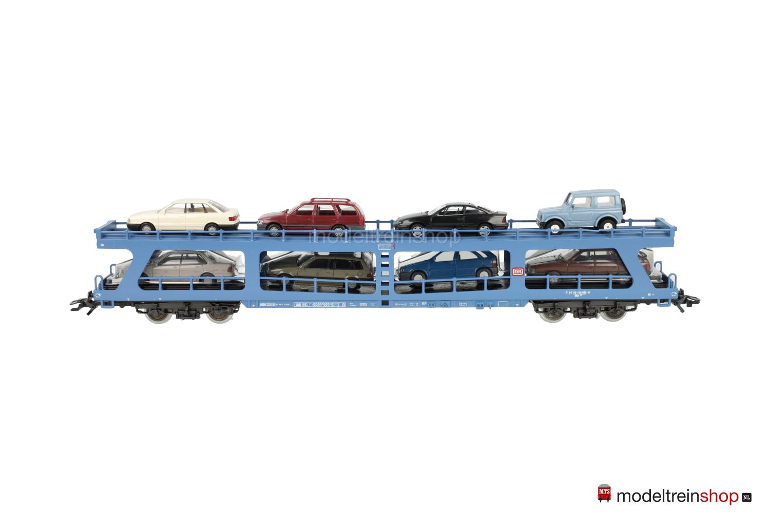 Schwarzes Kunststoff-Untergestell, Minden-Deutz- Drehgestelle (Typ 5-h). Hellblauer Kunststoff-Aufbau, untere Ladefläche schwarz, obere Ladefläche hellblau mit weißen “Riffelblechen”, rote DB-Embleme, weiße Aufschriften, Wagen-Nr.: 51 80 98-80 010-6, beladen mit acht RIETZE- und HERPA-Autos*, Geländer an beiden Ladeflächen, schwarze Keile (anklebbar) zur Arretierung der Autos beigelegt.