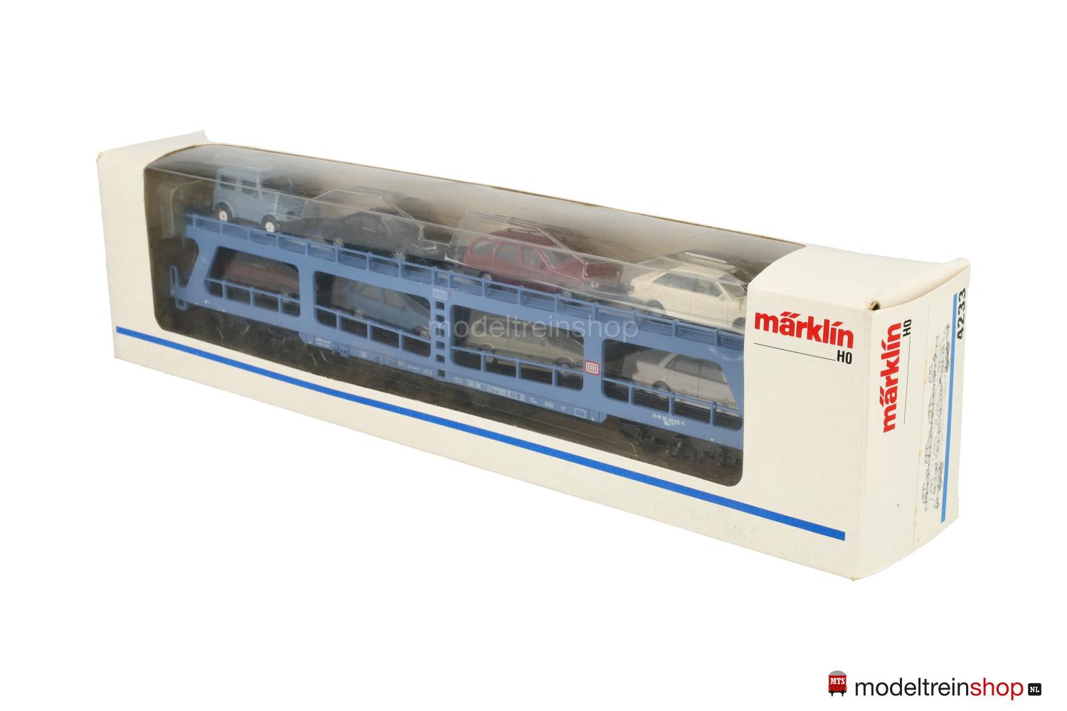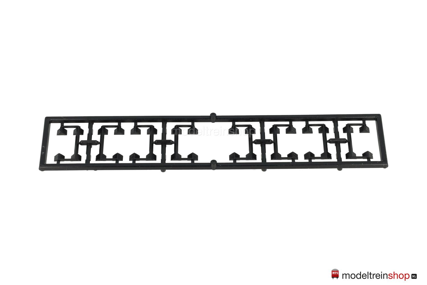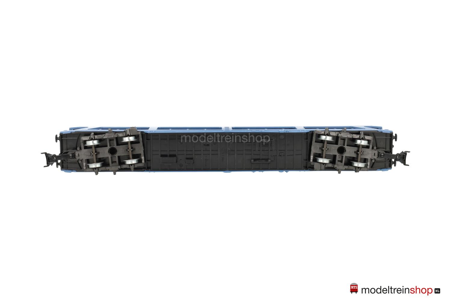 Schwarzes Kunststoff-Untergestell, Minden-Deutz- Drehgestelle (Typ 5-h). Hellblauer Kunststoff-Aufbau, untere Ladefläche schwarz, obere Ladefläche hellblau mit weißen “Riffelblechen”, rote DB-Embleme, weiße Aufschriften, Wagen-Nr.: 51 80 98-80 010-6, beladen mit acht RIETZE- und HERPA-Autos*, Geländer an beiden Ladeflächen, schwarze Keile (anklebbar) zur Arretierung der Autos beigelegt.