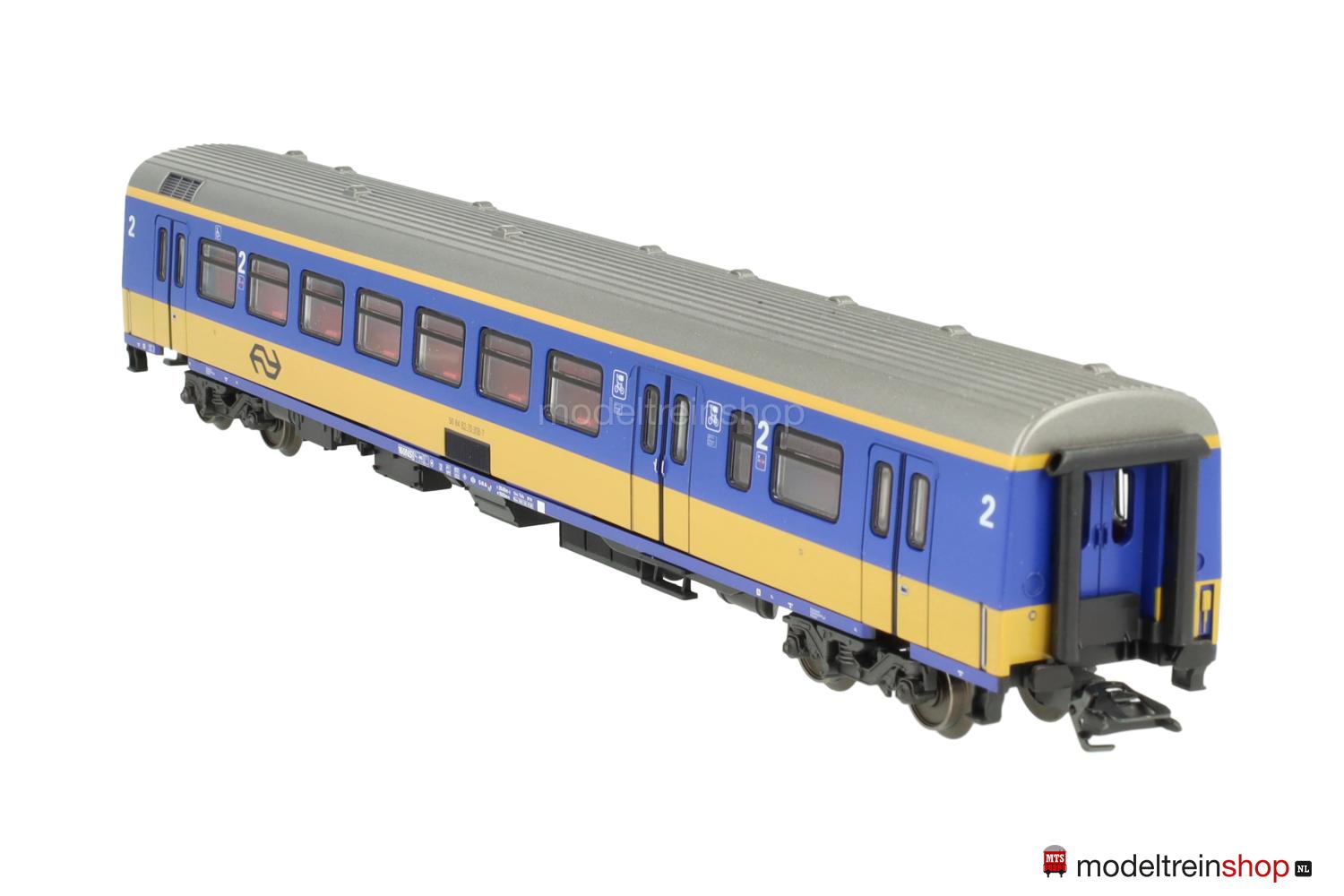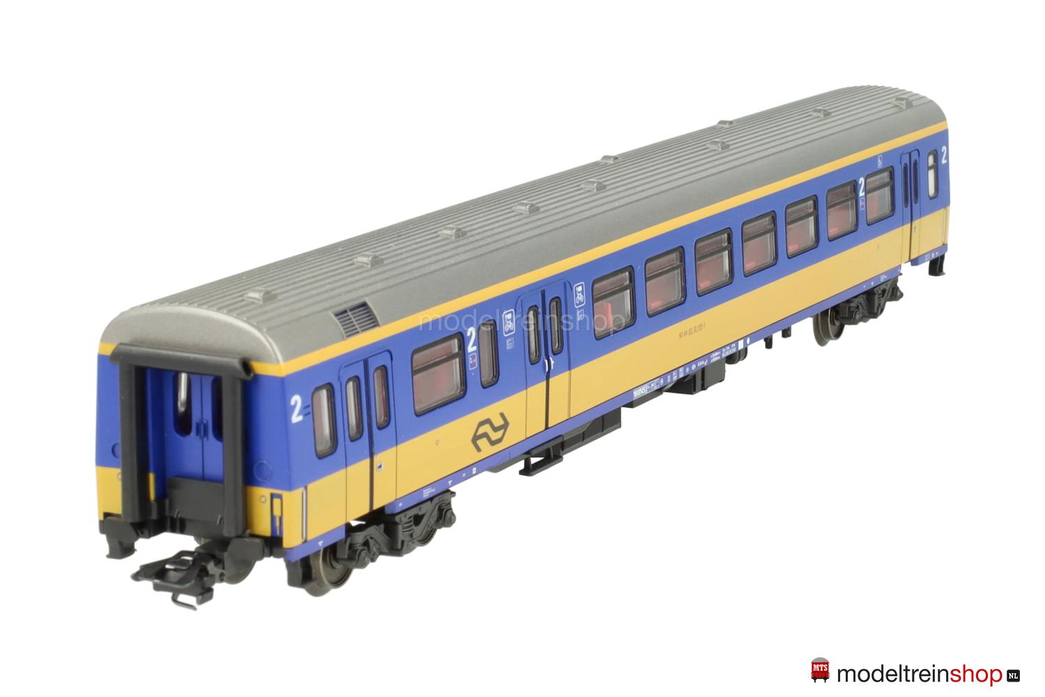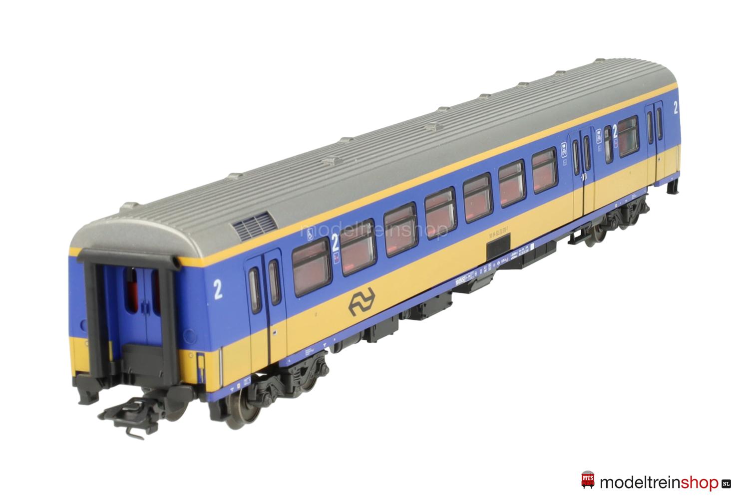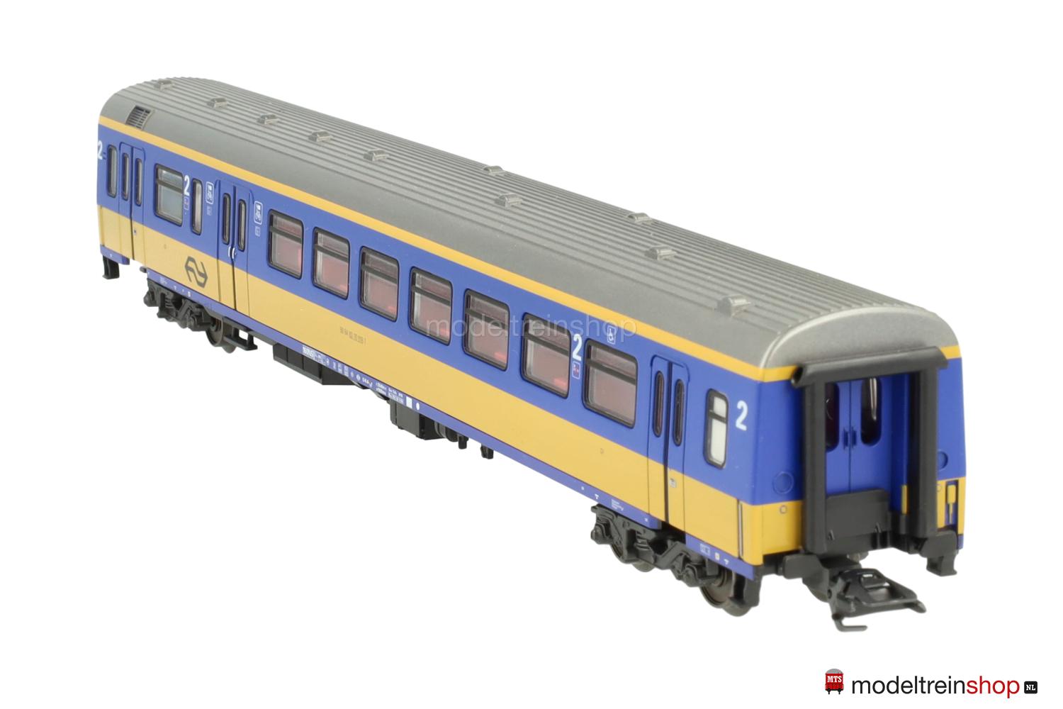 Schwarzes Kunststoff-Untergestell, Fiat-Drehgestelle (Typ 14-b). Kunststoff-Aufbau: blau/gelber Wagenkasten, blaue Wagenunterkanten mit weißen Aufschriften, silbergraues Dach mit Längsrippen, schwarze Aufschriften, Wagen-Nr.: 50 84 82-70 918-7, schwarze NS-Embleme, weiße Klassenkennzeichnung “2”, eingesetzte Fenster mit schwarzen Rahmen, Inneneinrichtung, Gummiwulstübergänge.